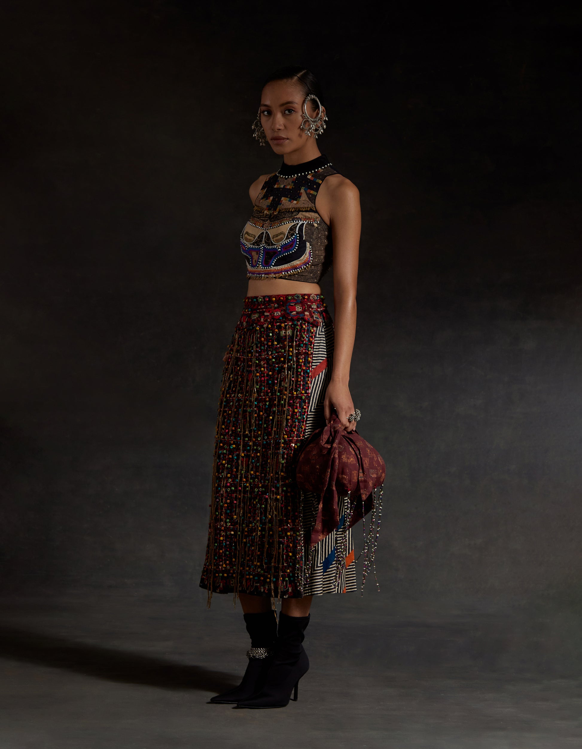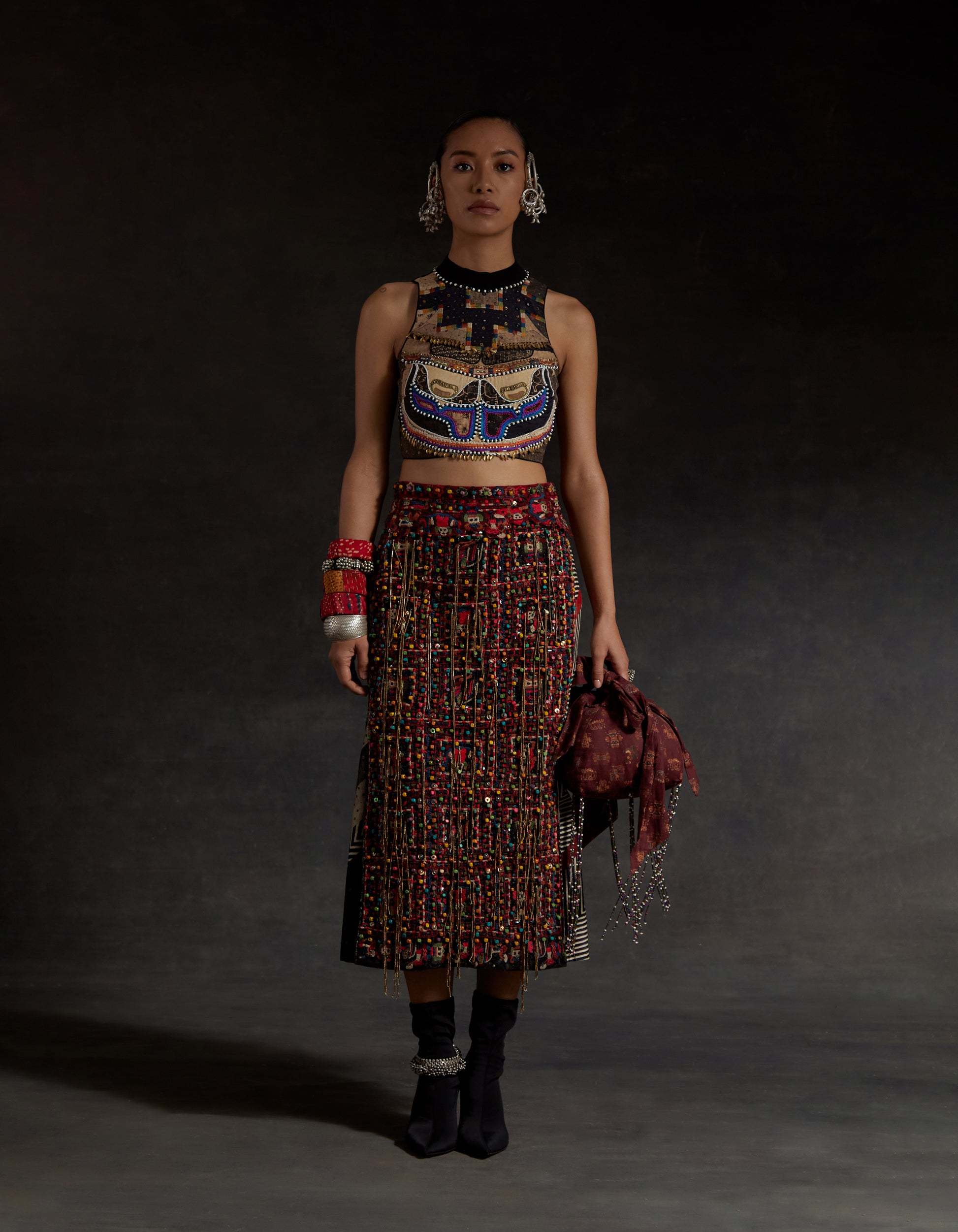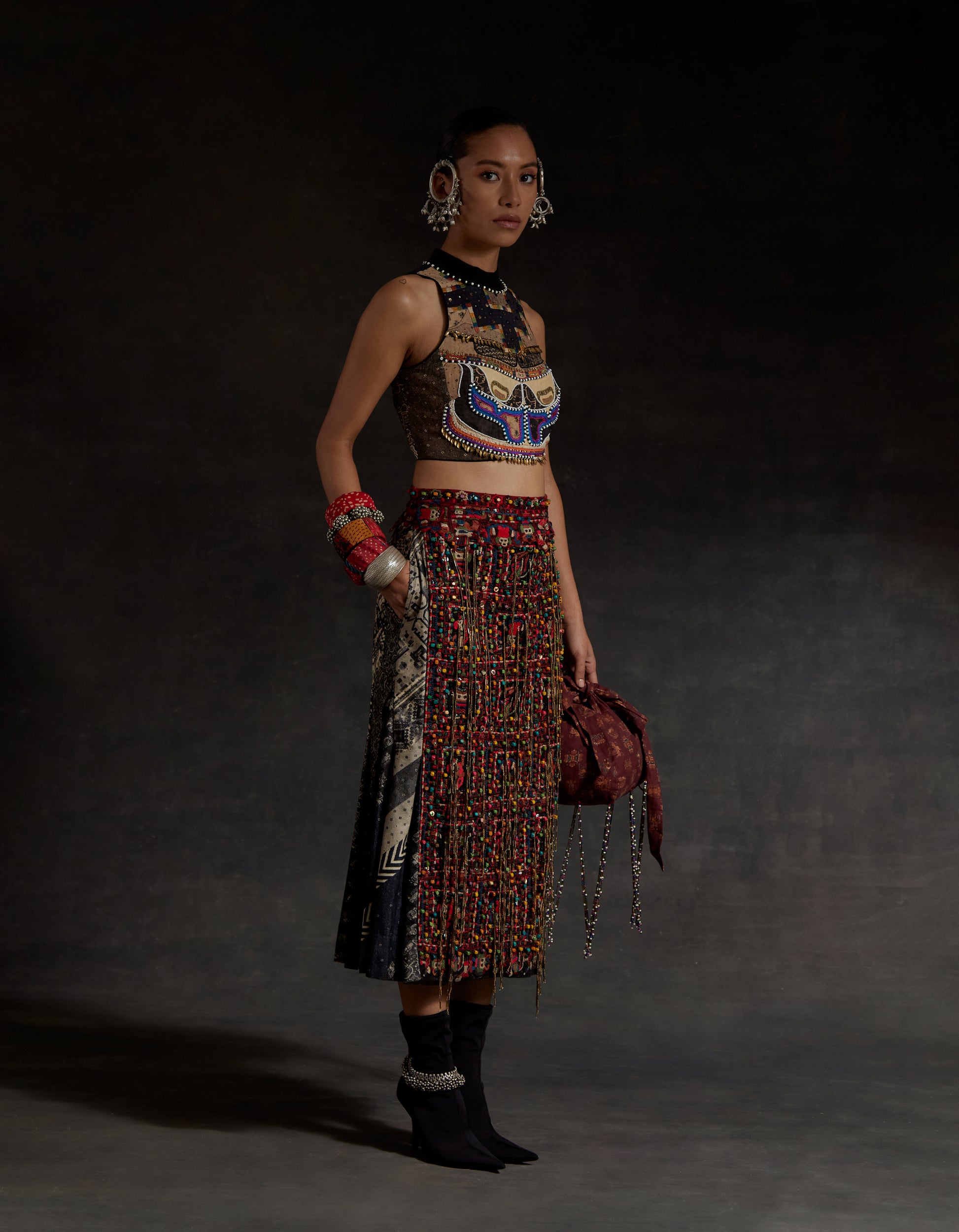 Highlight embroidered blouse with tassel detailing and zip at back. Bead work highlighting on blouse and resham thread work with beads on skirt along with tassel details.