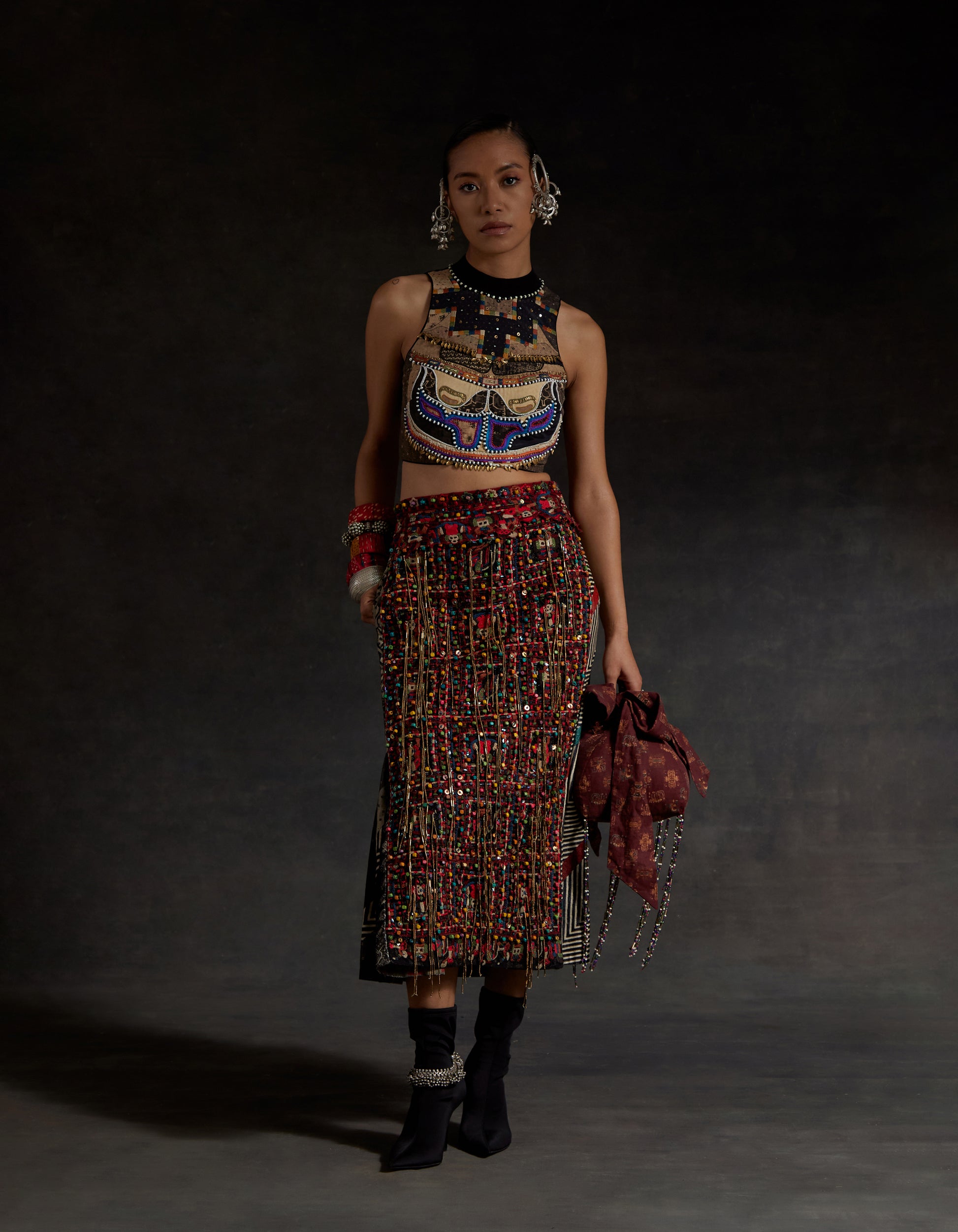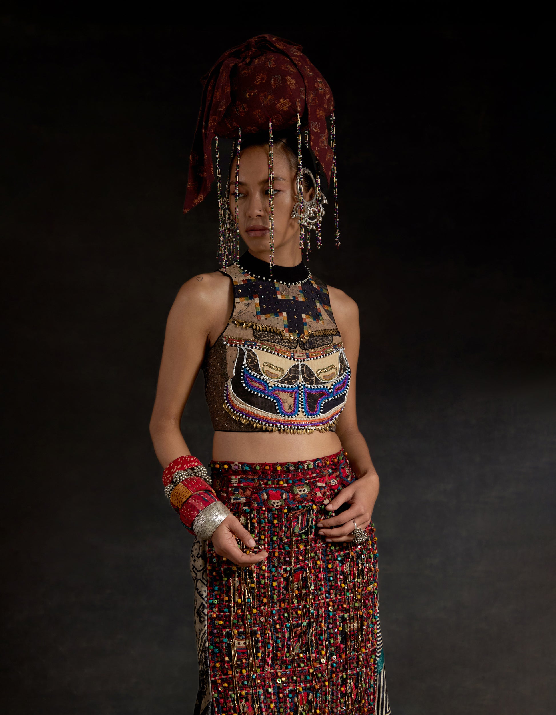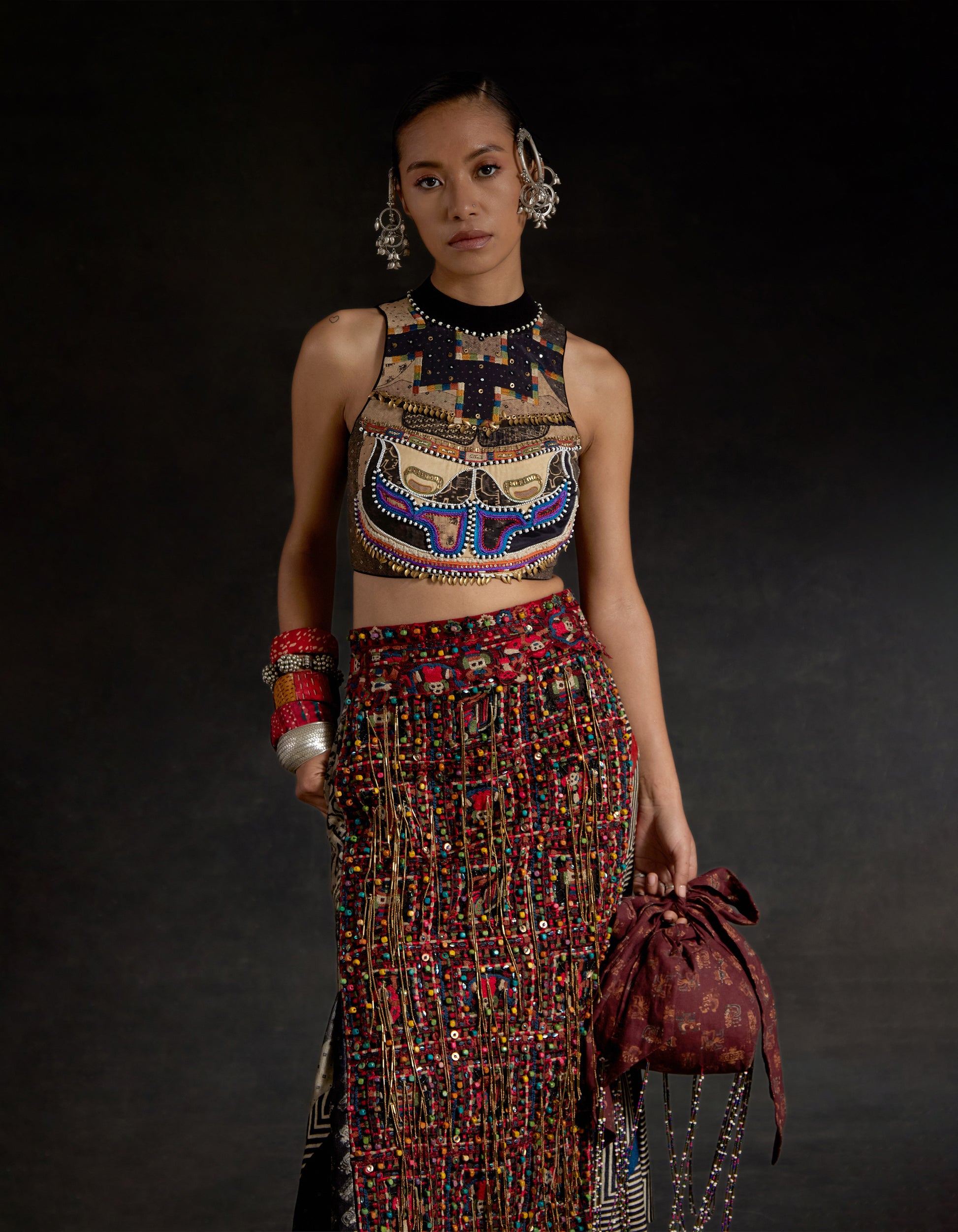 Highlight embroidered blouse with tassel detailing and zip at back. Bead work highlighting on blouse and resham thread work with beads on skirt along with tassel details.