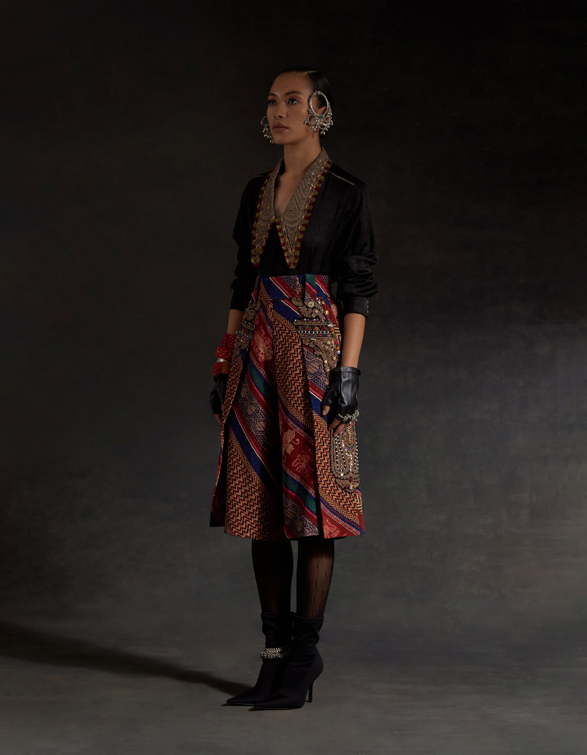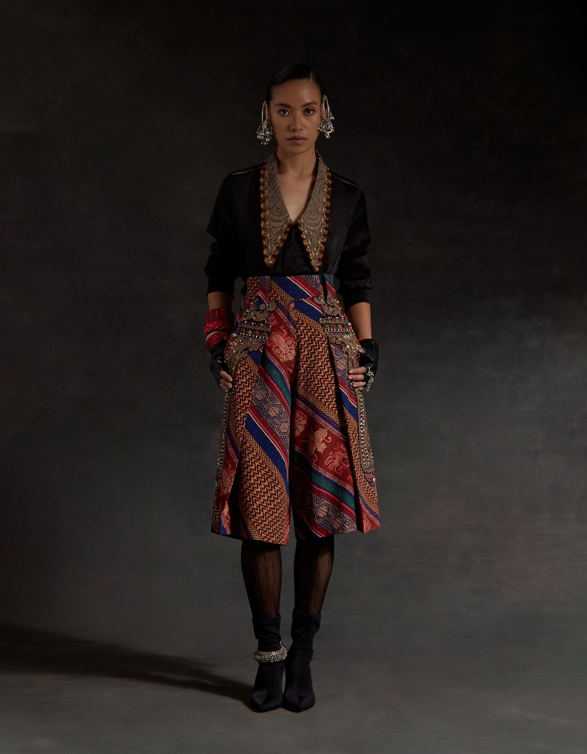 Textured solid colored shirt with embroidered long collar. Resham thread embroidered collar with zari work and thread tassel.