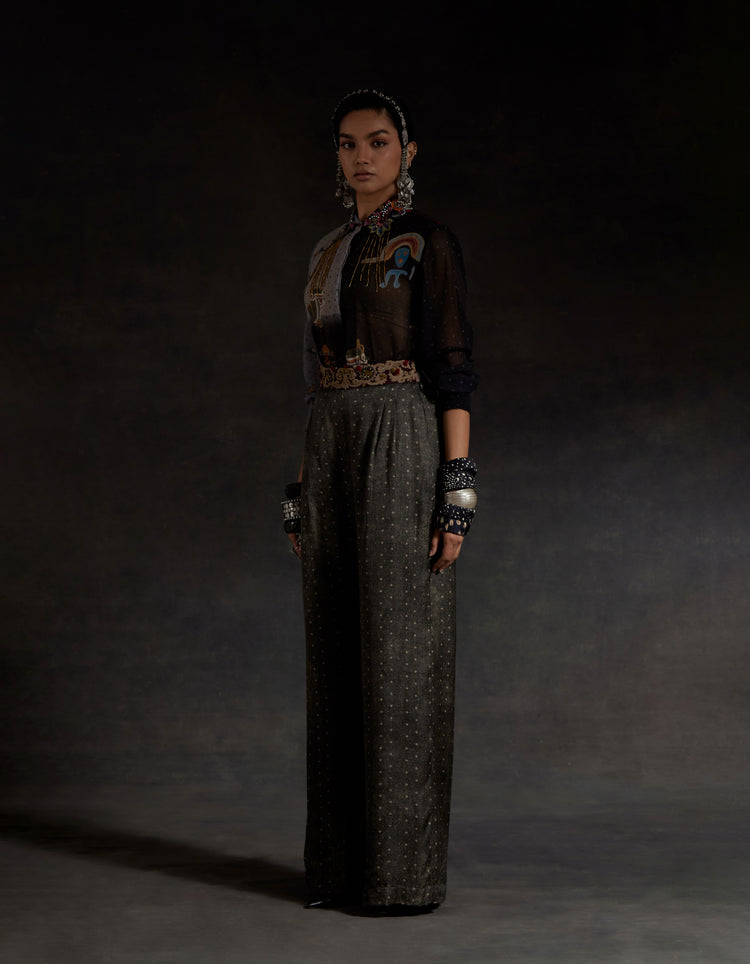 Printed Nazca Lines inspired motifs straight shirt with embroidered and tasseled collar detail and printed trouser. Resham thread embroidered collar with beads tassel hangings and embroidered trouser waistband.