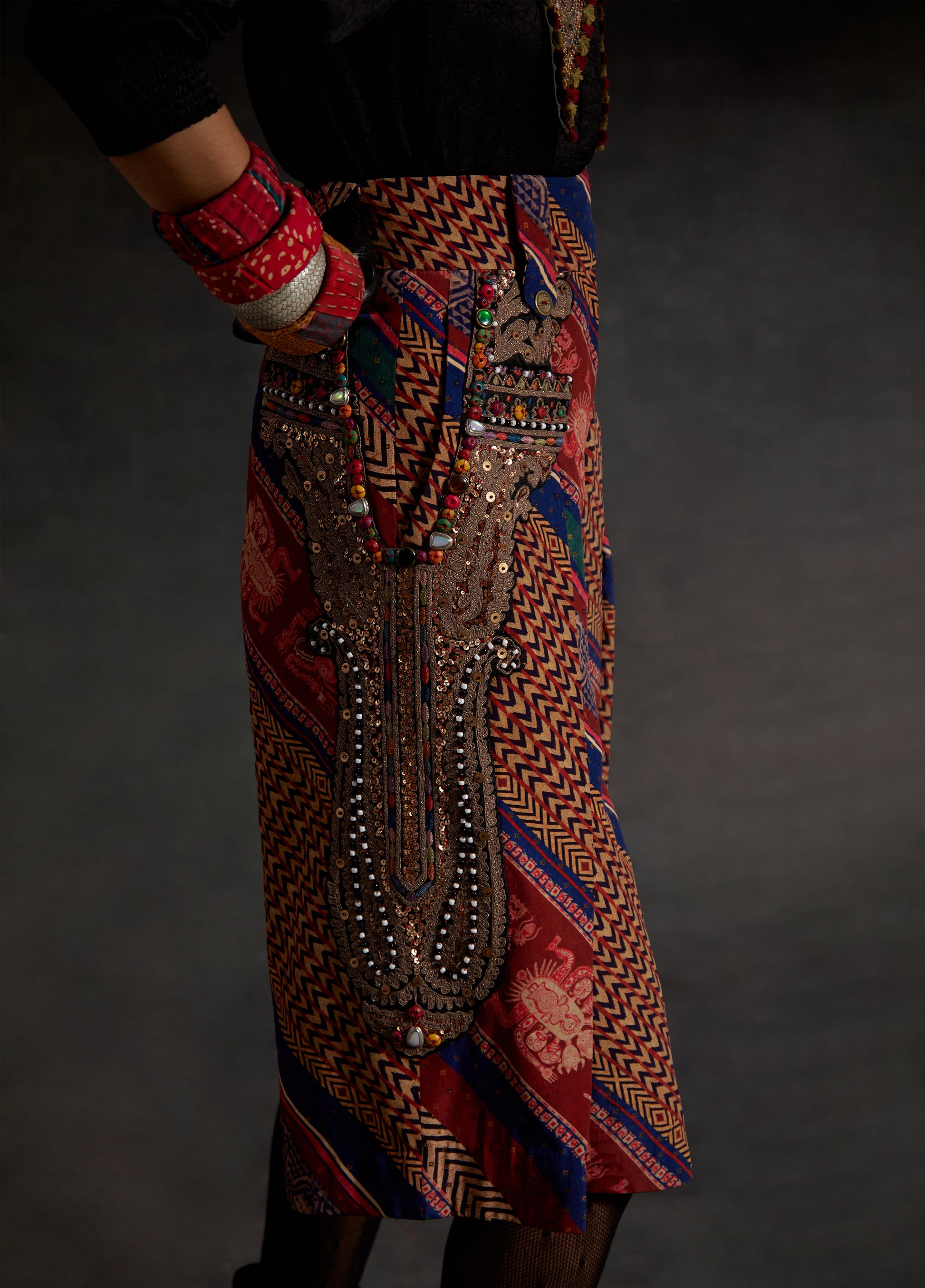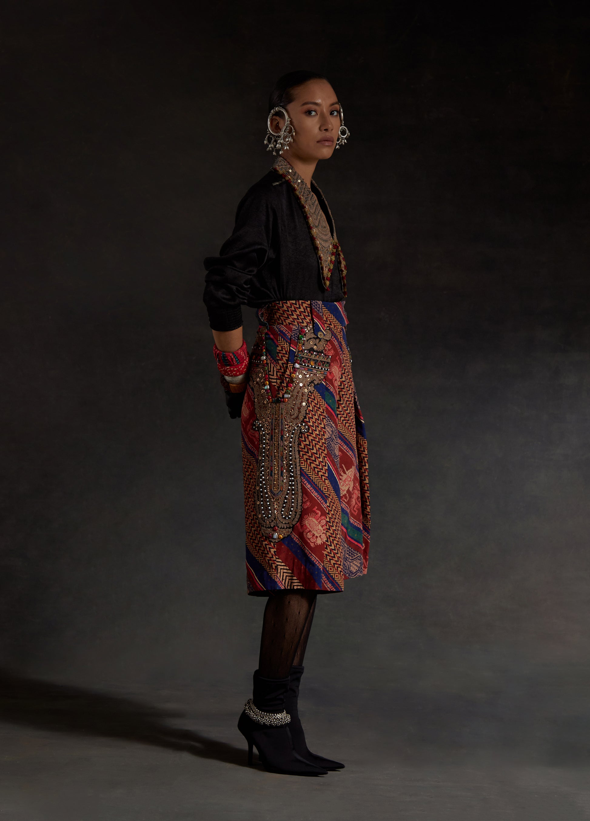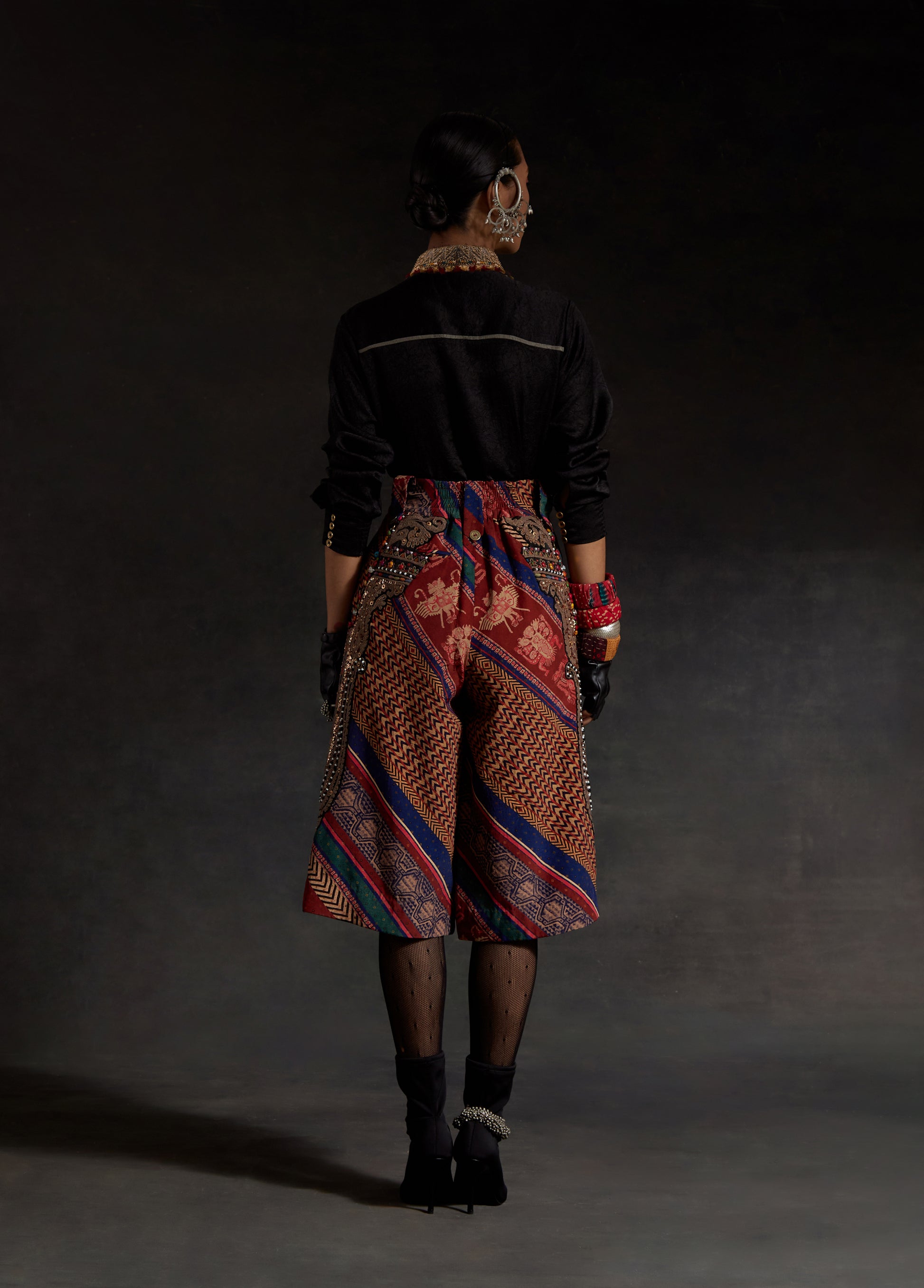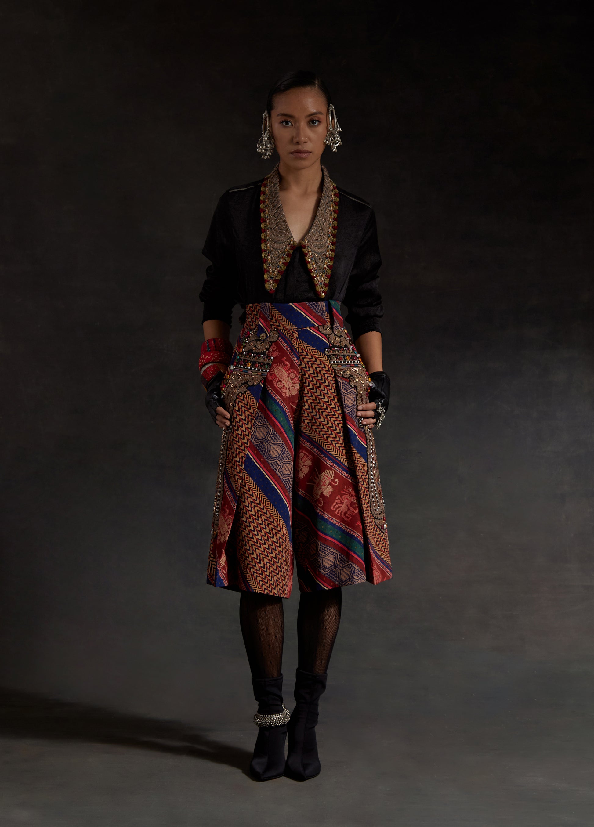 Textured solid colored shirt with inserts and long embroidered collar paired with a printed embroidered culotte shorts. Embroidered collar with marori work and zari embroidery on shorts with bead and tassel details.
