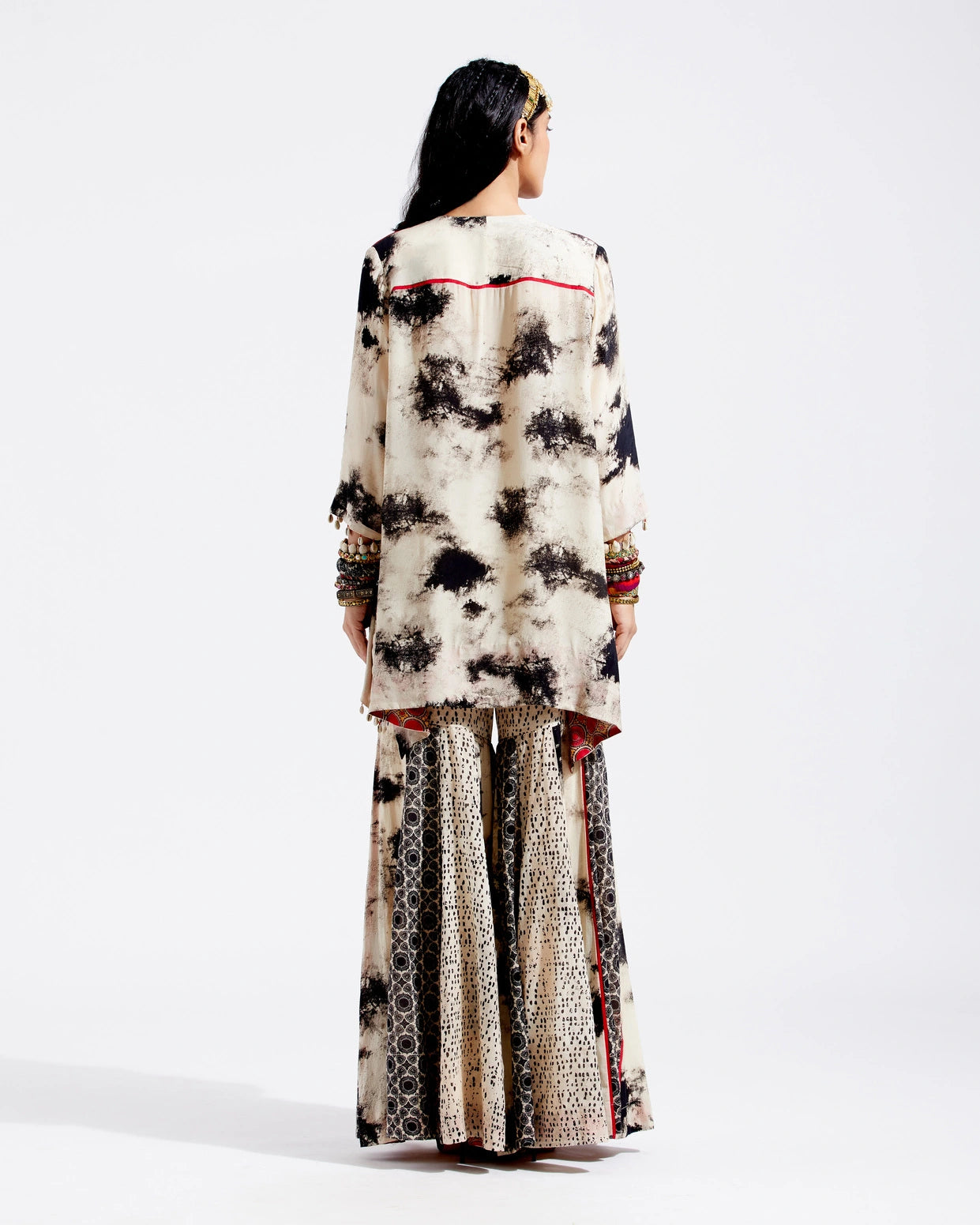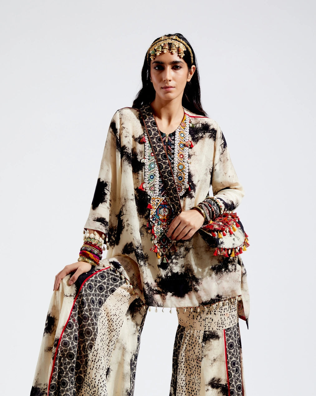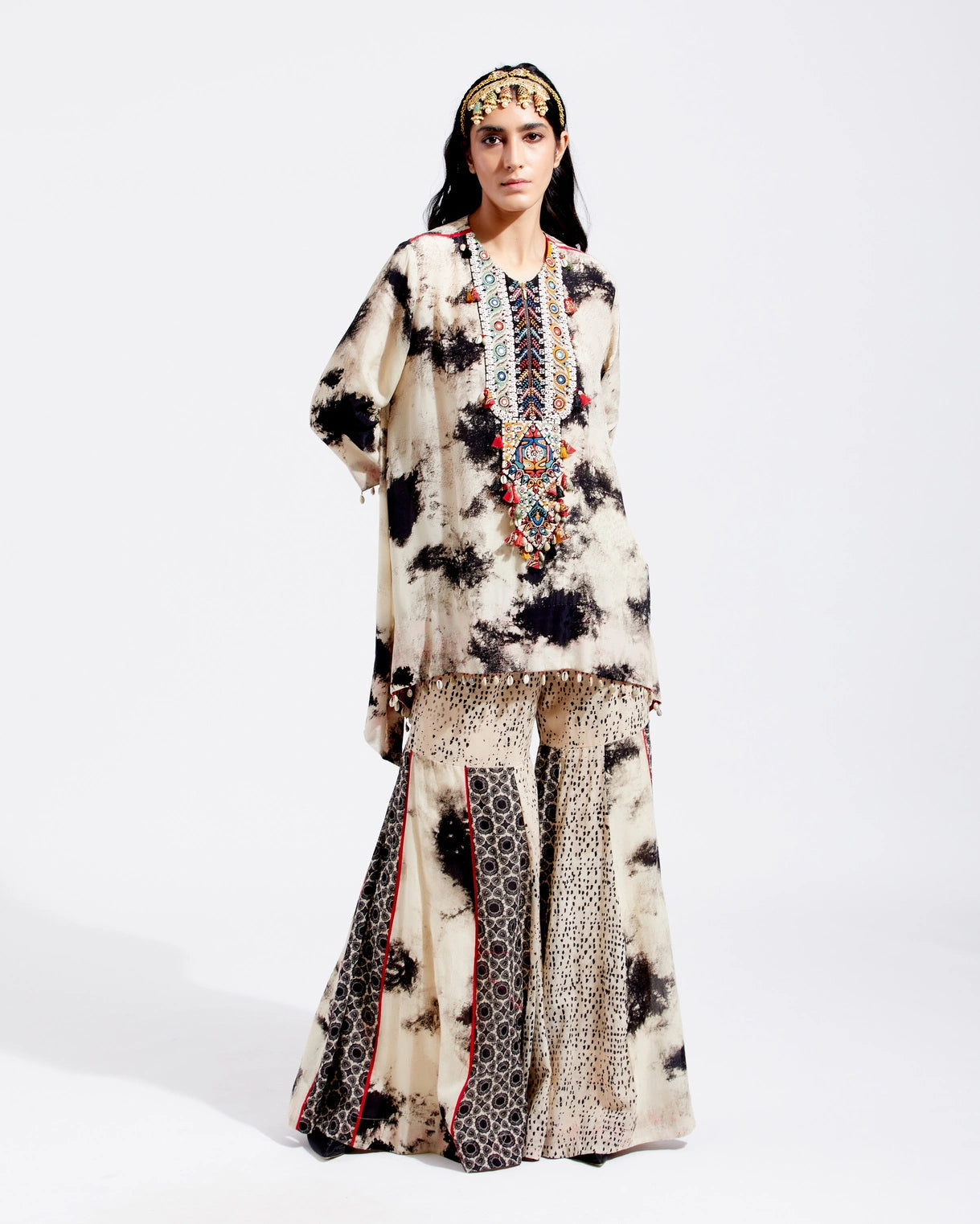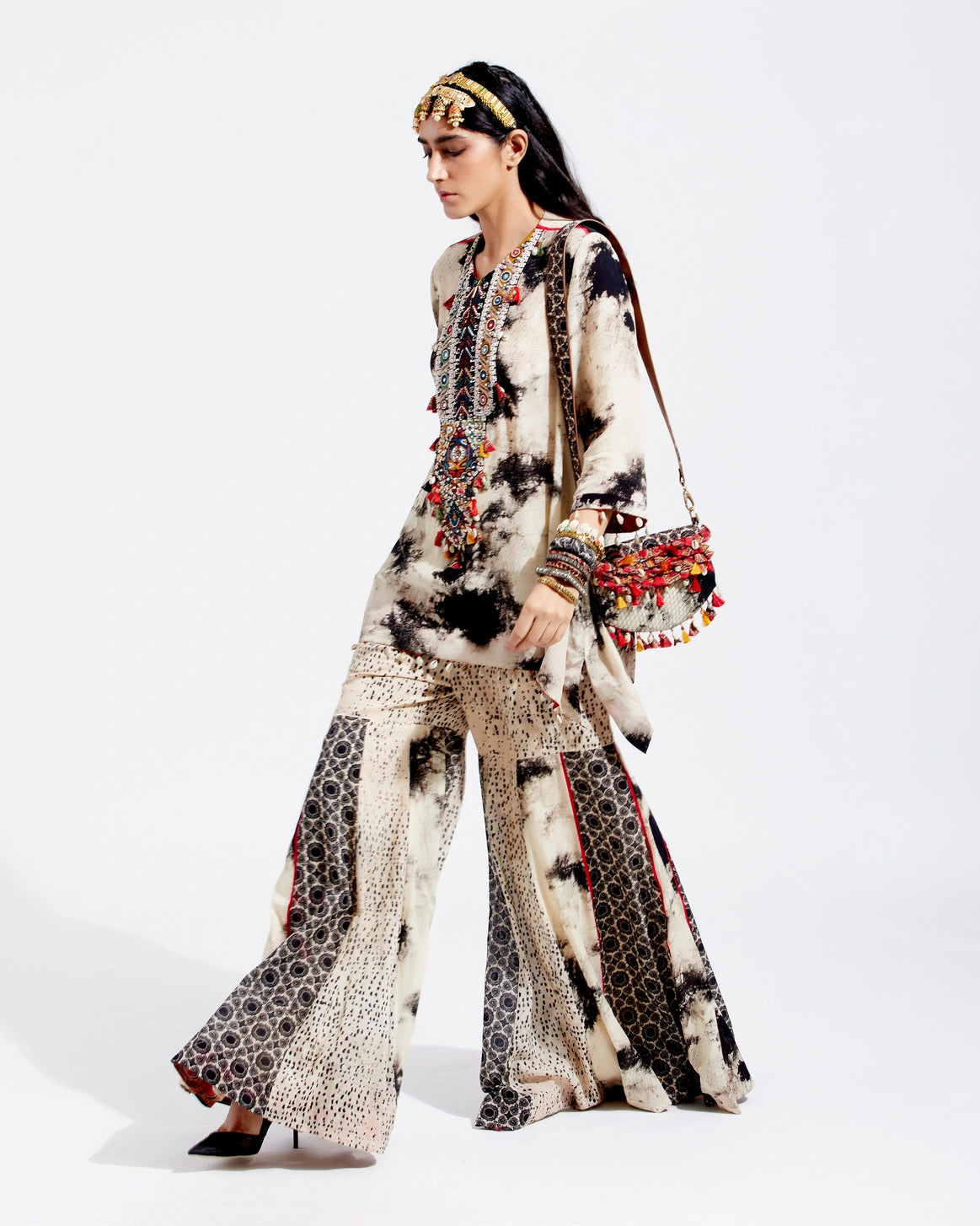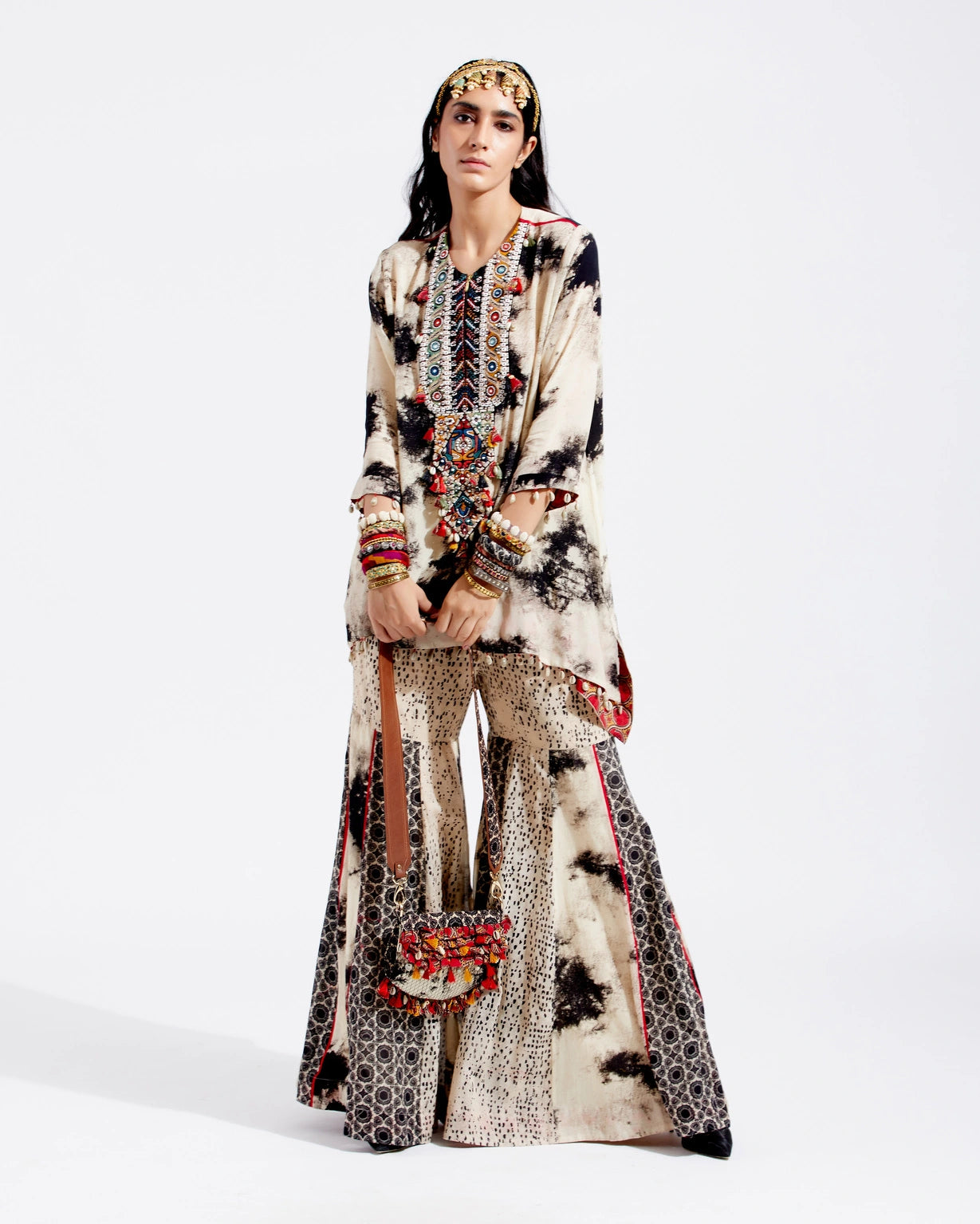 Relaxed fit short tie-dyed kurti with inserts, paired with a sharara trouser. Embellished with resham thread embroidery, cowri shells, mirror work, beads, and tassels. Effortless elegance with an easy fit and elasticated waist.