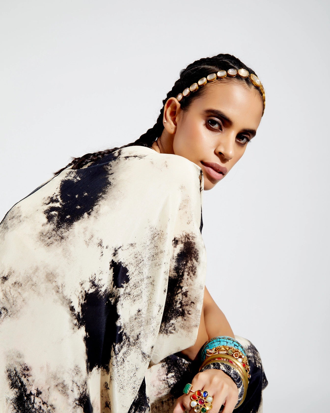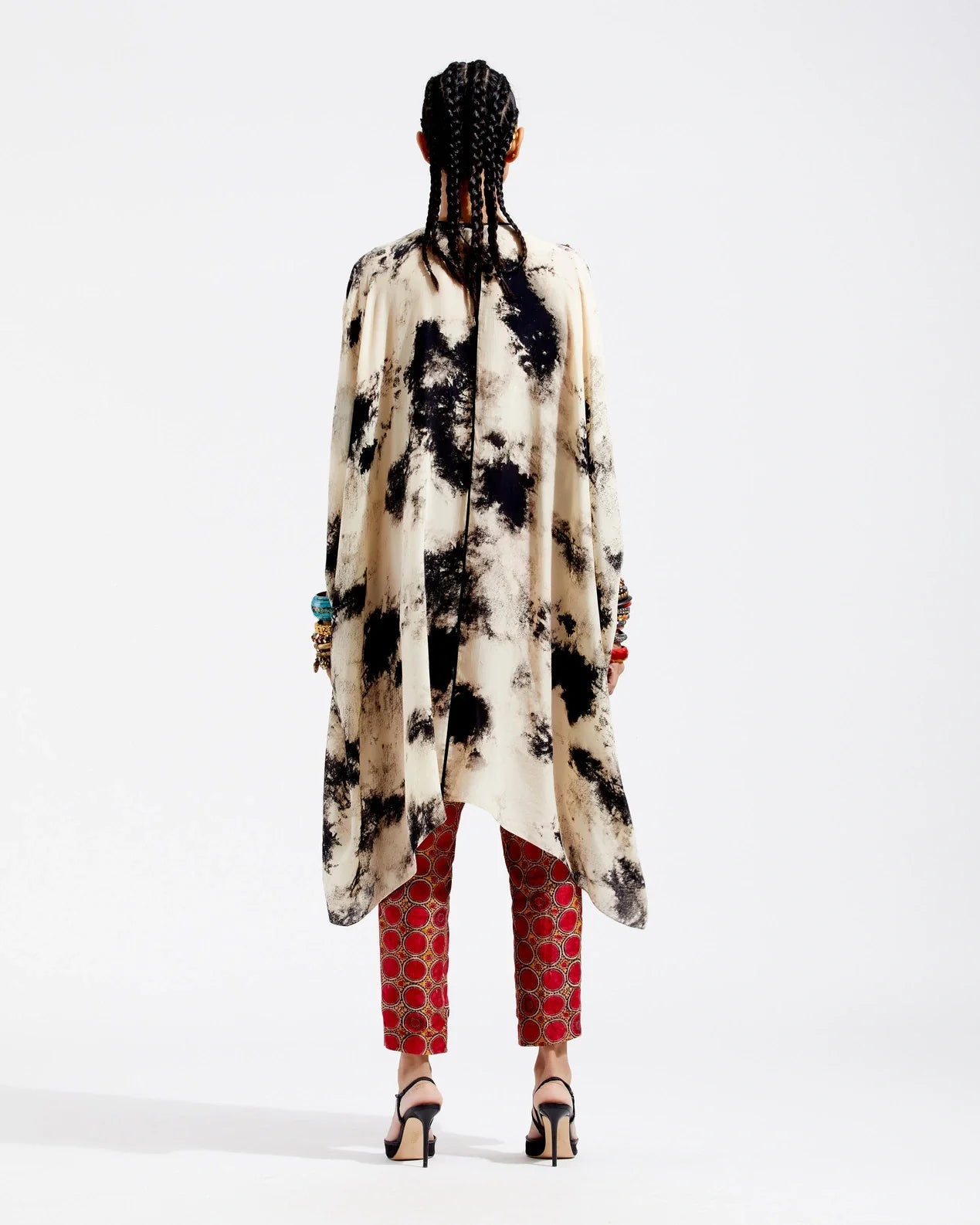 Printed tunic with embroidered yoke, tribal tassel detail and seam inserts paired with printed trouser.Resham thread embroidery, cowri shells, bead and tassel details. Easy fit tunic, with elasticated waist trouser.