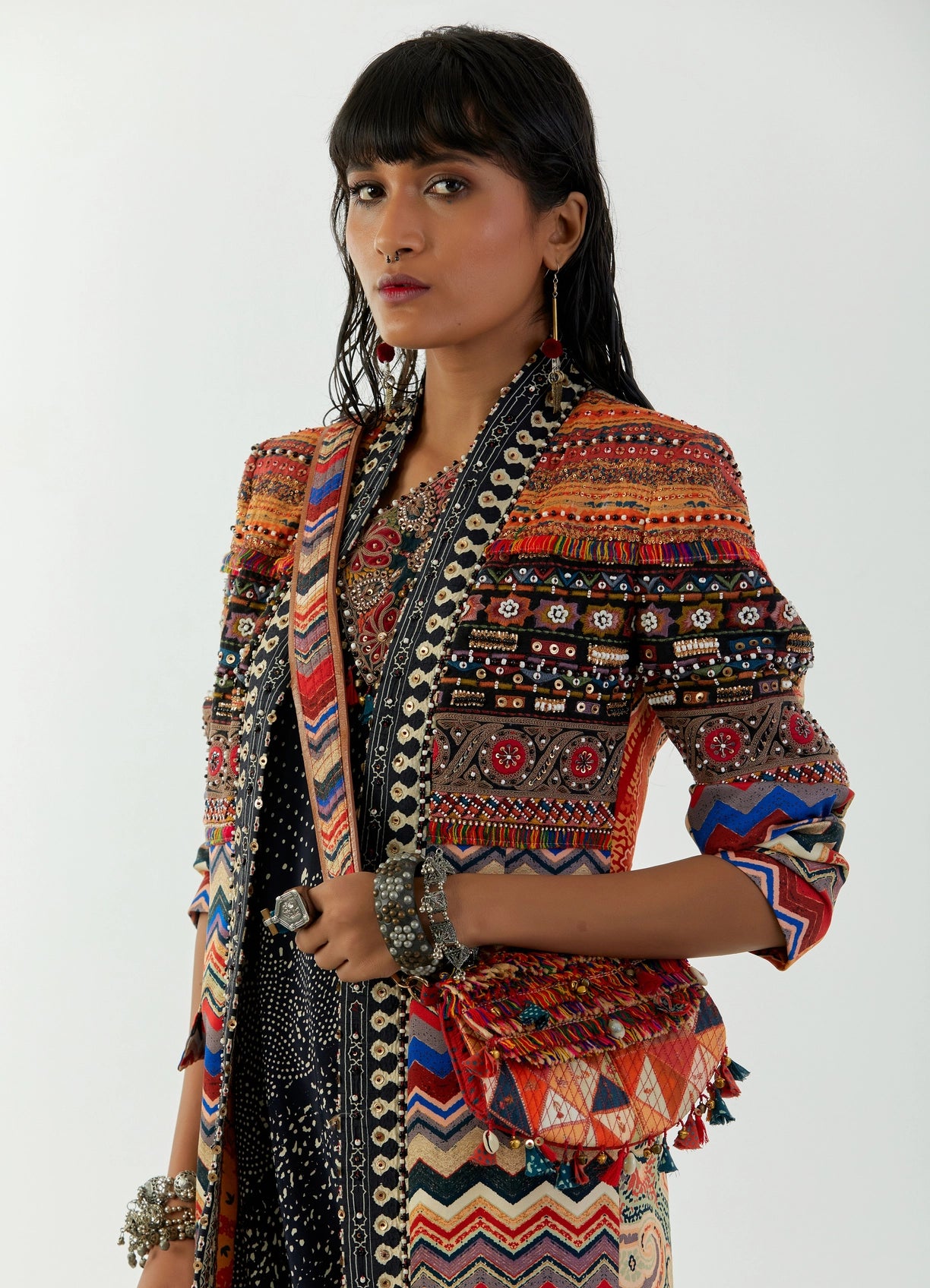 Quilted sling bag with tribal tassel accents, adorned with cowri shells, beads, and tassel details.