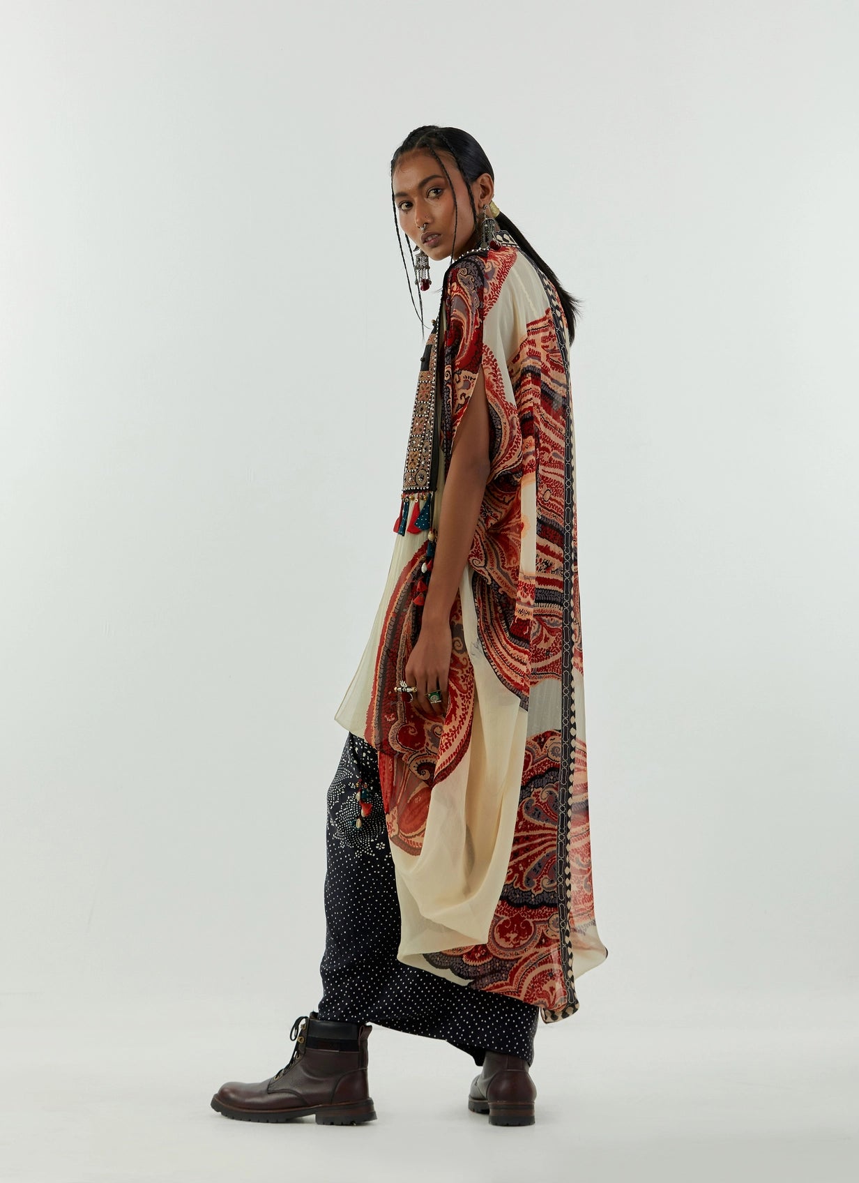 Printed corset blouse with intricate embroidery highlights, paired with a tie-dye printed skirt and a Veni dupatta jacket. Embellished with Resham thread mirror work embroidery, cowri shells, M.O.P. beads, and tassel details. Body-fit blouse with an elasticated, embroidered waistband skirt/trouser and a free-sized jacket.