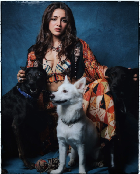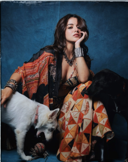 Printed corset blouse with intricate embroidery highlights, paired with a tie-dye printed skirt and a Veni dupatta jacket. Embellished with Resham thread mirror work embroidery, cowri shells, M.O.P. beads, and tassel details. Body-fit blouse with an elasticated, embroidered waistband skirt/trouser and a free-sized jacket.