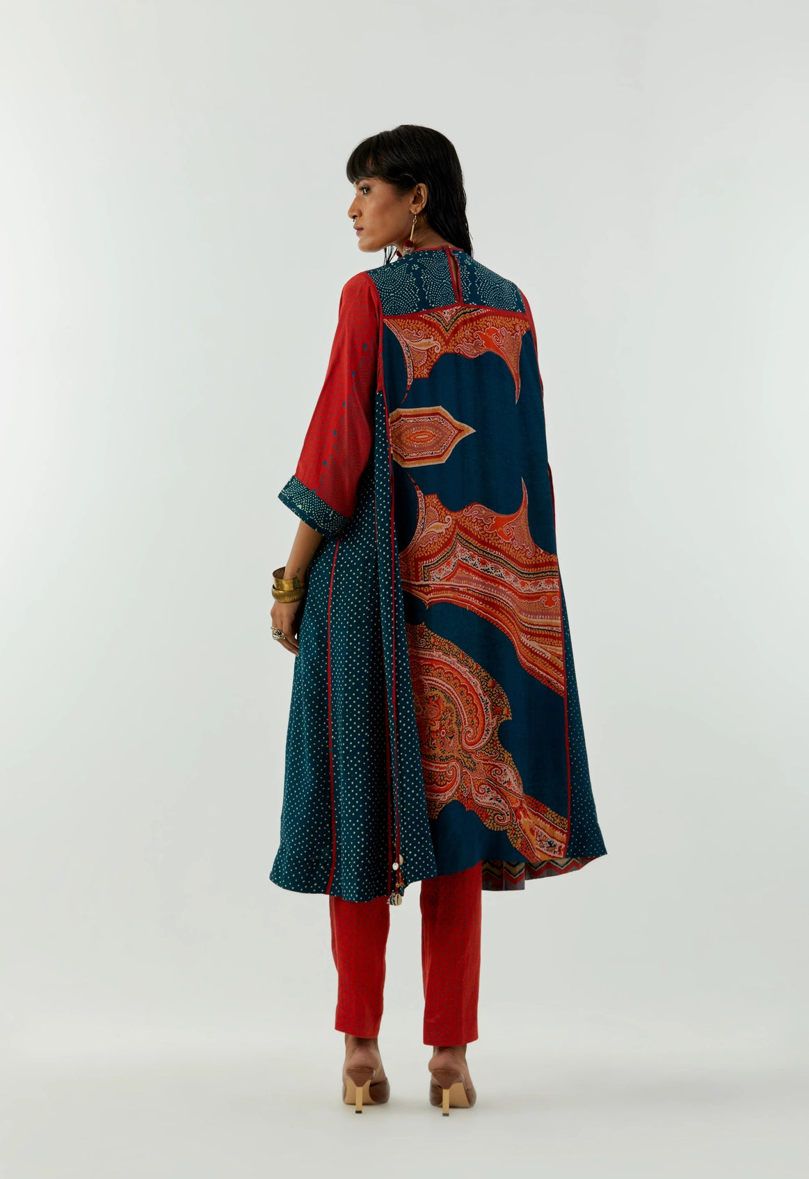 Printed long kurta paired with printed straight trousers, featuring intricate bead highlighting, cowri shells, and tassel details on the yoke. Designed for comfort and elegance with an easy-fit silhouette and elasticated waist trousers.