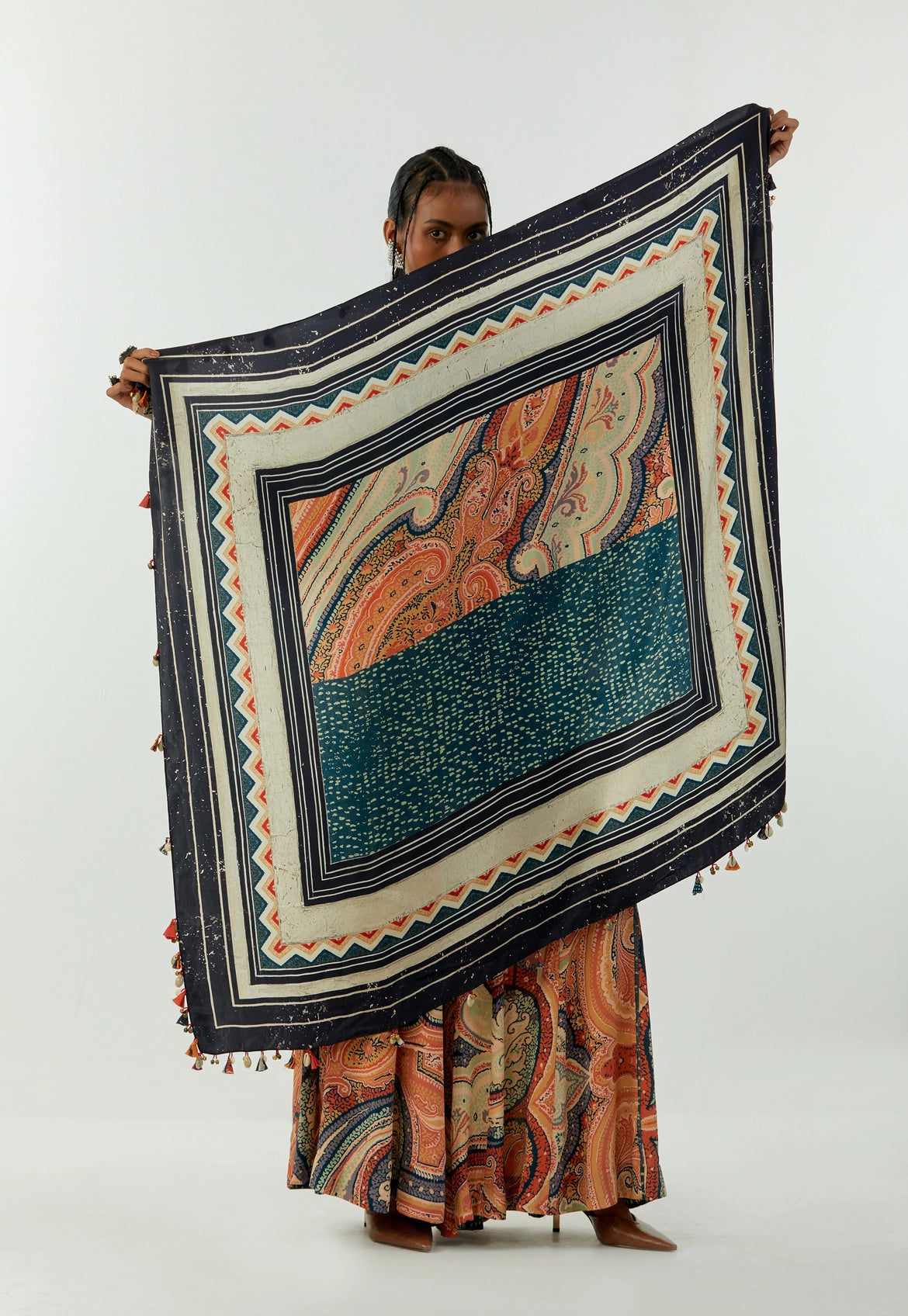 Printed scarf with tribal tassel detailing, adorned with cowri shells, beads, and tassels for a handcrafted touch.