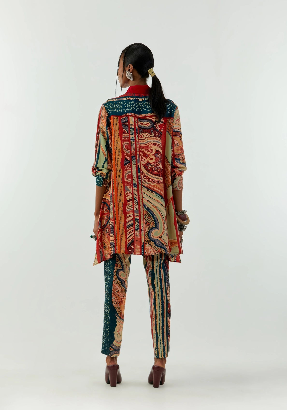 Textured print straight shirt with an embroidered collar and raglan sleeves, adorned with resham thread, beadwork, and mirror embroidery. Effortless and easy fit.