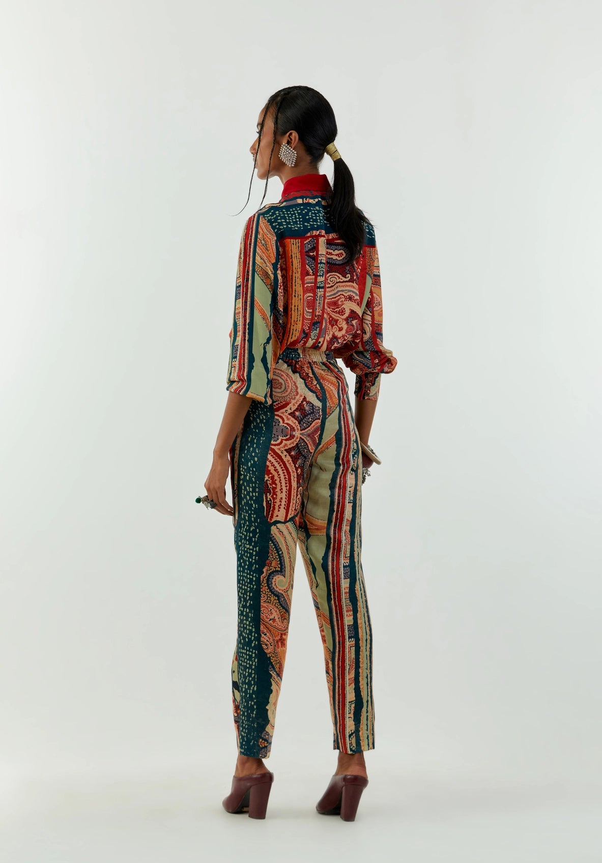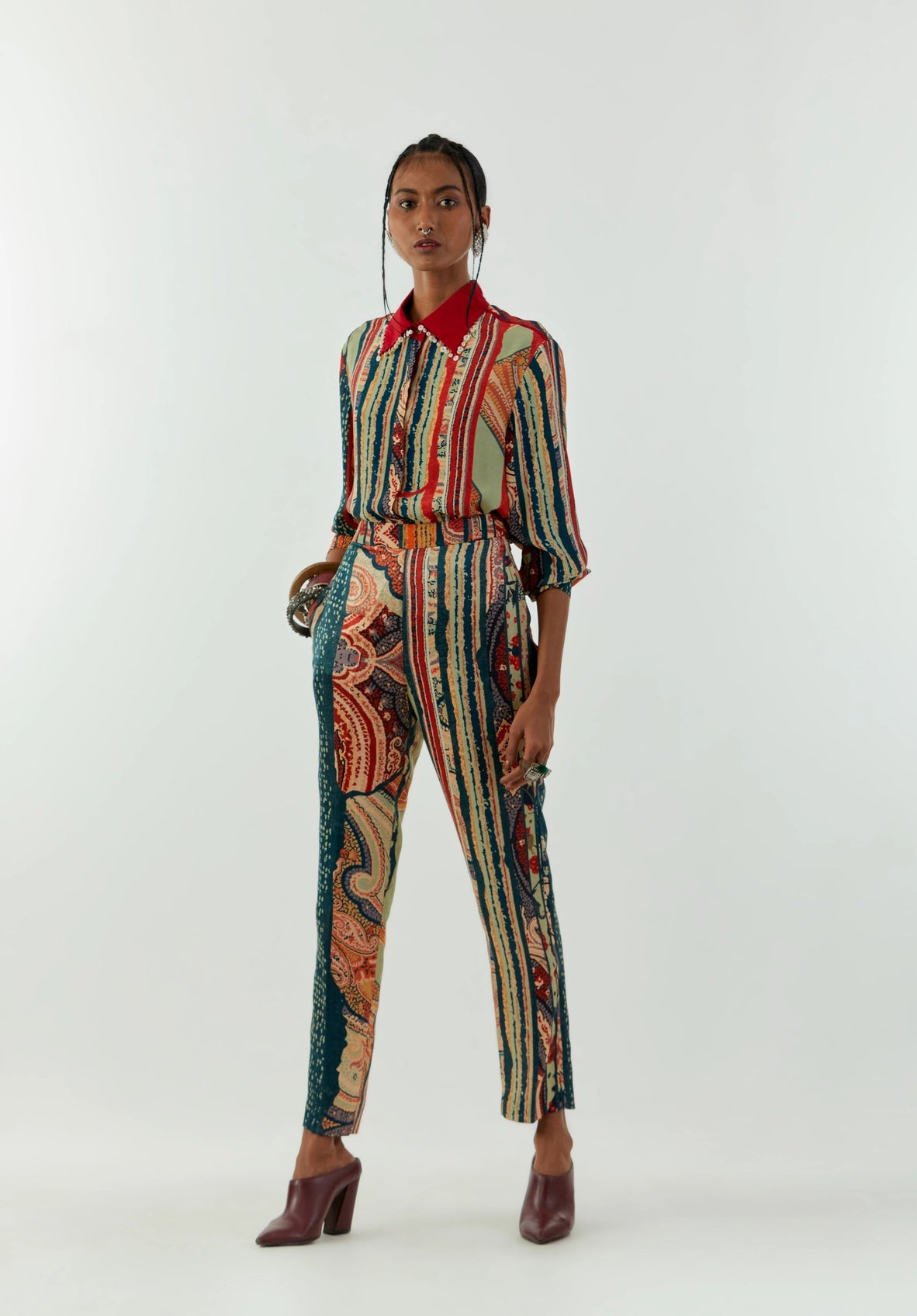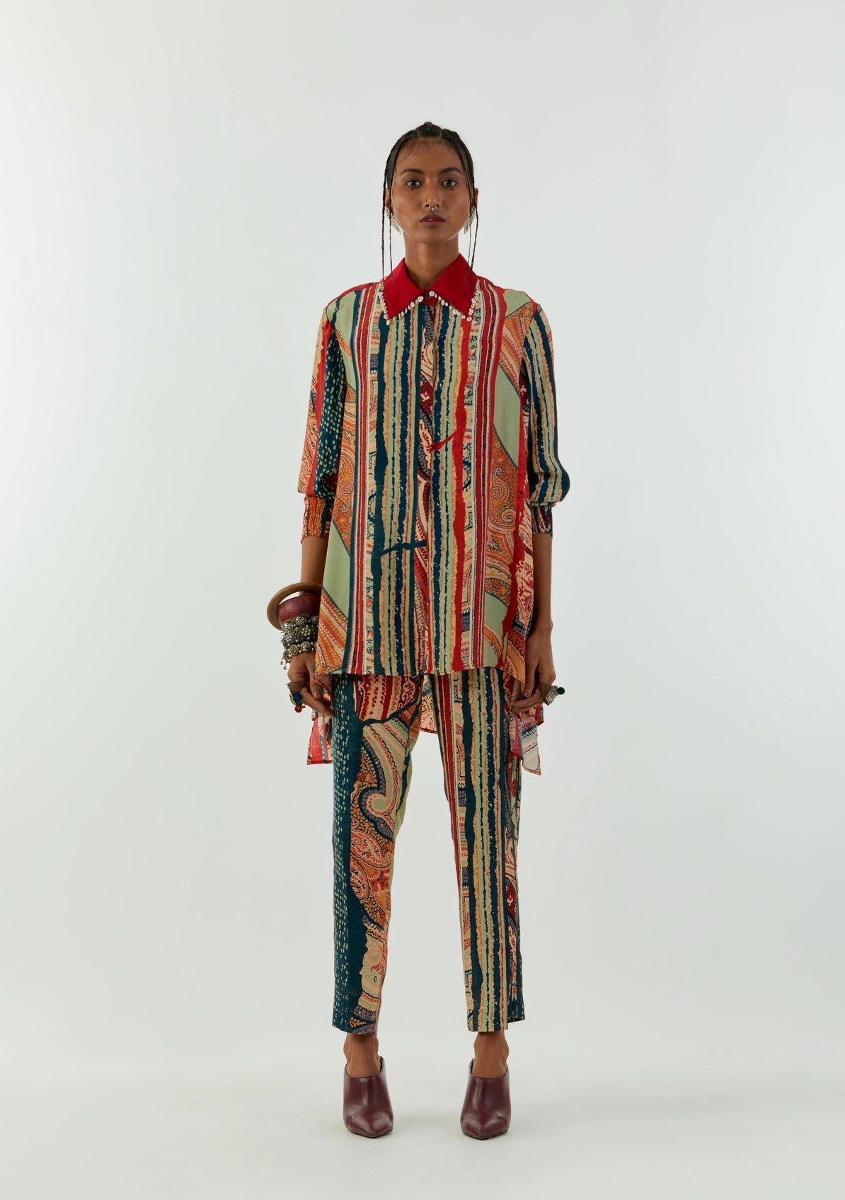 Textured print straight shirt with an embroidered collar and raglan sleeves, paired with printed slim-fit trousers. Accentuated with resham thread, beadwork, and mirror embroidery. Effortless fit with an elasticated waist trouser.