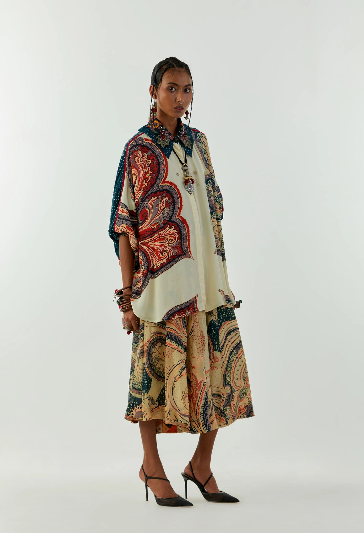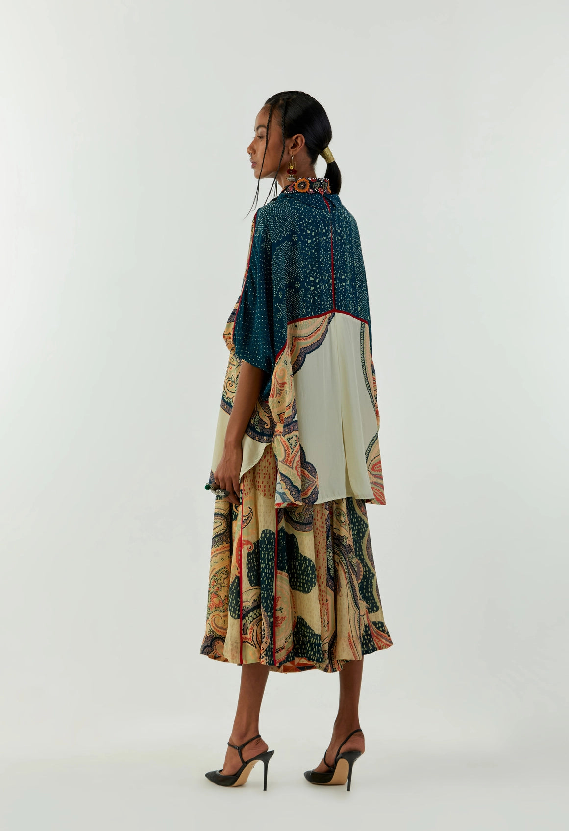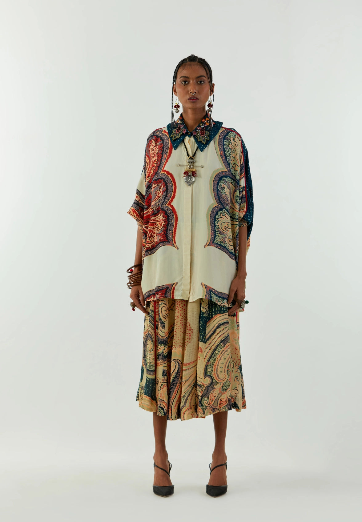 Trapeze printed shirt with inserts and an embroidered collar. Adorned with resham thread and mirror embroidery. Designed without armholes for a seamless drape. Easy fit for all sizes.