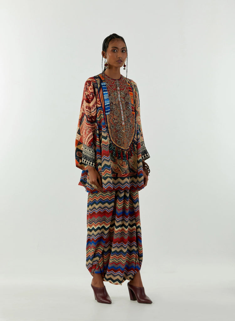 Printed tunic featuring an embroidered yoke, tribal tassel details, and seam inserts, paired with printed drape trousers. Embellished with Resham thread embroidery, cowri shells, beads, and tassels. Designed for effortless elegance with an easy-fit silhouette and elasticated waist trousers.