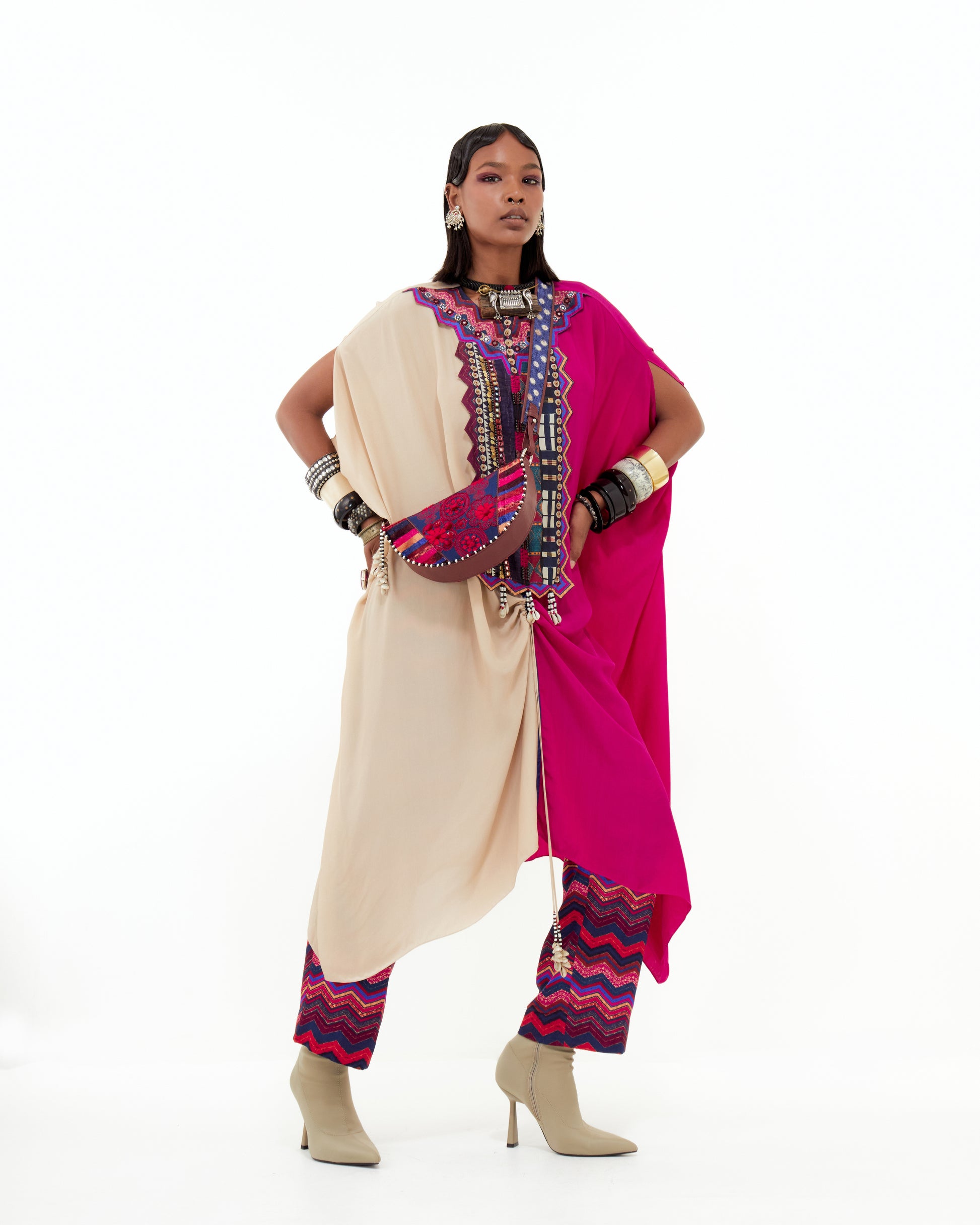 Leather bag with tribal tassel detailing and a small pouch. Features resham red thread embroidery with black and white tribal moti detailing.