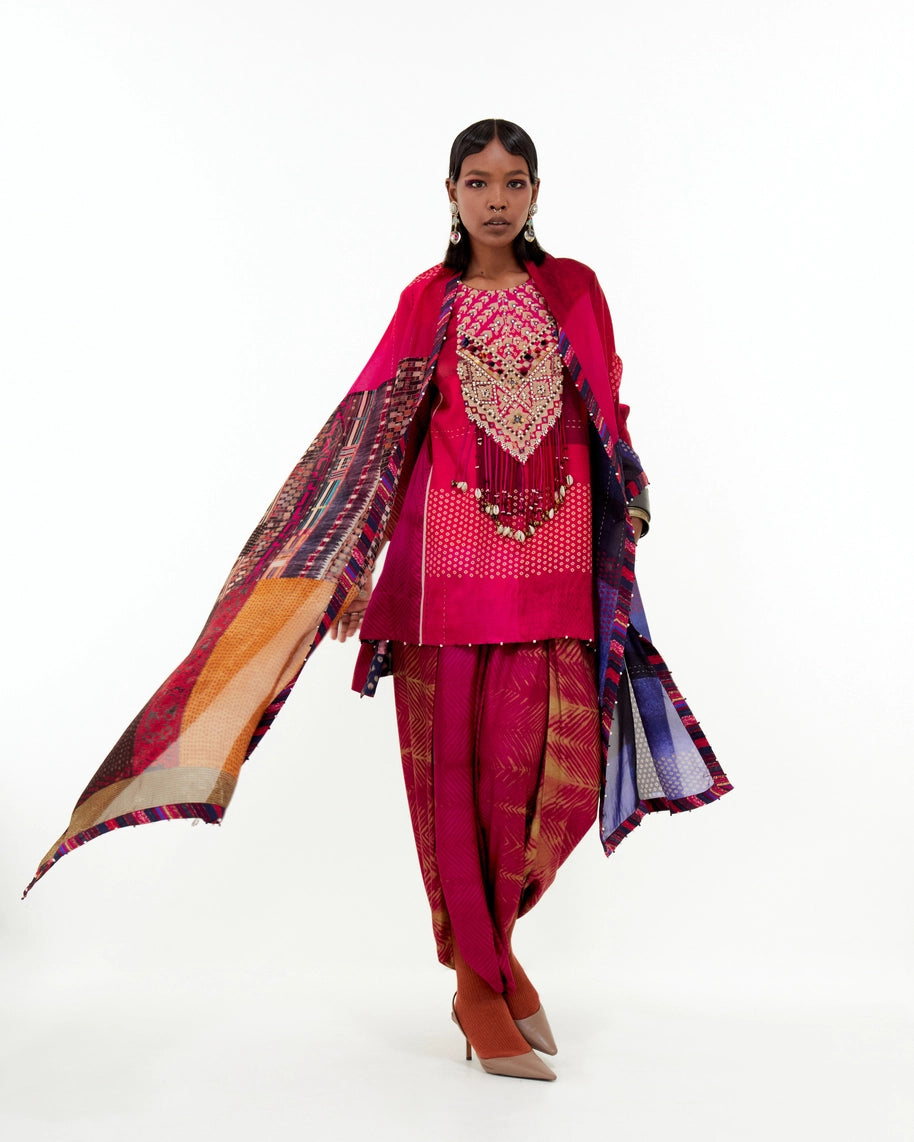 Sheer silk printed dupatta featuring black and white bead detailing with lace. Designed for an easy fit for all sizes.