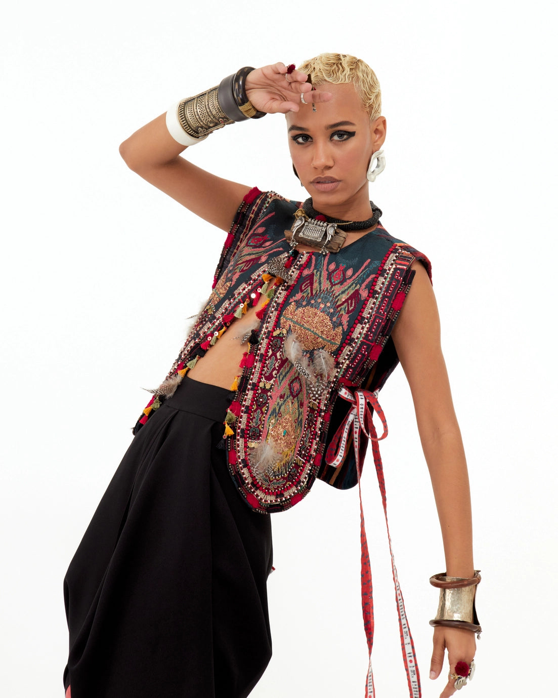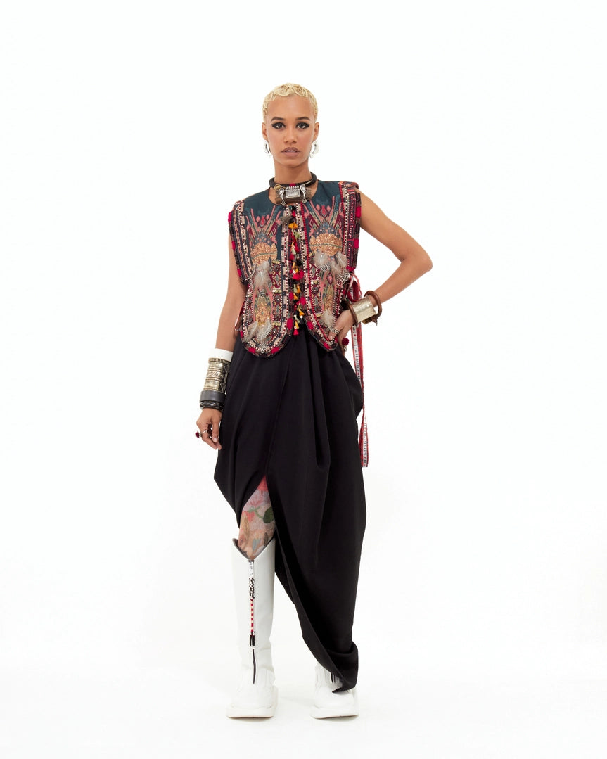 Embroidered gilet featuring Resham thread embroidery, beadwork, and a highlighted tribal yoke with feathers and textured fabric. Free-size gilet with no armholes and lace ties at the sides.
