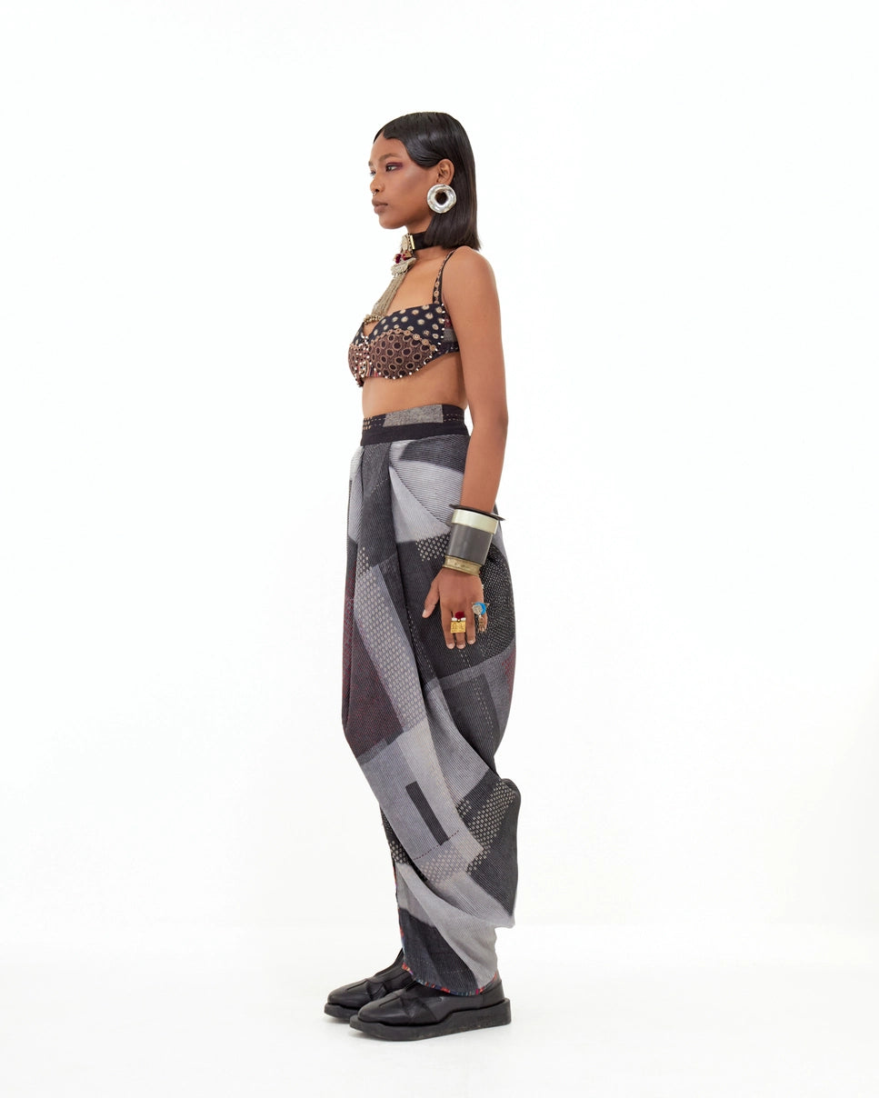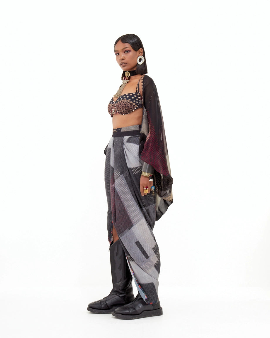 Printed bra blouse with inserts, paired with a sheer Veni dupatta jacket and printed drape trouser. Features Resham thread mirror work embroidery, cowri shells, M.O.P. bead, and tassel details. The blouse is body-fitted, the trouser has an elasticated waistband, and the jacket is free-size.