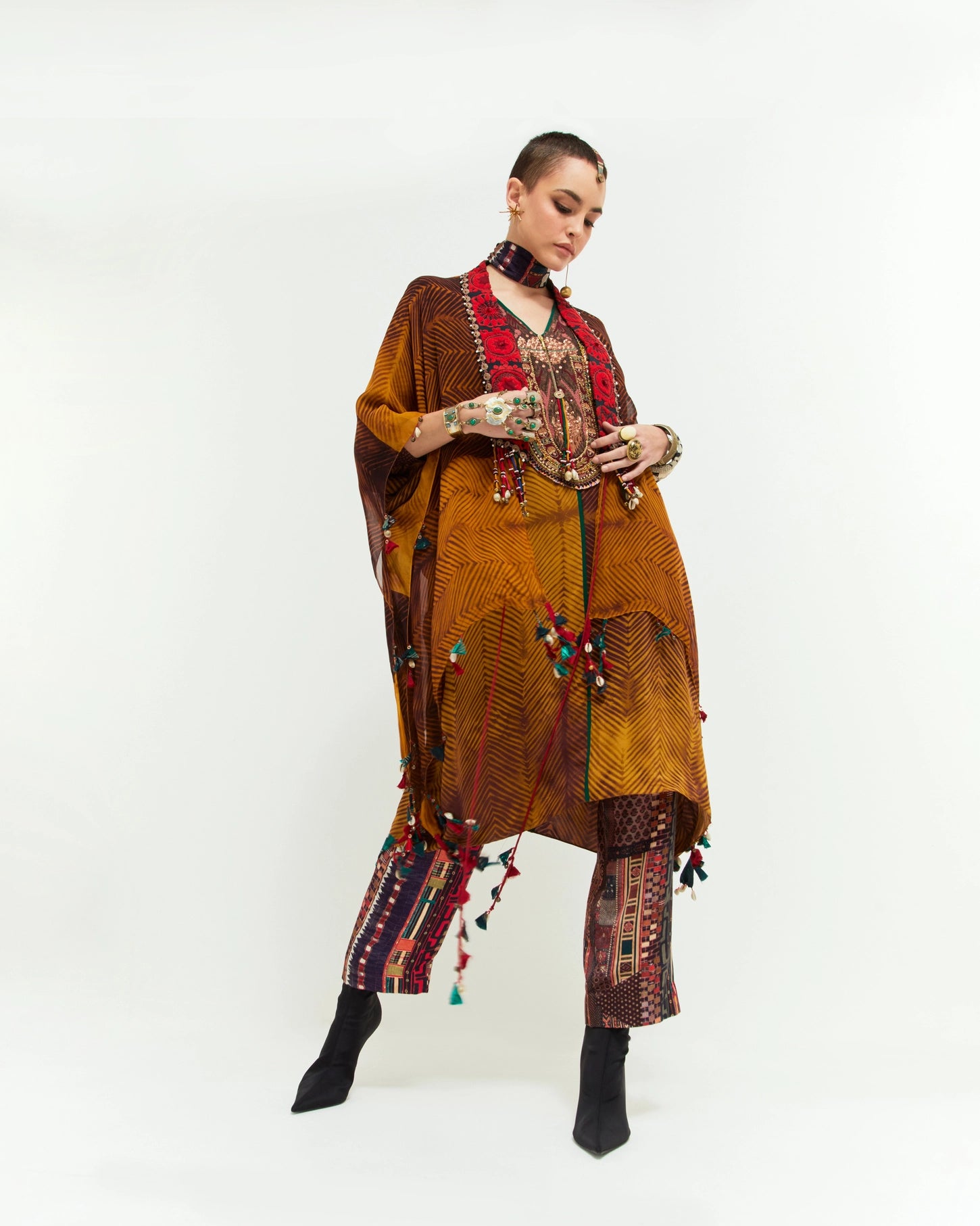 Shibori print tunic with an embroidered yoke, tribal tassel detail, and seam inserts, paired with printed straight trousers and a dupatta jacket. Features Resham thread embroidery, cowri shells, beads, and tassel details. Easy-fit, free-size tunic with elasticated waist trousers and a sheer silk jacket.