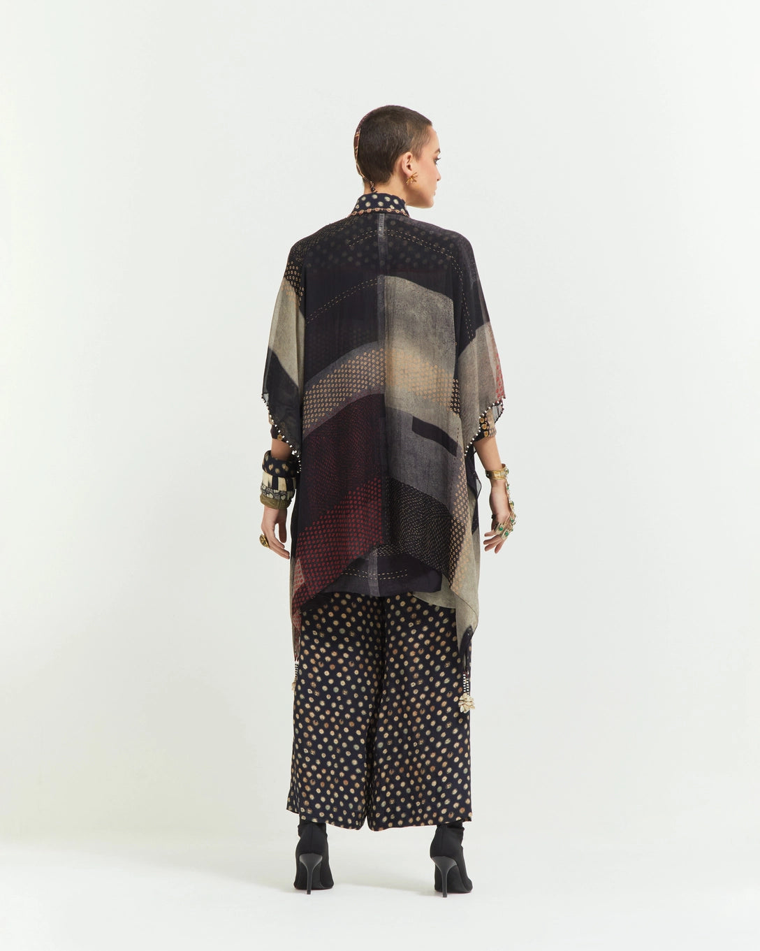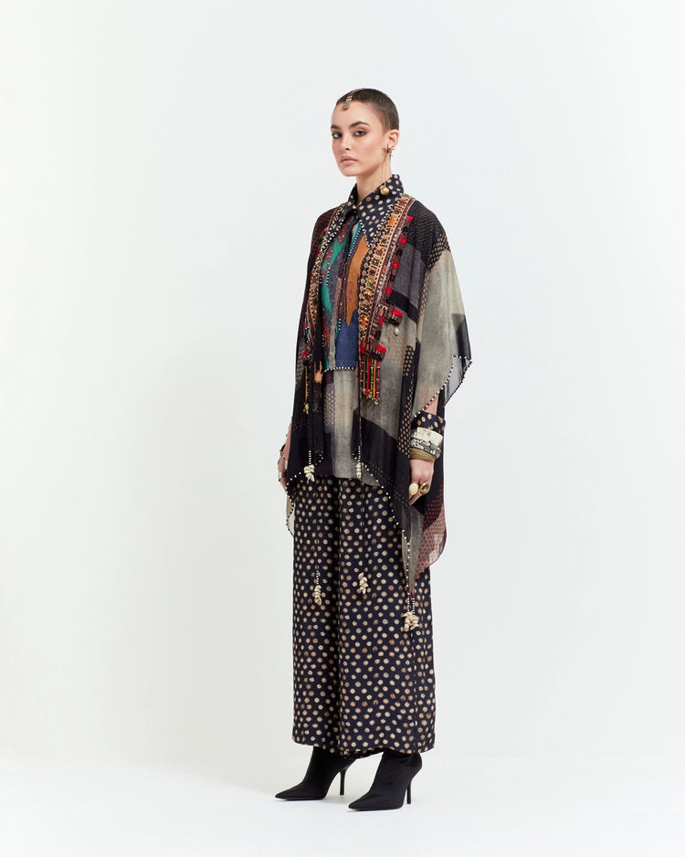 Printed straight shirt with an embroidered collar & yoke, paired with printed wide-leg trousers and a dupatta jacket. Features a printed collar with black and white bead details, highlighting on the yoke, and a printed trouser. The embroidered yoke jacket includes tassel details. Easy-fit shirt with elasticated waist trousers and a free-size jacket.