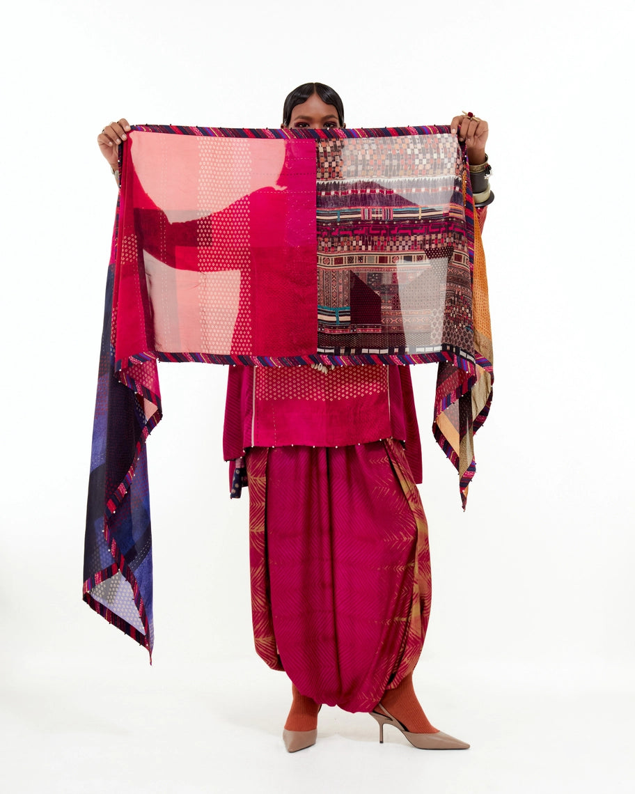 Relaxed fit short printed kurti with printed inserts, paired with printed drape trouser and sheer silk dupatta. Features Resham thread embroidery, cowri shells, M.O.P. bead, and tassel details. Easy fit kurta with elasticated waist trouser.