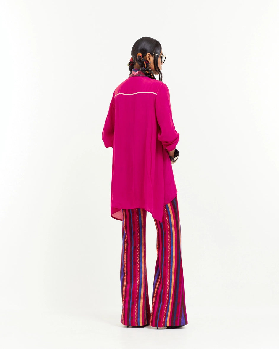Solid-colored straight shirt with an embroidered collar paired with stripe print bootleg trouser. Beadwork and highlighting. Easy fit shirt with elasticated waist trouser.