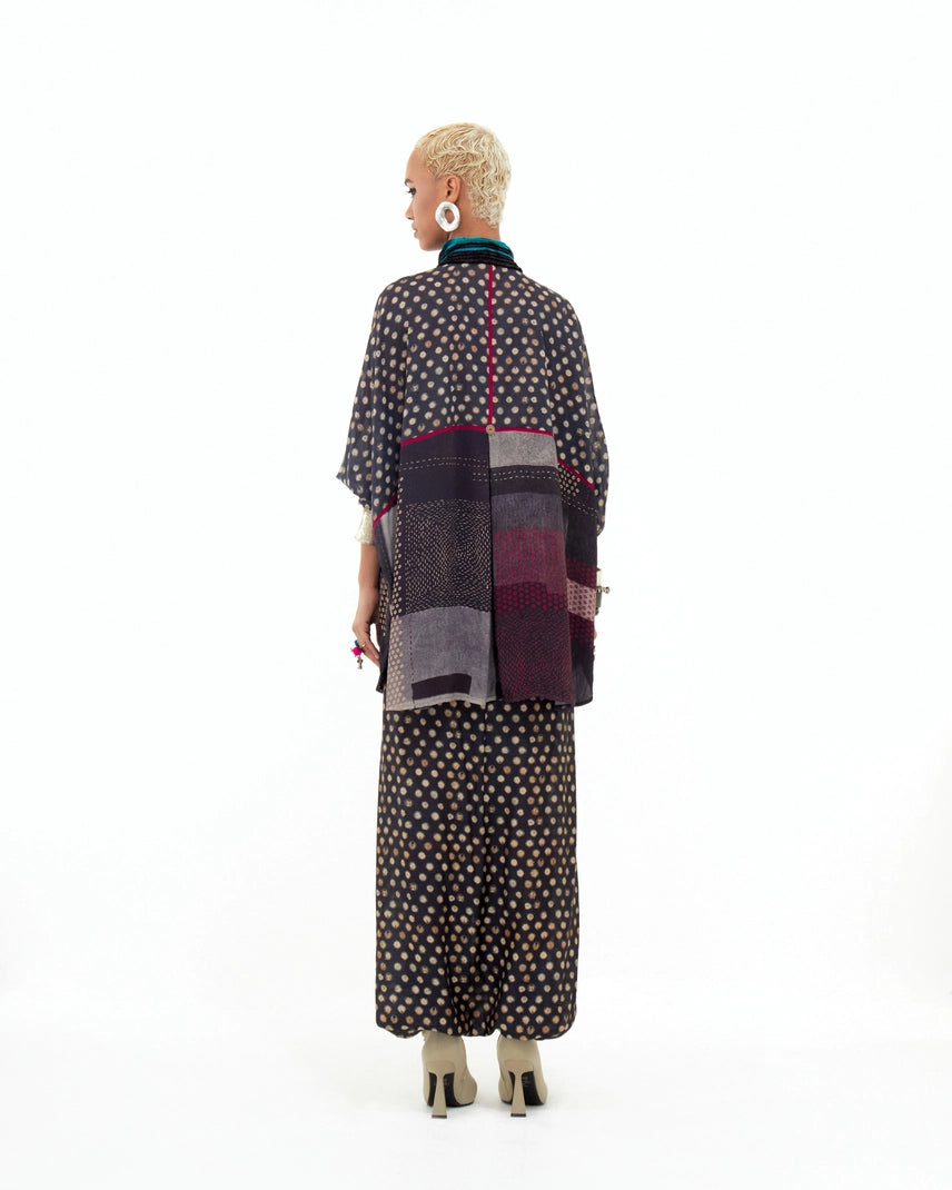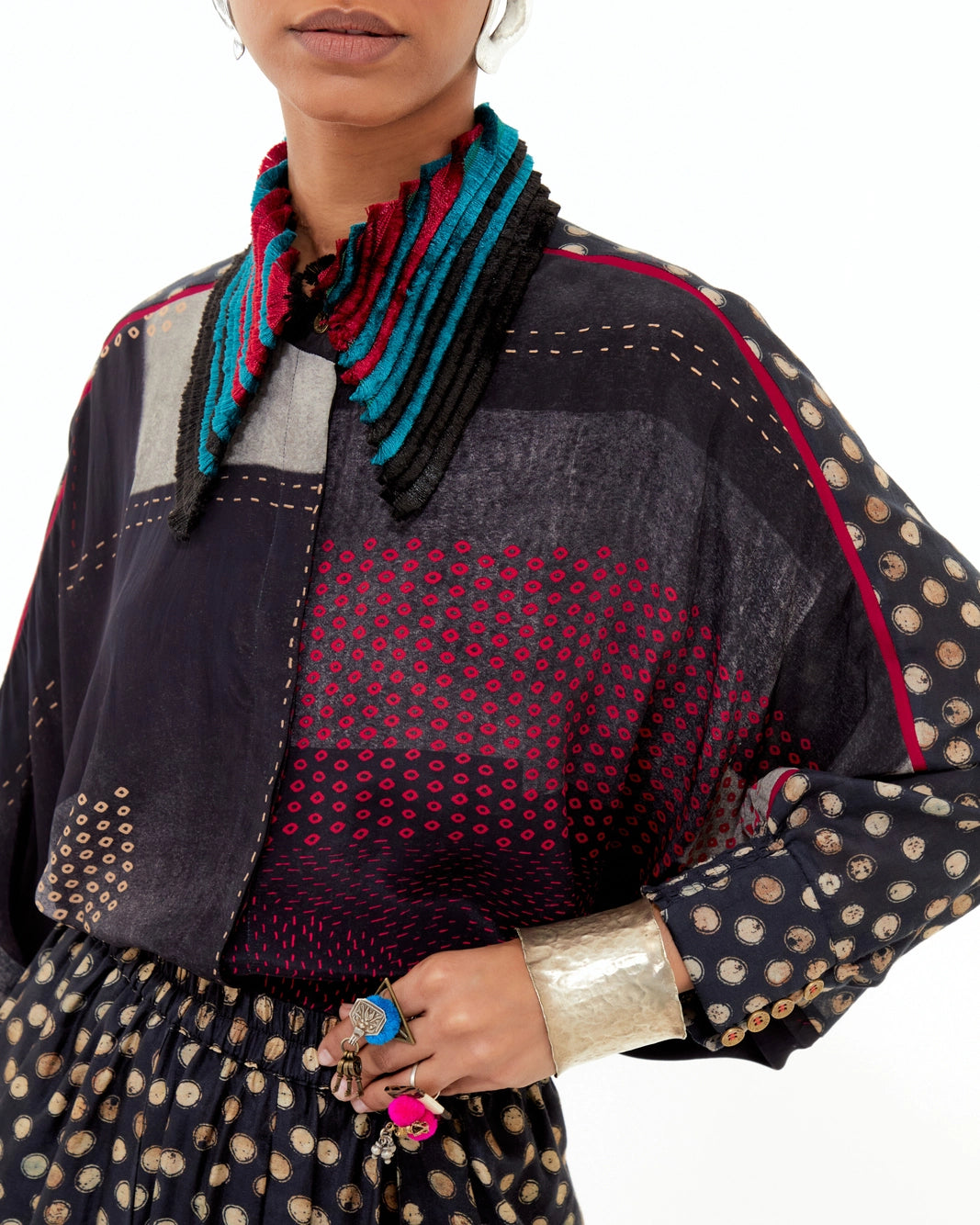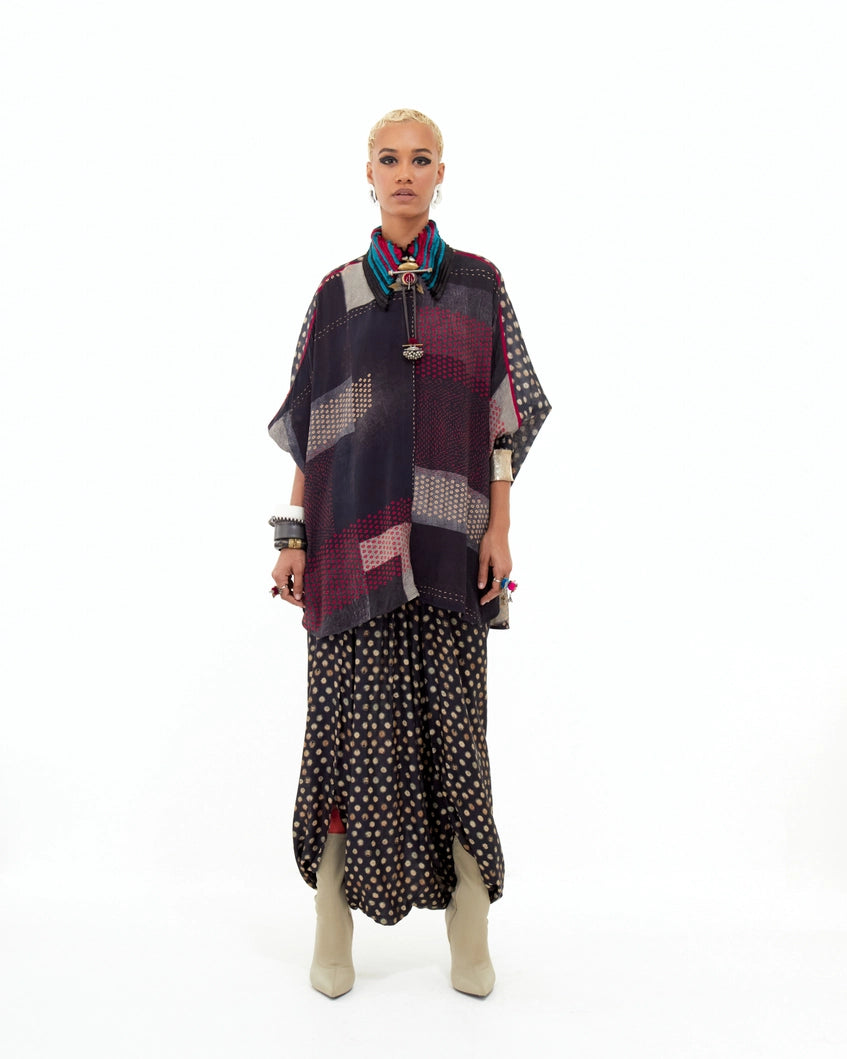 A trapeze-printed shirt with inserts and an embroidered collar, adorned with graded braid detailing. Designed without armholes for a fluid silhouette and an easy fit for all sizes.