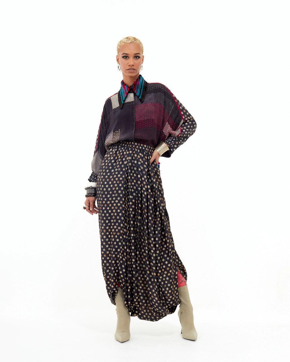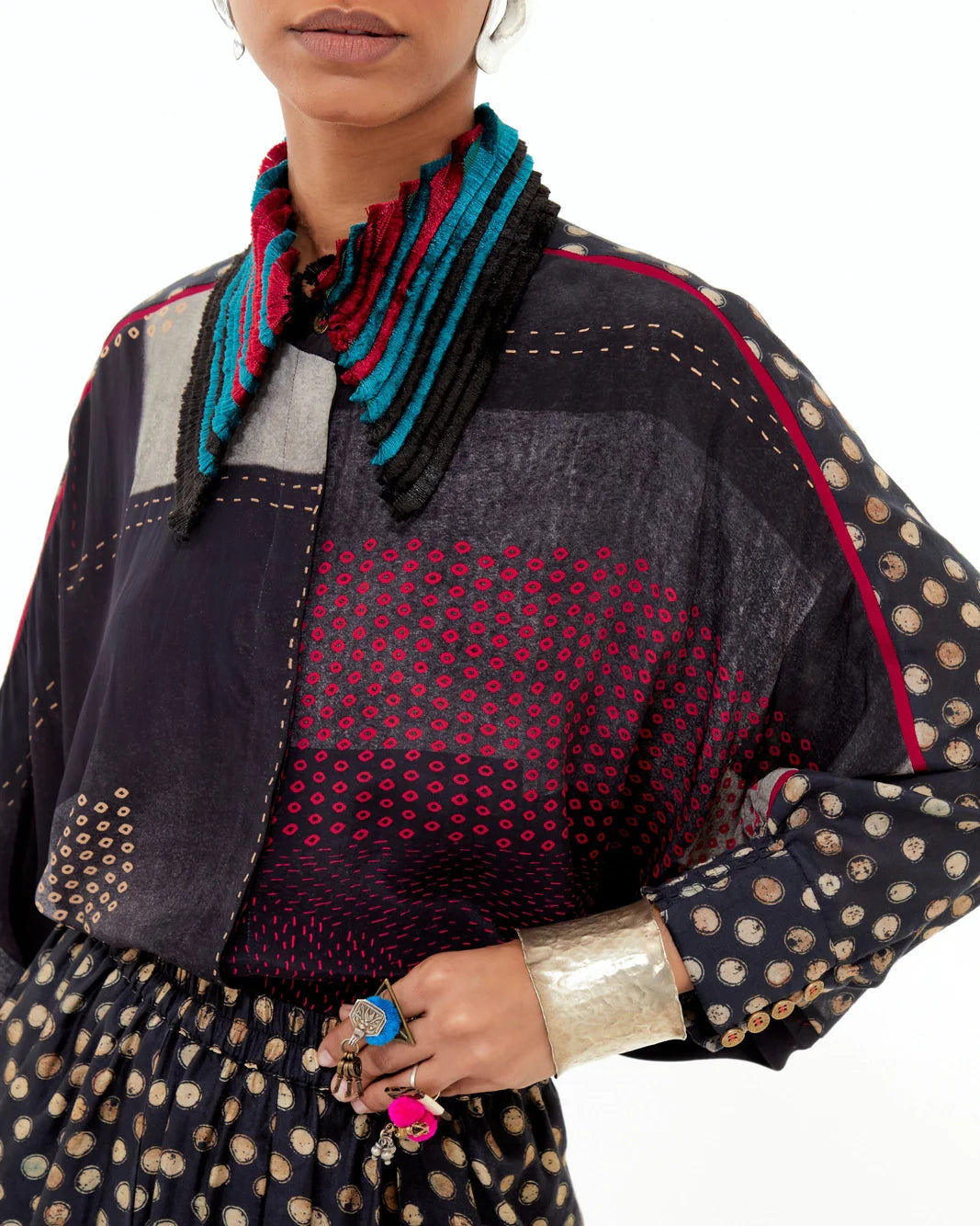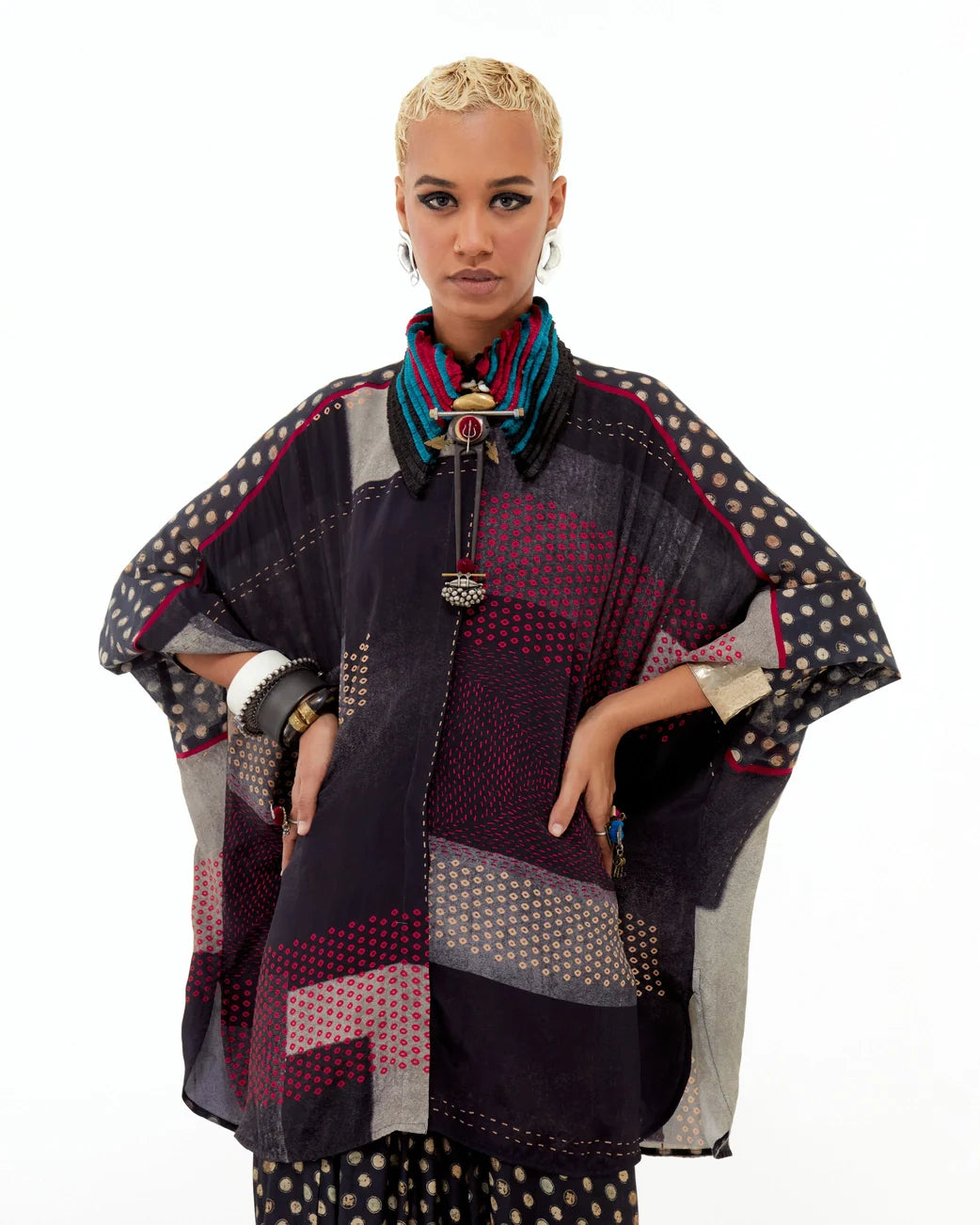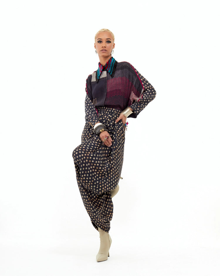 A trapeze-printed shirt with inserts and an embroidered collar, featuring graded braid detailing. Paired with printed drape trousers for a fluid silhouette. No armholes and an easy fit for all sizes with an elasticated waist trouser.