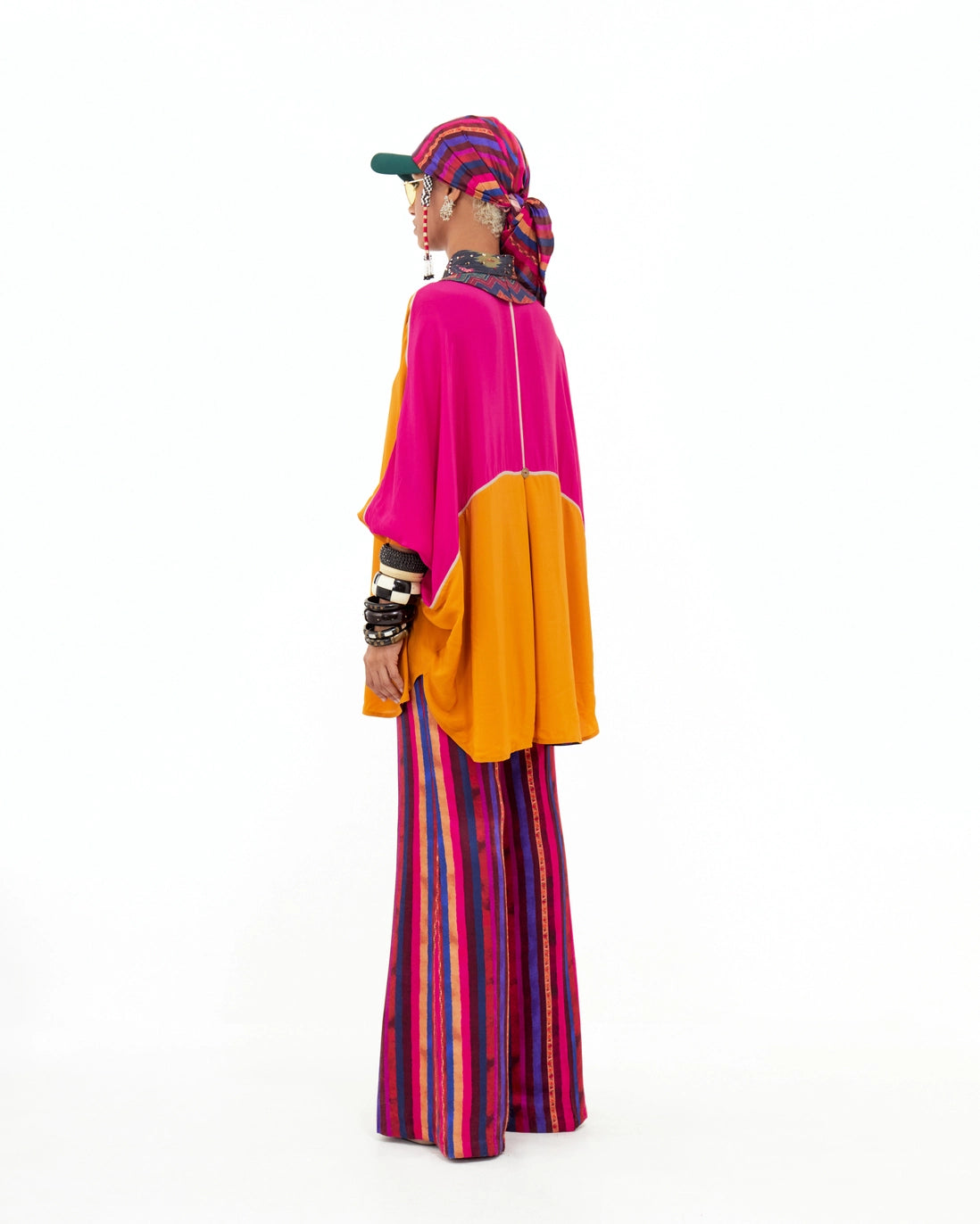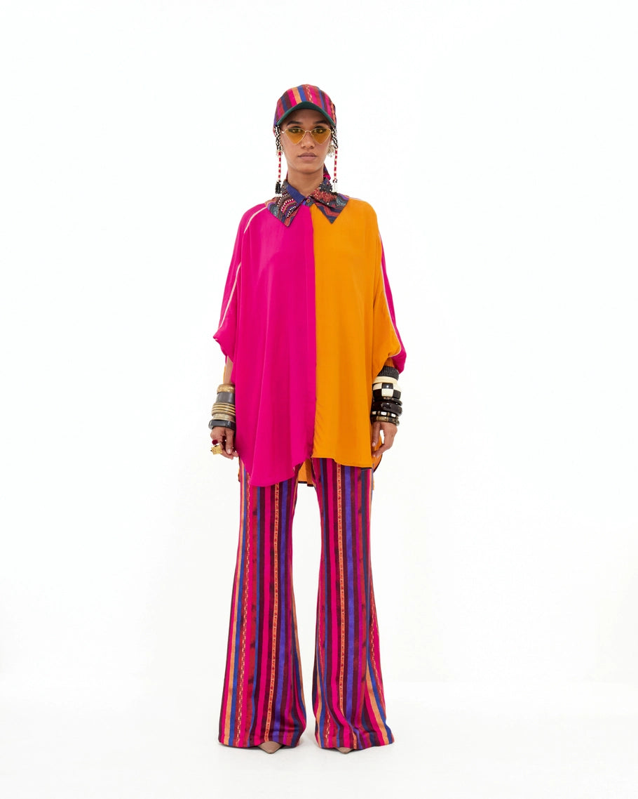 A solid color-block shirt with a detailed embroidered collar, paired with straight trousers. Featuring resham thread embroidery on the collar and a seamless, no-armhole design for a relaxed yet structured silhouette. Easy fit for all sizes with an elasticated waist trouser.