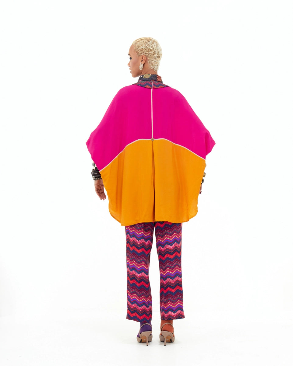 A solid color-block shirt with a detailed embroidered collar, paired with bootleg trousers. Featuring resham thread embroidery on the collar and a seamless, no-armhole design for a relaxed yet structured silhouette. Easy fit for all sizes with an elasticated waist trouser.