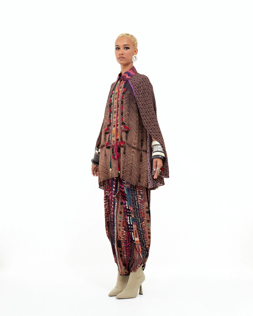 A printed shirt with cape sleeves, featuring resham thread embroidery, beadwork, and a textured yoke with tassel details. Designed without armholes for a fluid silhouette, offering an easy fit for all sizes.