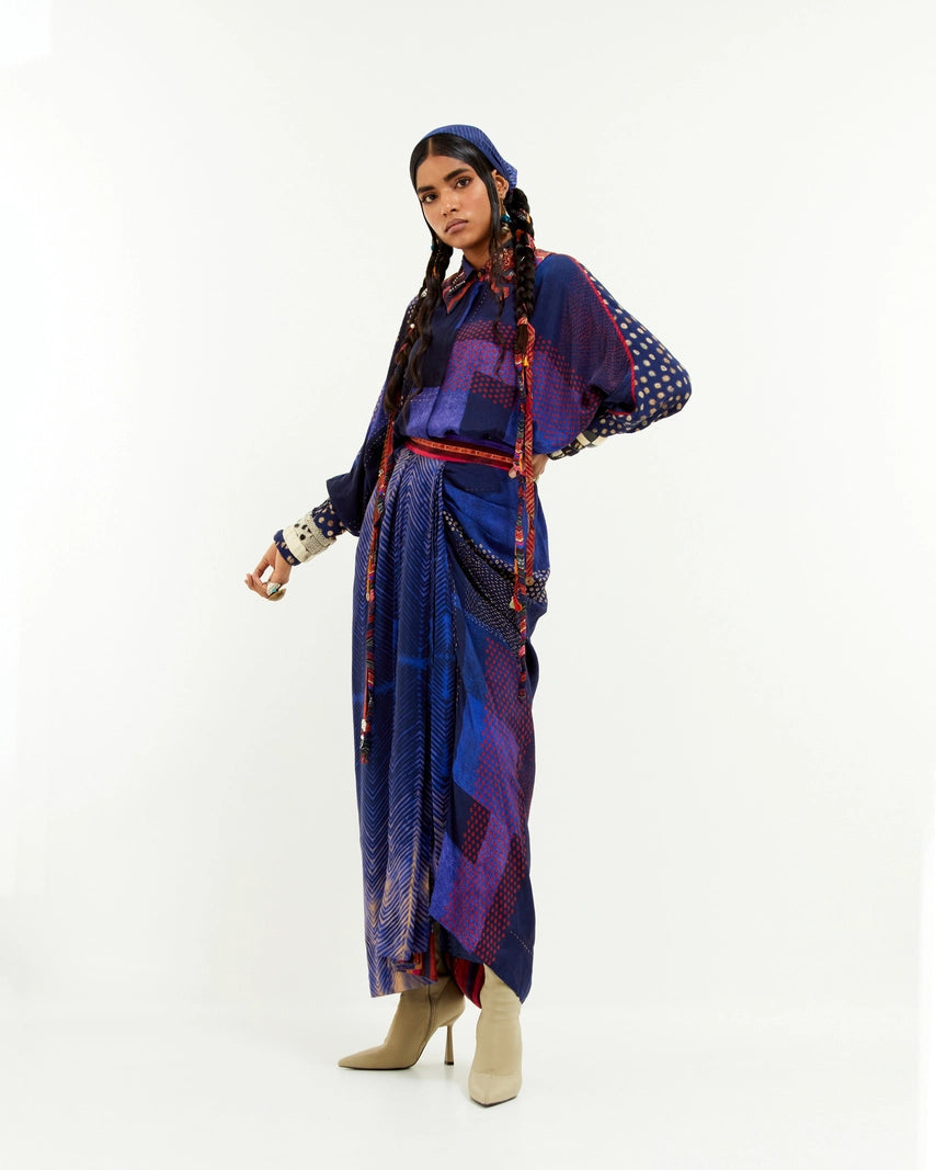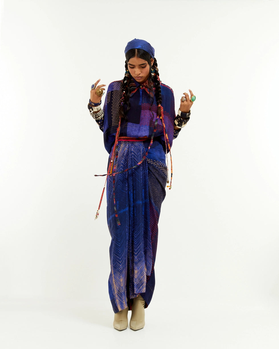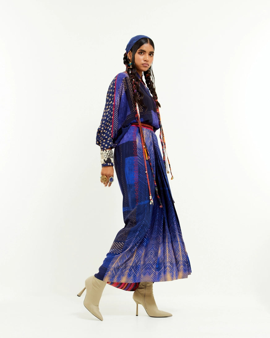 A free-flowing trapeze shirt with contrast inserts, adorned with intricate resham thread embroidery and beadwork on the collar, paired with a printed pleated skirt. Featuring a no-armhole design and an elasticated waist for effortless movement and comfort.