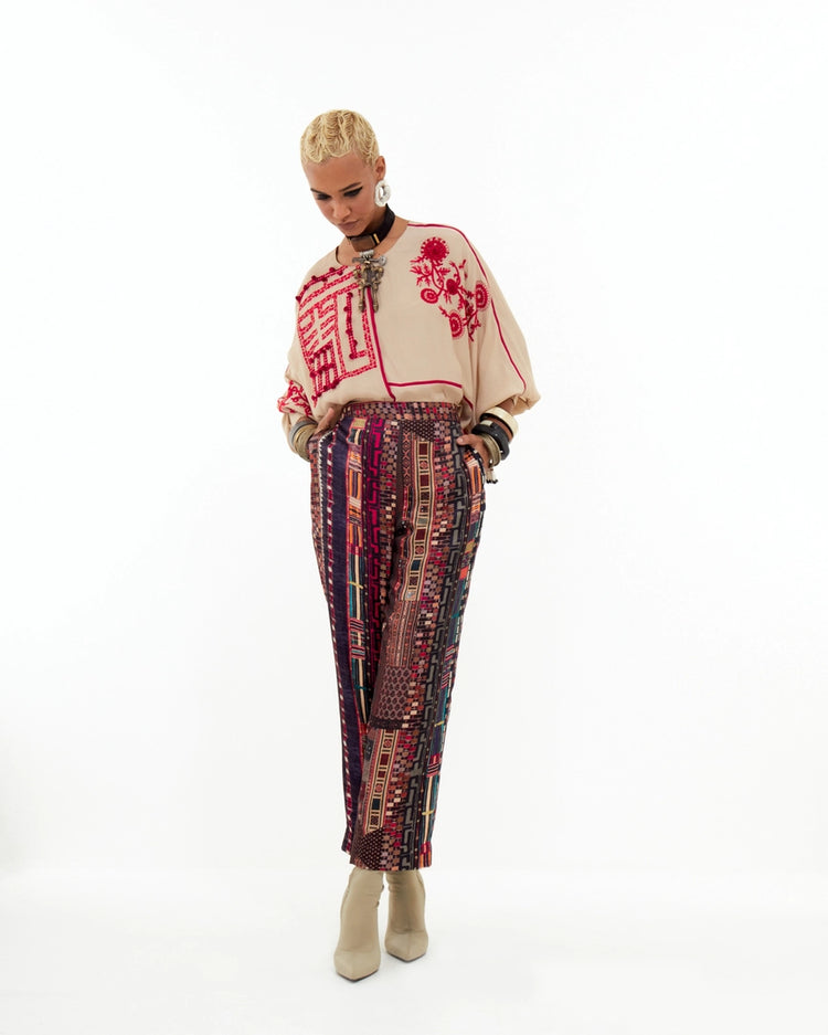 Trapeze solid shirt with inserts and raised Resham thread embroidery in sindoor with tassels, paired with straight trousers. No armholes, easy fit for all sizes with elasticated waist trousers.