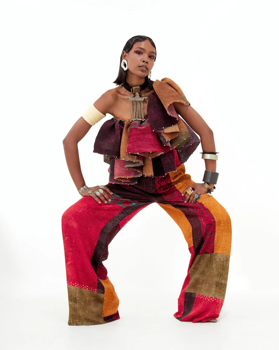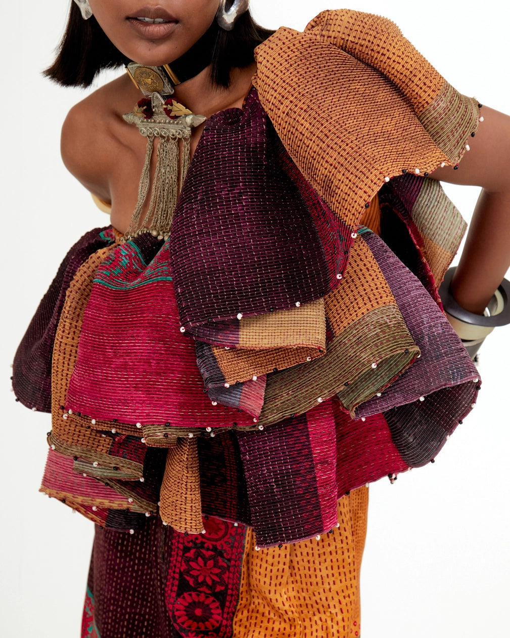 Ruffled one-shoulder voluminous top with black and white bead detailing. Fitted silhouette.