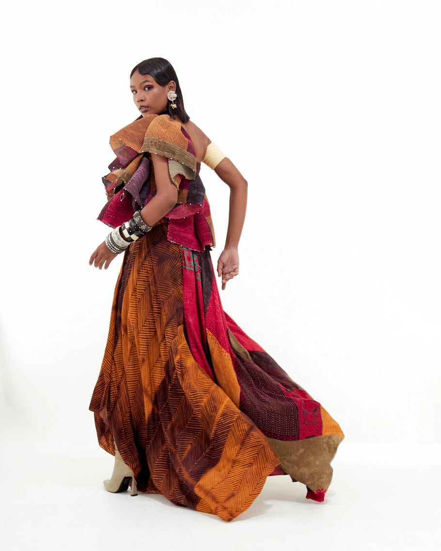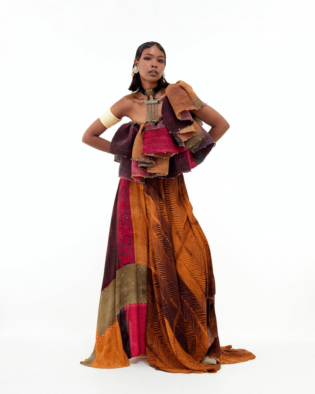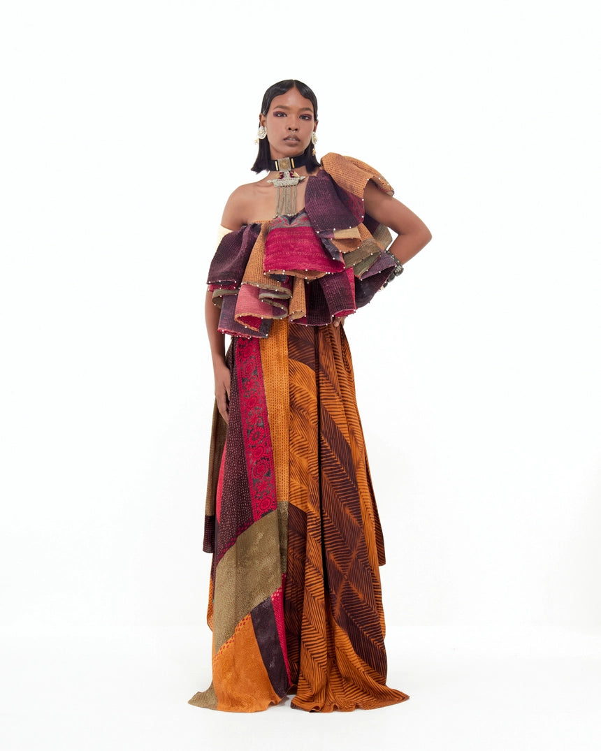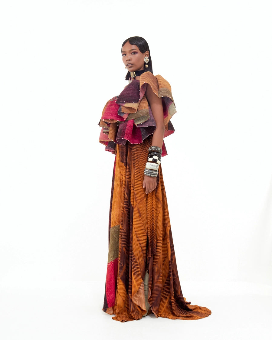 Ruffled one-shoulder voluminous top with flared skirt. Black and white bead detailing. Fitted top with elasticated waist skirt.