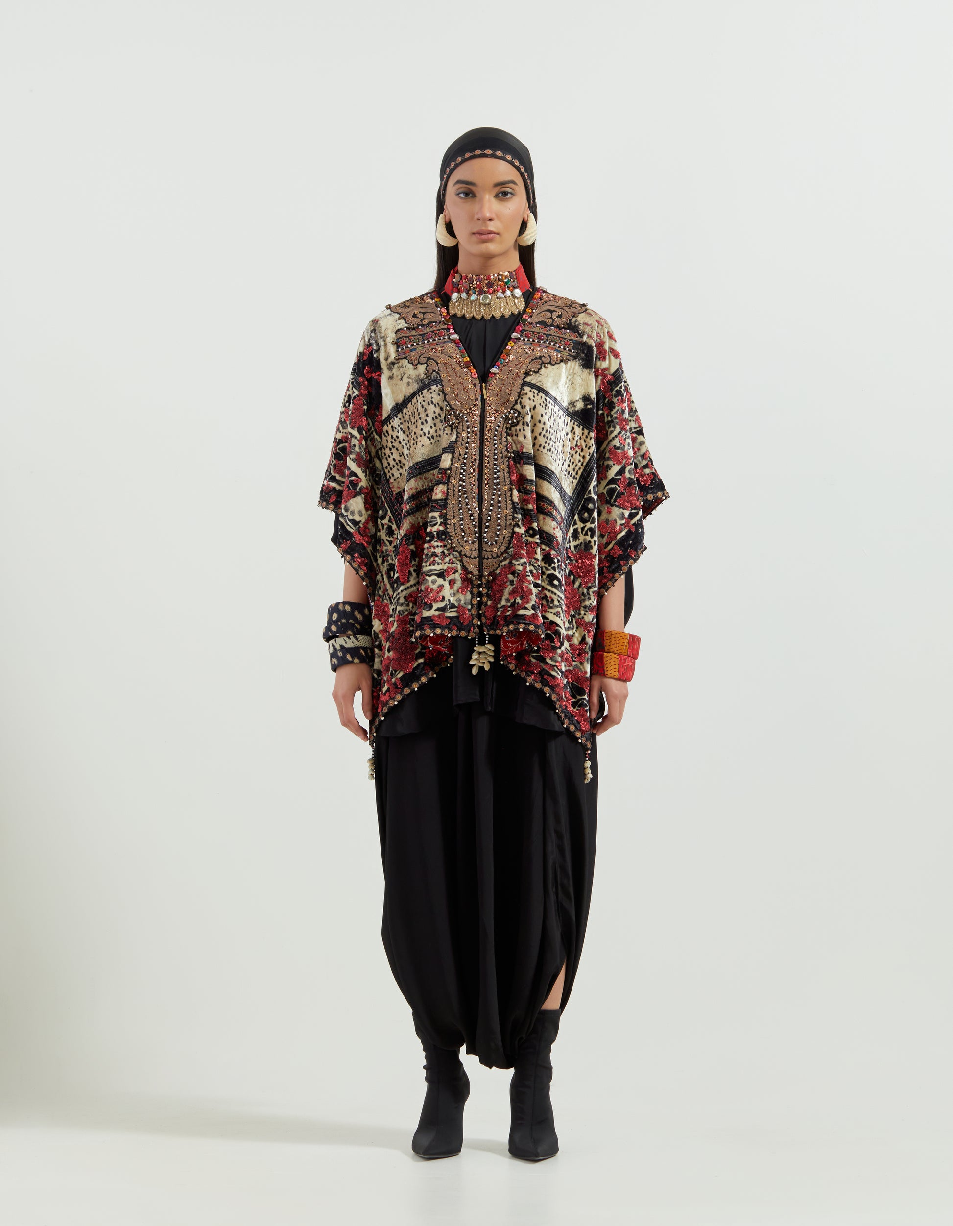 Embroidered yoke with dori, highlights, and tribal details. Features Resham thread embroidery, cowri shells, beads, and tassel accents. Free-size dupatta jacket without armholes.