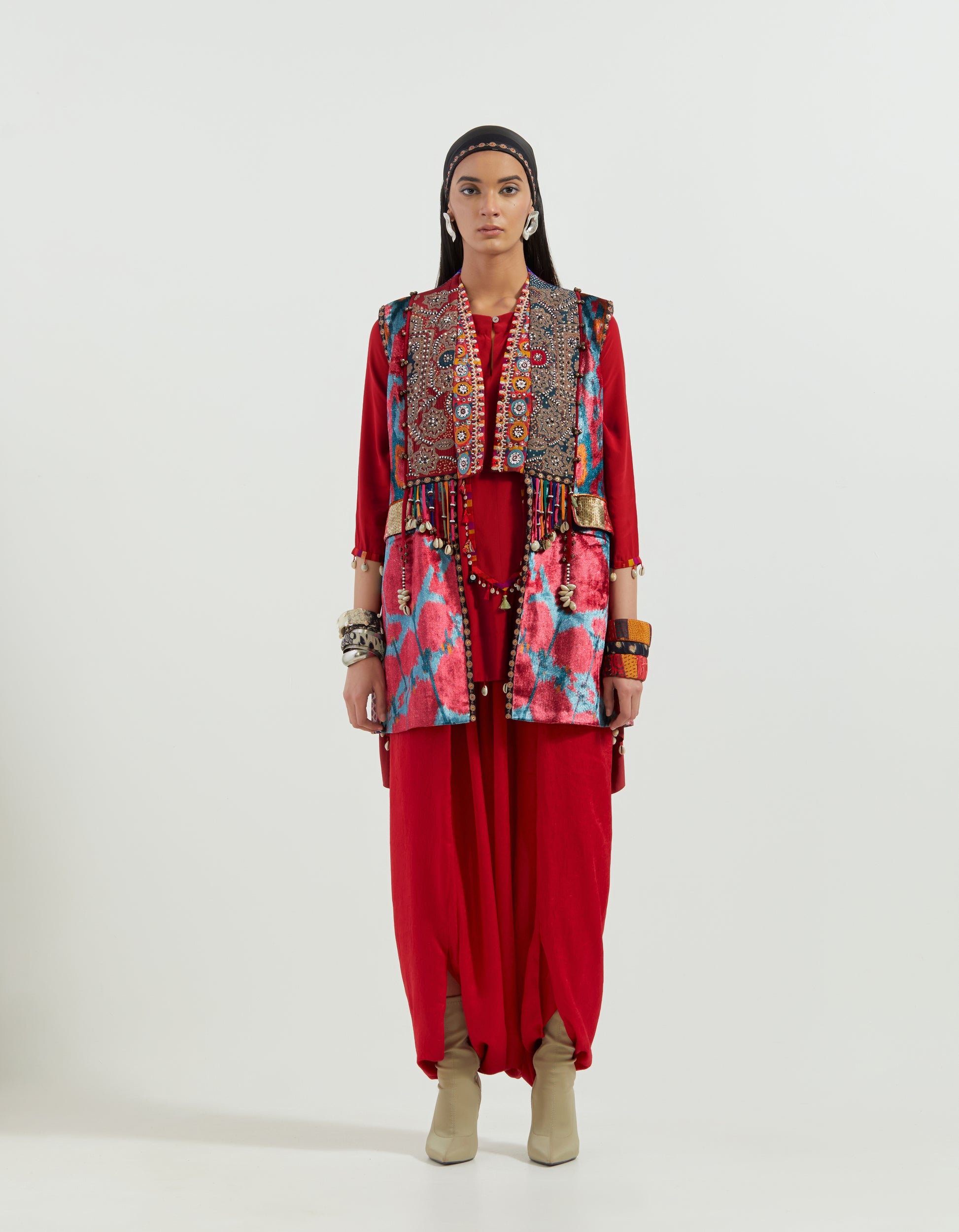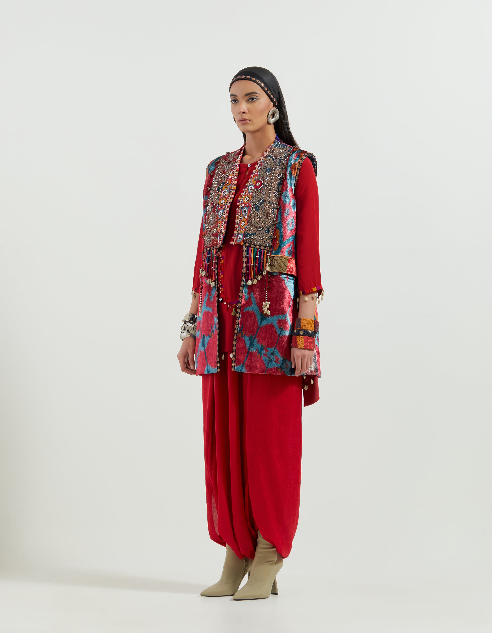 Yoke-embroidered classic open jacket paired with a relaxed-fit short solid kurti featuring printed inserts and draped trousers. Bead and tassel details. Open and structured sleeveless jacket with an easy-fit kurta and elasticated waist draped trousers.