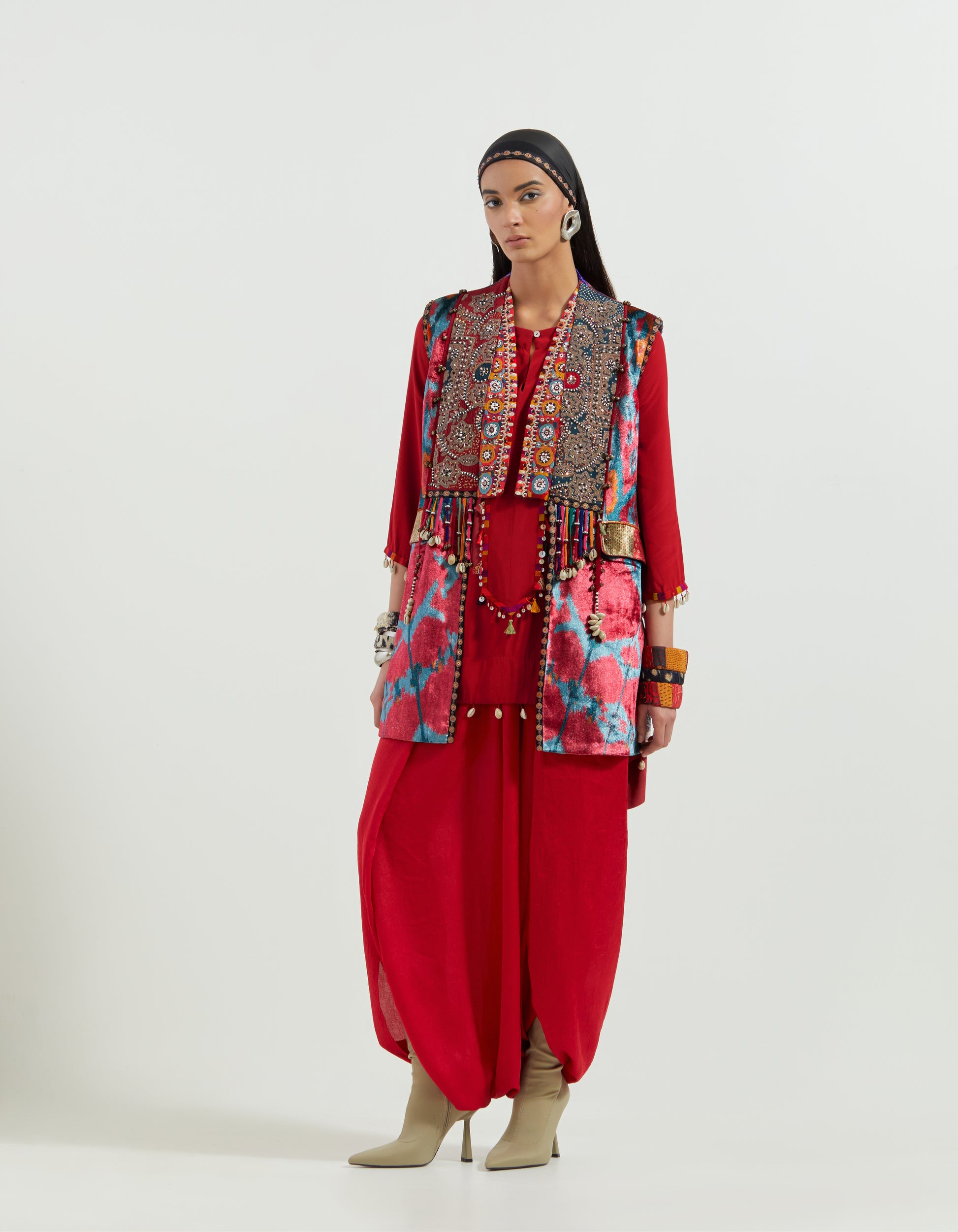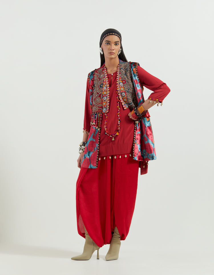 Yoke-embroidered classic open jacket with tribal details. Resham thread embroidery, cowrie shells, bead, and thread tassel accents. Open and structured sleeveless jacket.