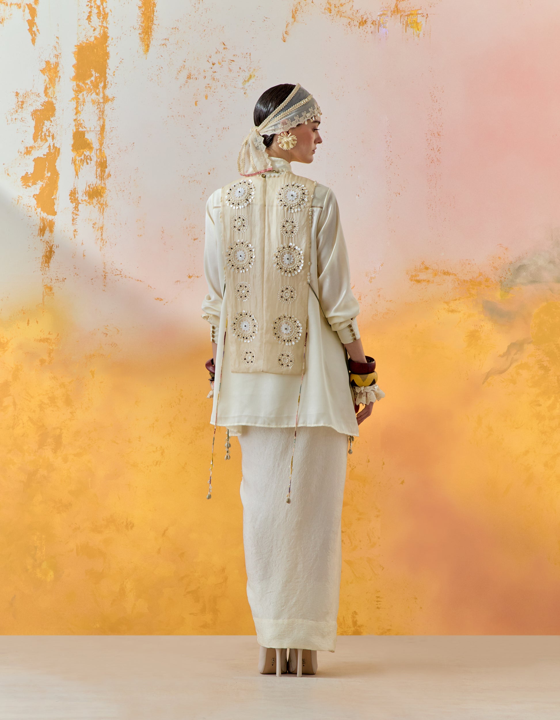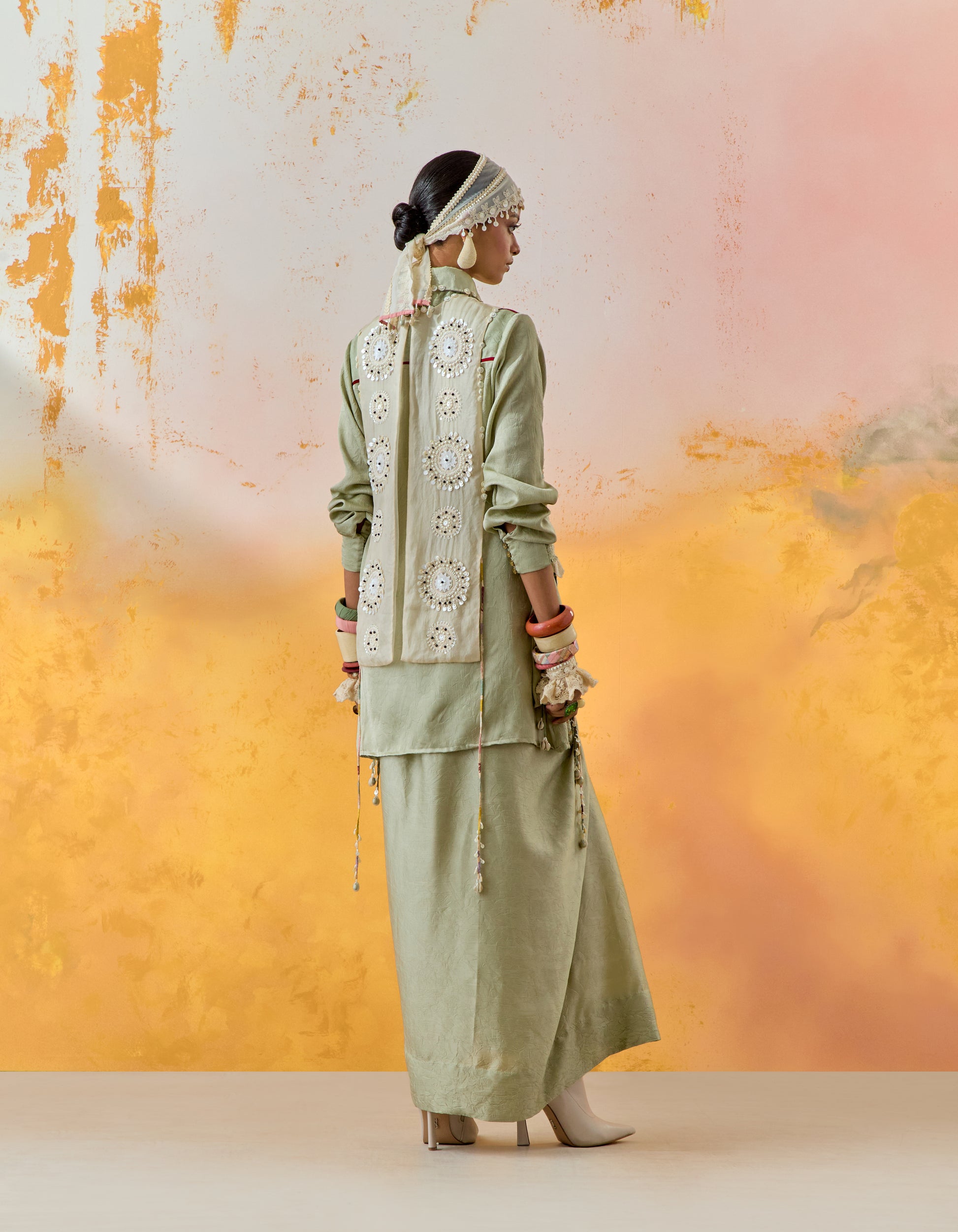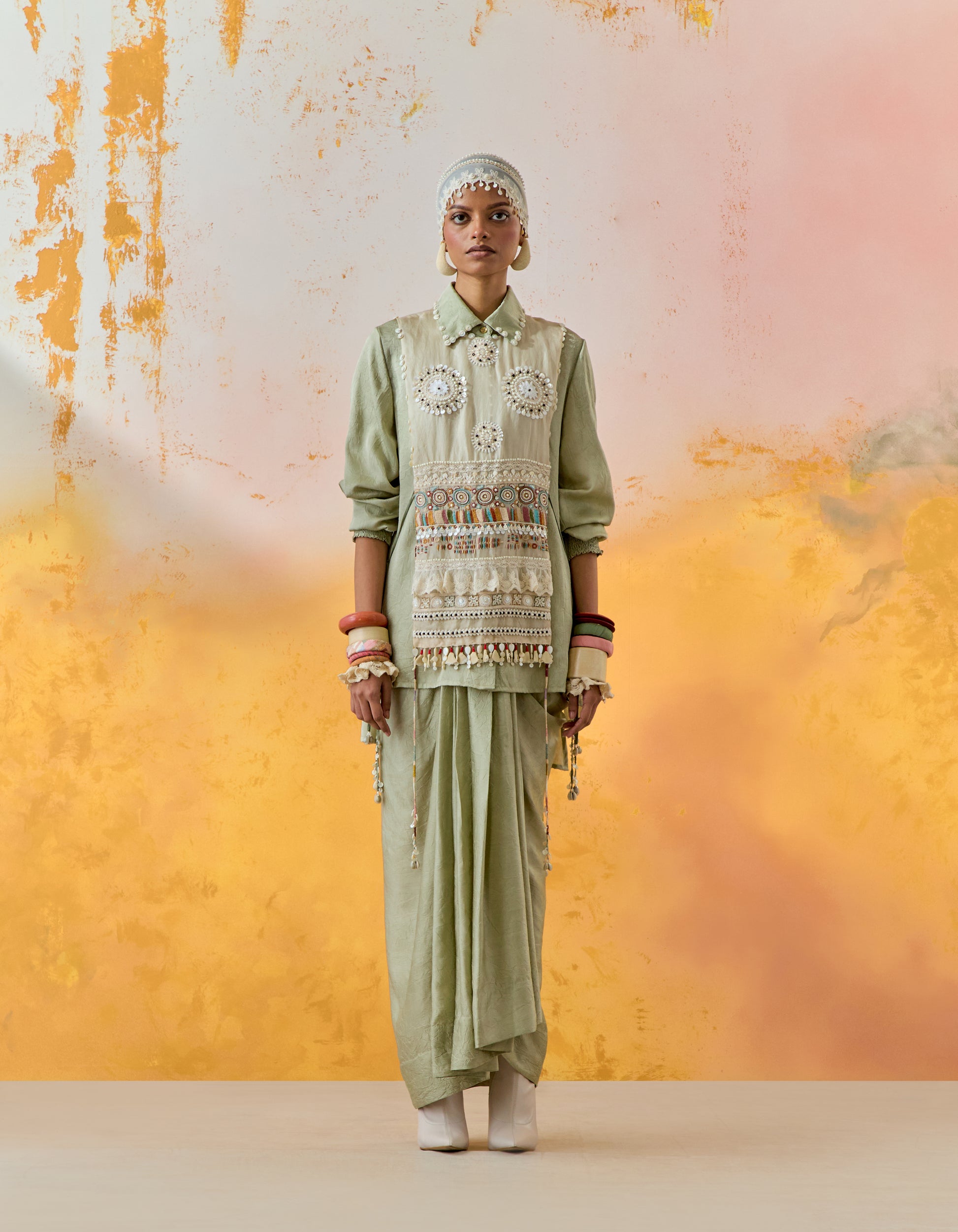Exquisitely embroidered bib adorned with tribal tassel accents. Featuring intricate Resham thread embroidery and delicate beadwork, the highlighted tribal yoke adds a touch of elegance, while the playful tassel details complete the look. This free-size bib design is crafted without armholes for a chic, contemporary silhouette.