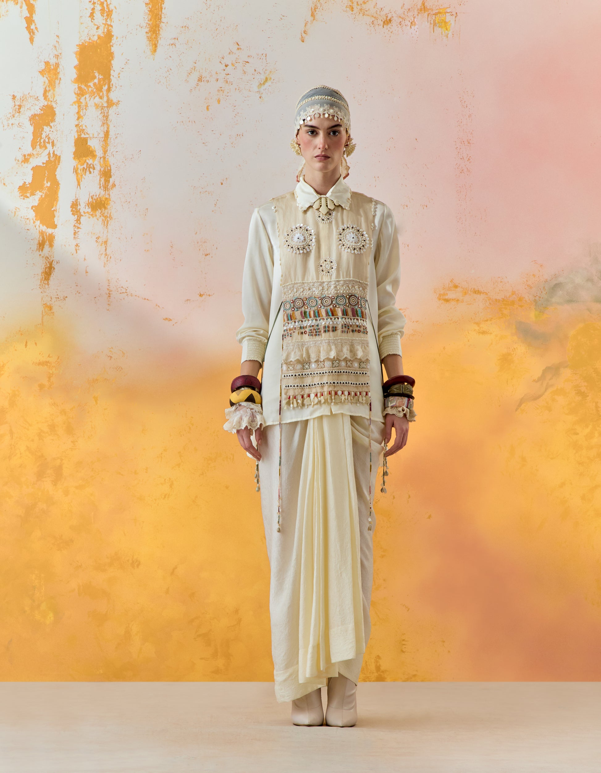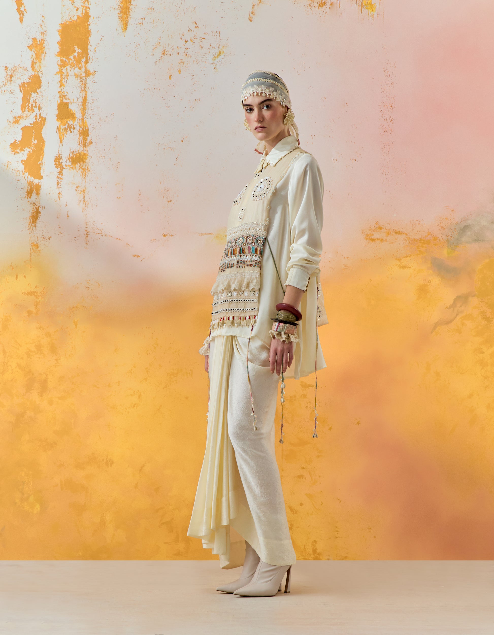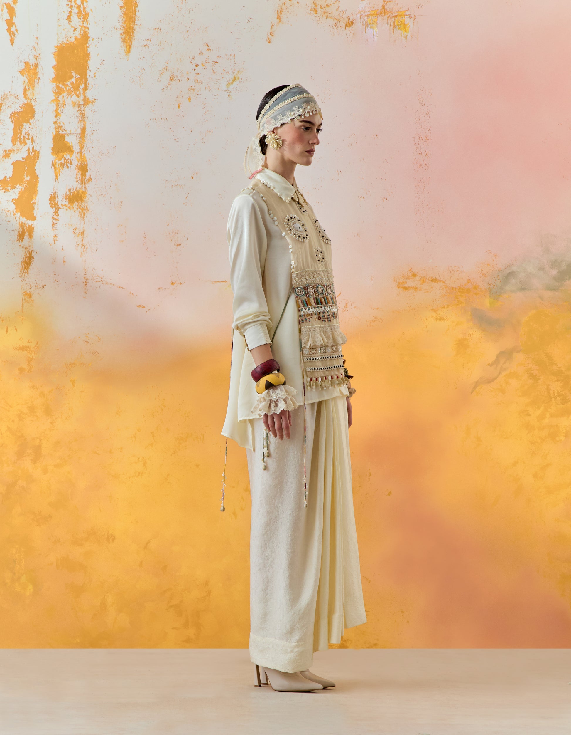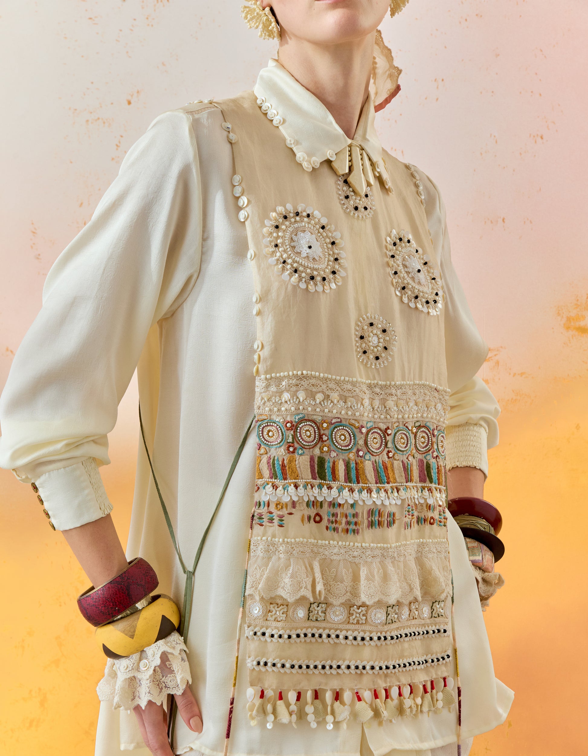 Textured solid-coloured straight shirt featuring a beaded collar and raglan sleeves, paired with a textured solid-coloured pleated skirt. The ensemble is complemented by an overlay of a free-size bib with intricate beadwork and Resham thread embroidery, along with delicate lace details. The shirt offers an easy fit, while the pleated skirt features an elasticated waist for comfort and style.