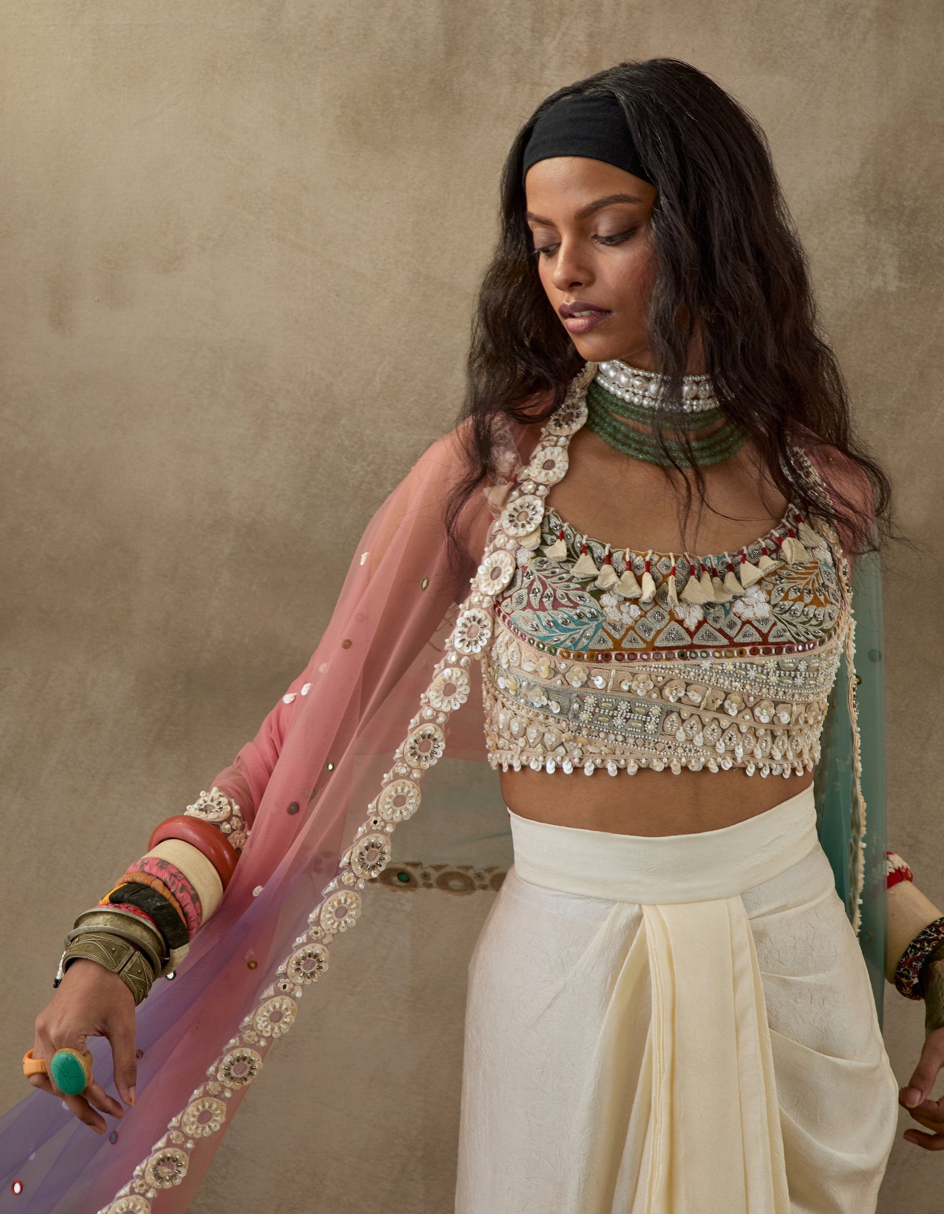 Full embroidered blouse with solid color textured skirt and sheer ombre constellation dupatta.