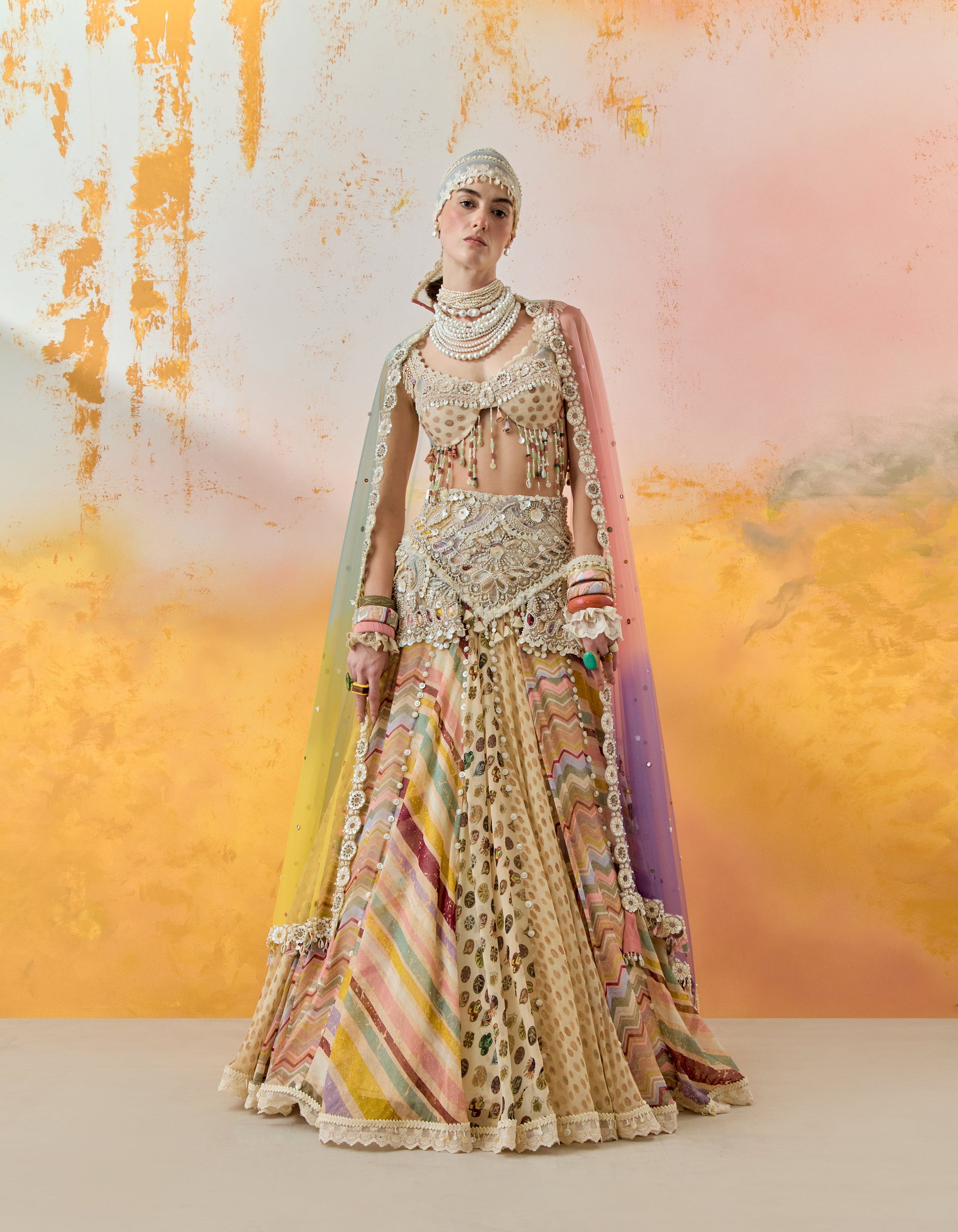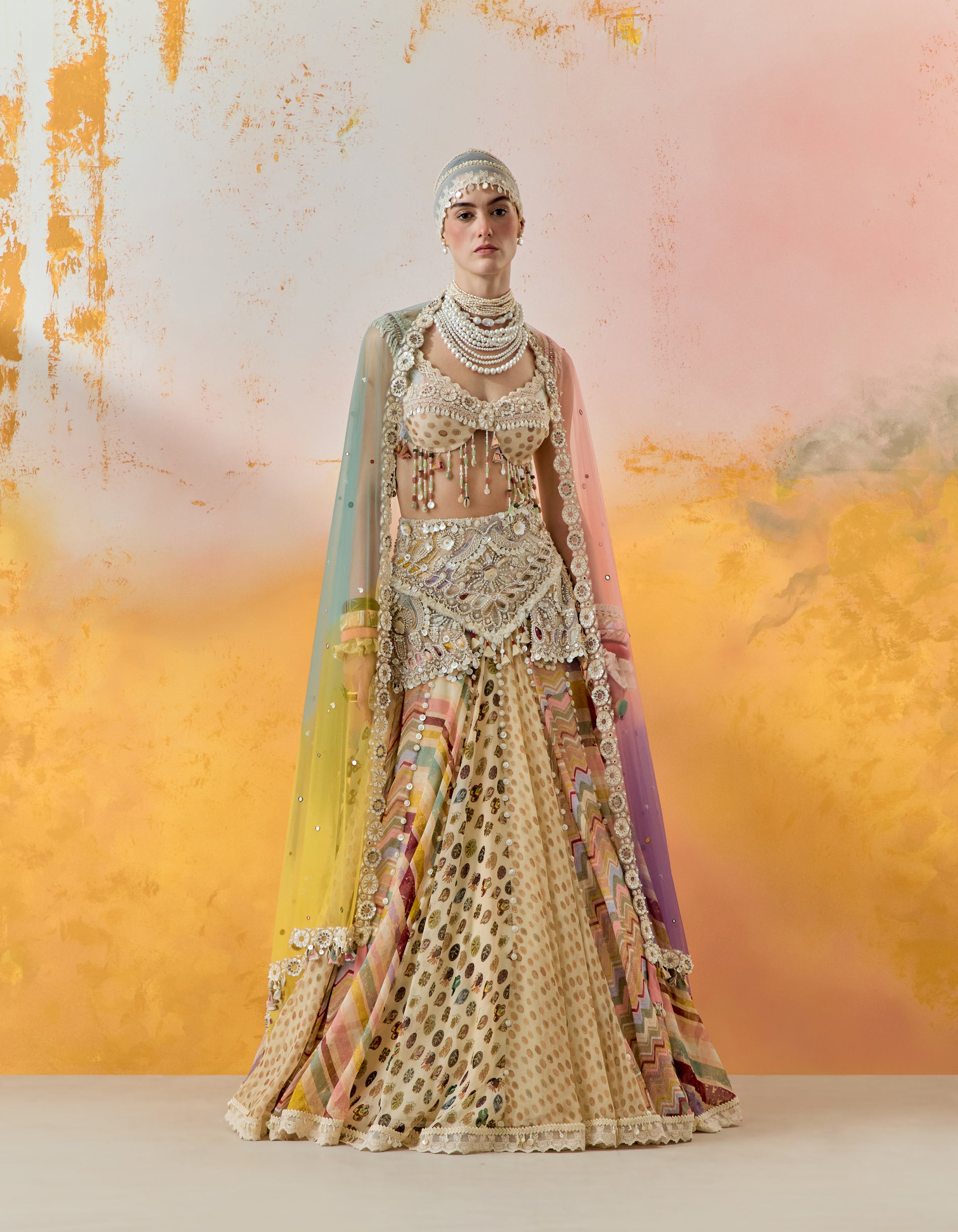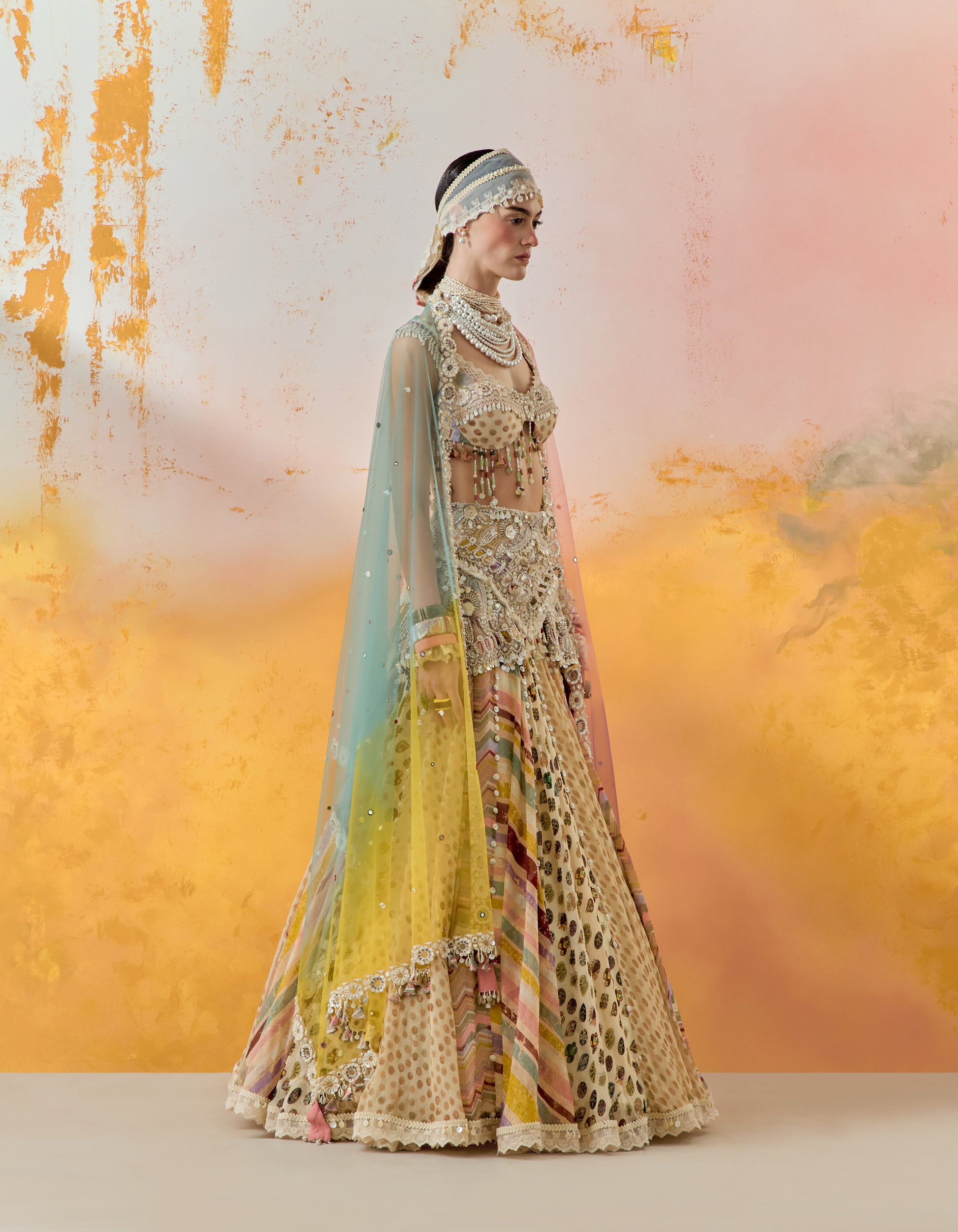 Basque bralette with tribal tasselation worn with draped mother of pearl corset waistband and sheer ombre constellation dupatta.