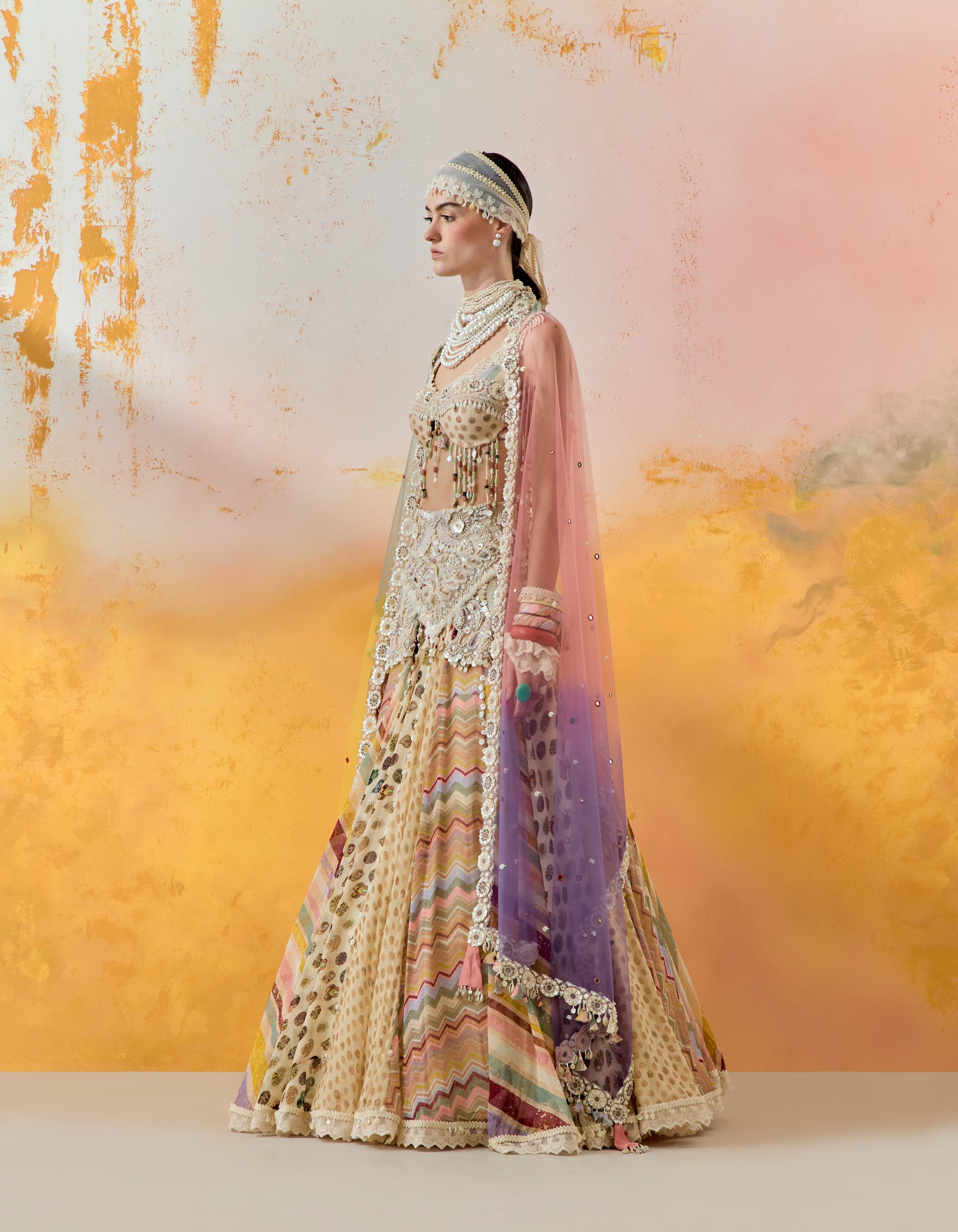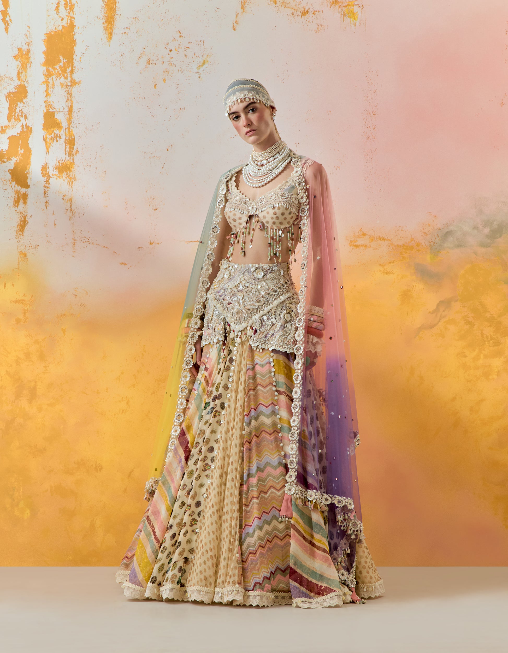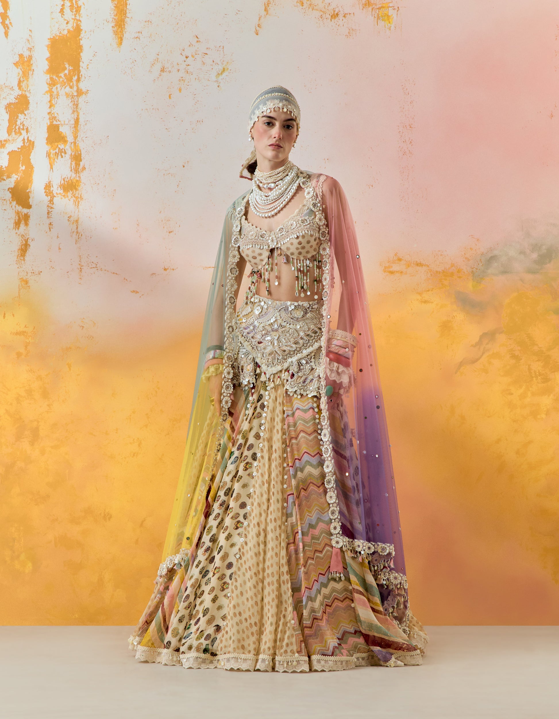 Basque bralette with tribal tasselation worn with draped mother of pearl corset waistband and sheer ombre constellation dupatta.