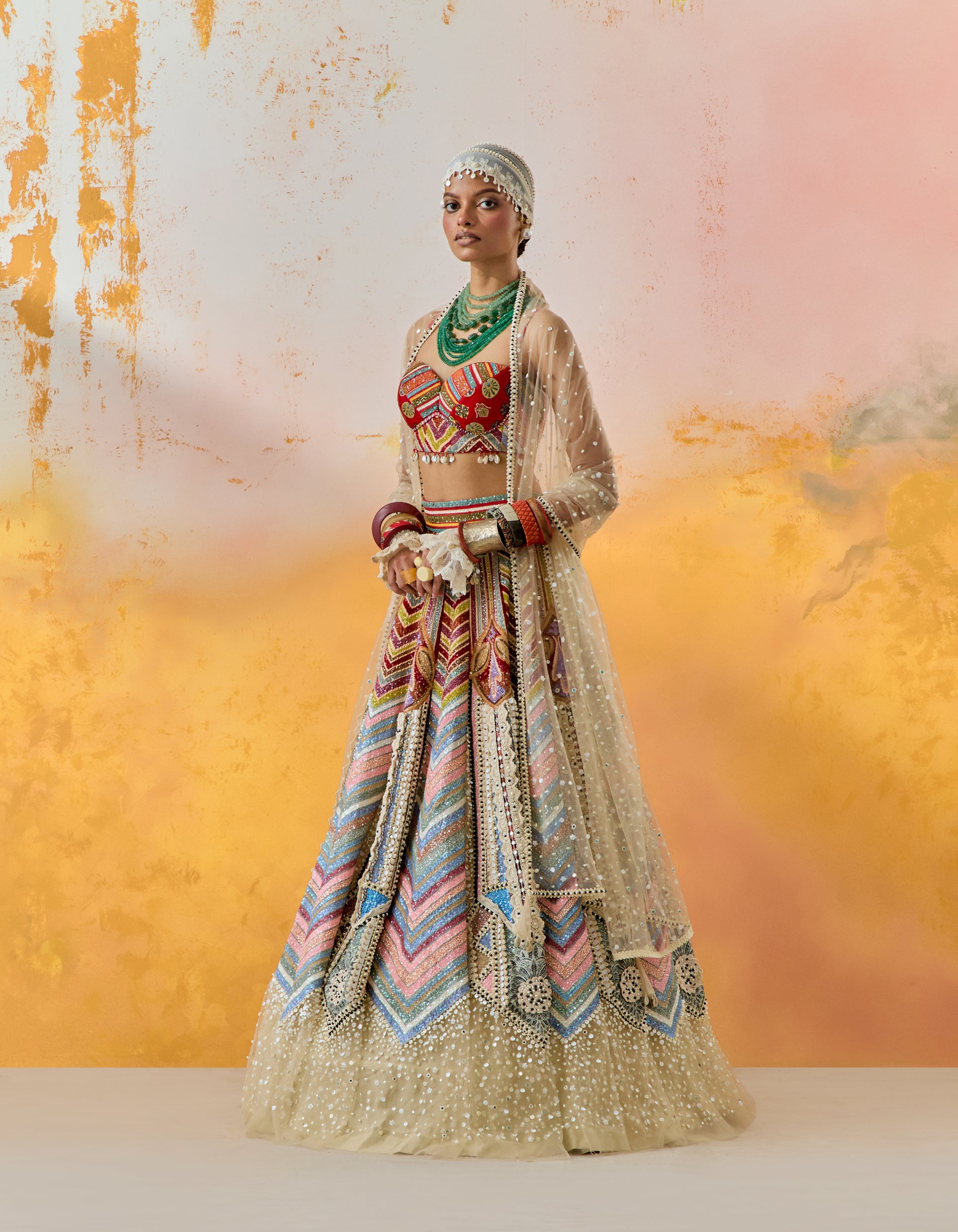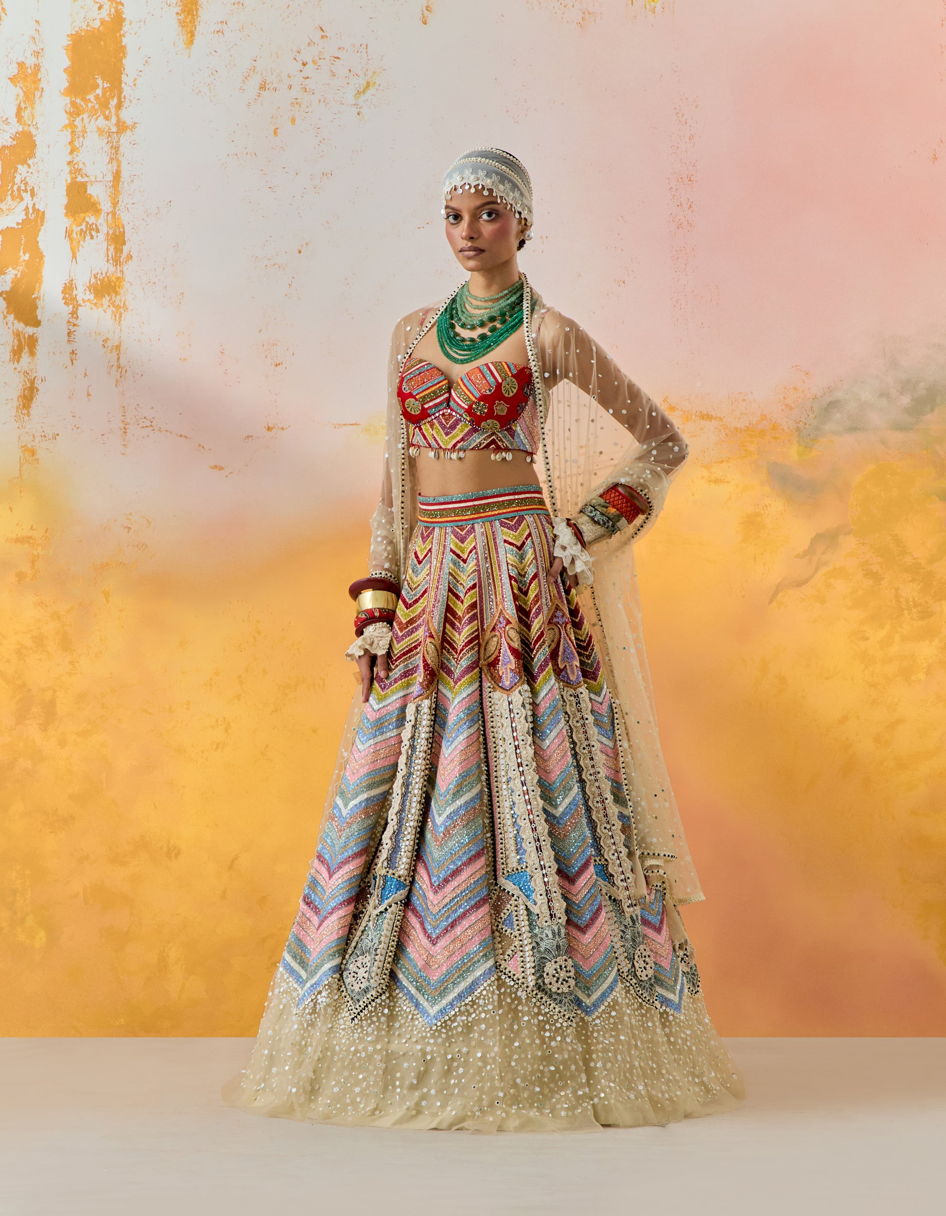 Kama butti print bralette worn with chevron tribal ombre sheathed kalidar lehnga with graded mother of pearl embroidery, and ivory contellation dupatta