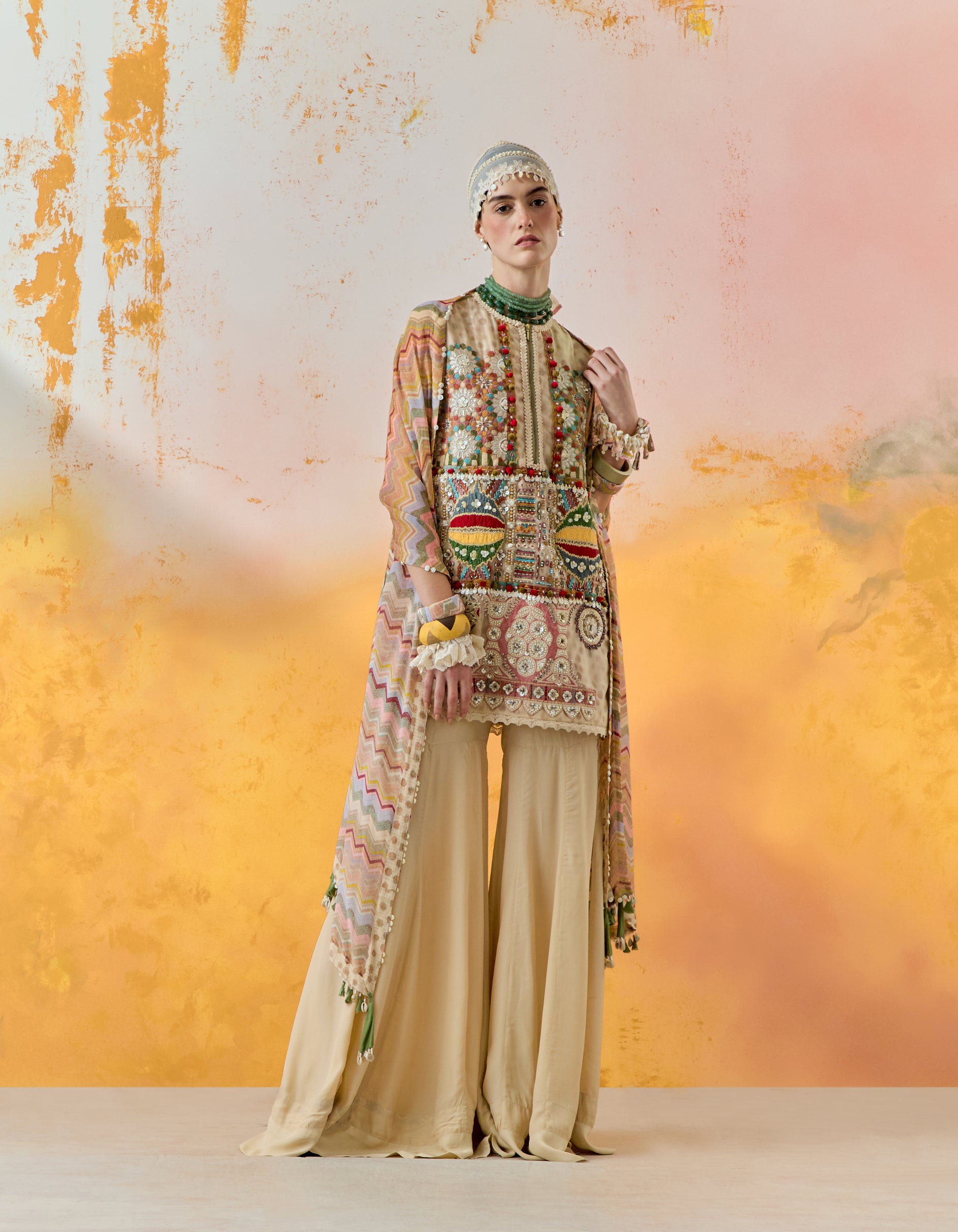 An A-line shift dress featuring an embroidered front and a printed back, paired with solid-coloured sharara trousers and a sheer silk printed dupatta. Showcasing Moti Bharat and Ikkat Resham threadwork with bead detailing in contrasting Afghan artwork, this ensemble blends artisanal craftsmanship with effortless elegance. The easy-fit dress, elasticated waist trousers, and flowing dupatta ensure both style and comfort.