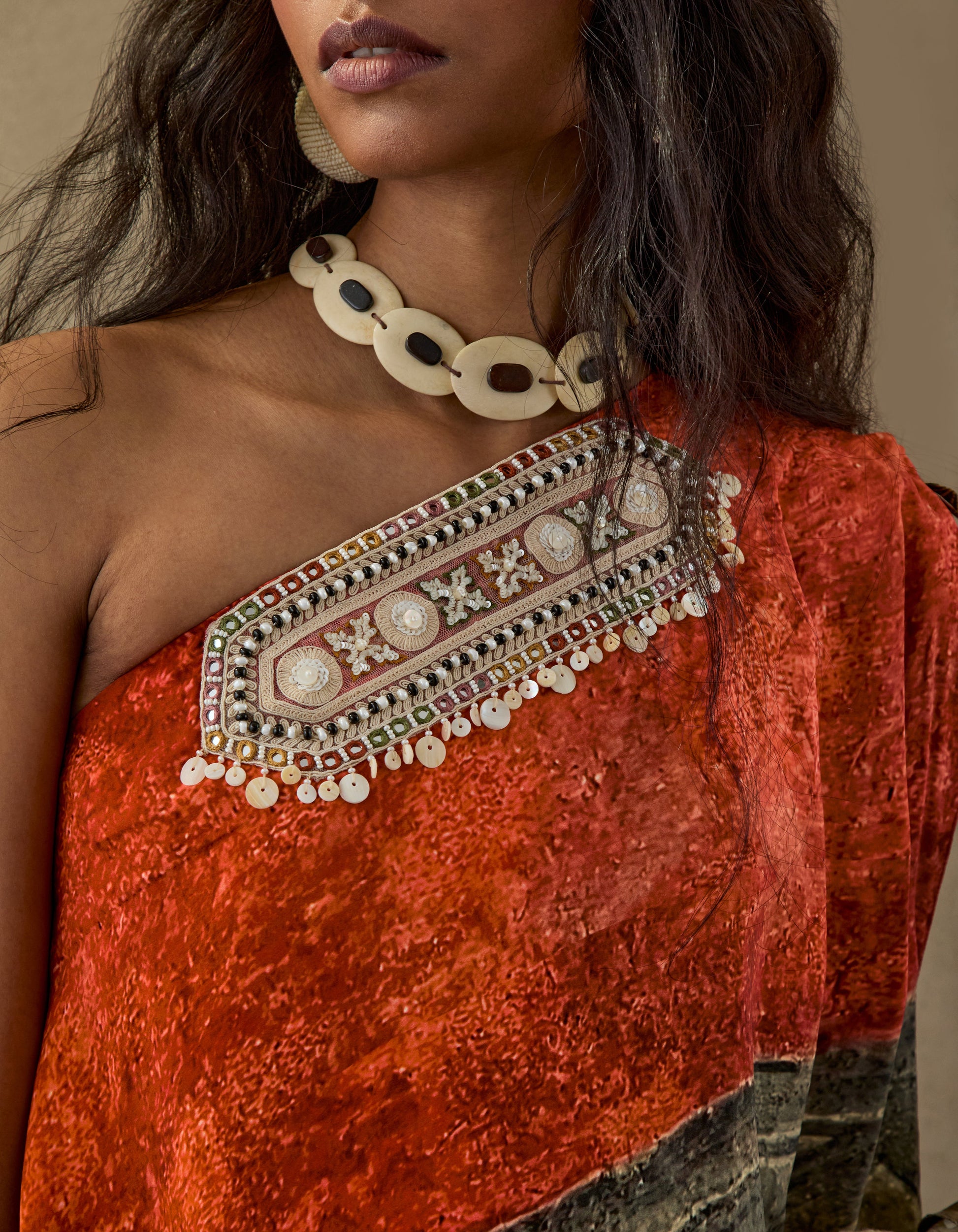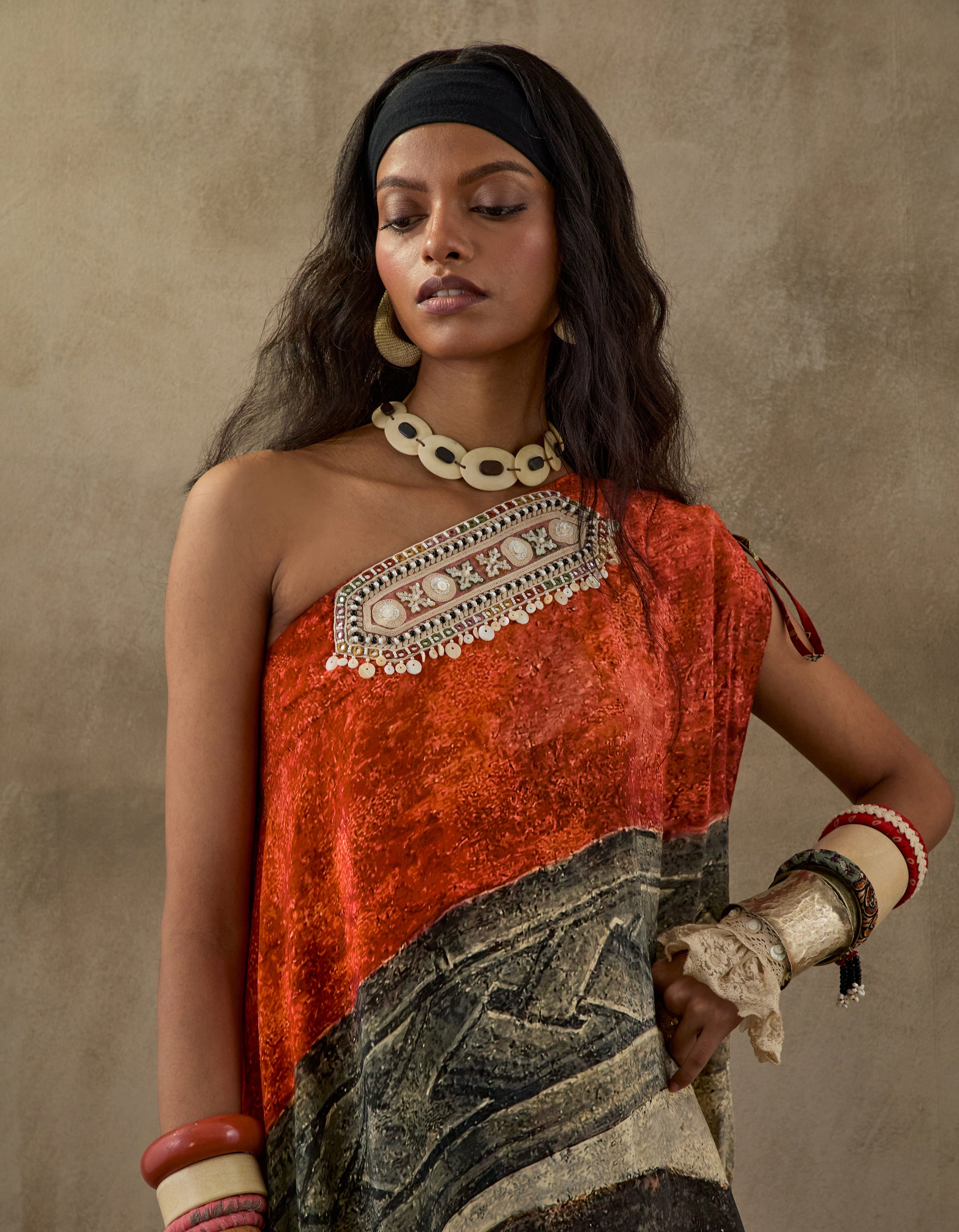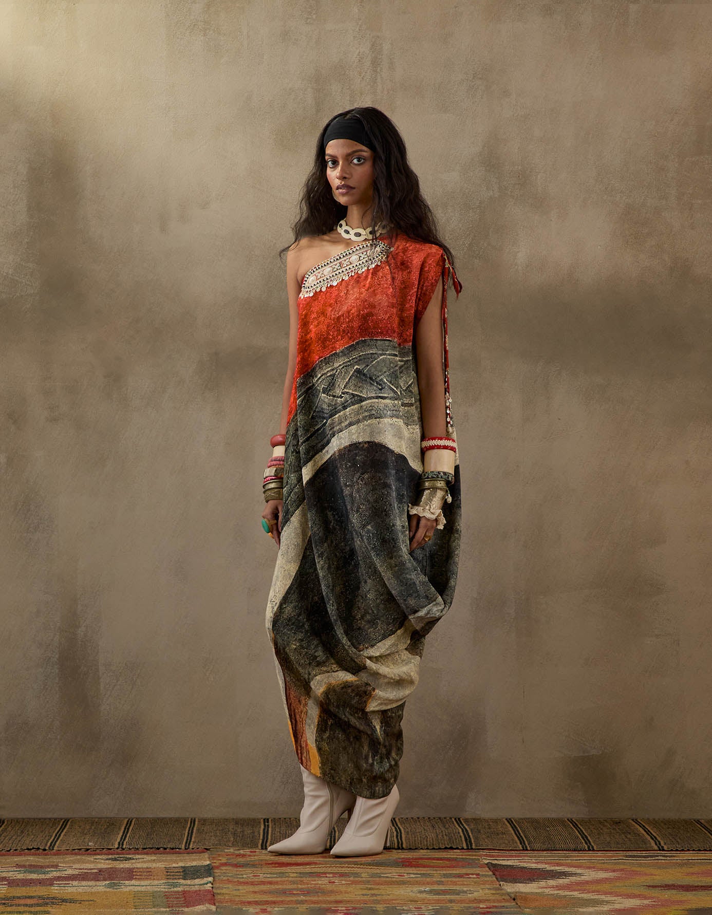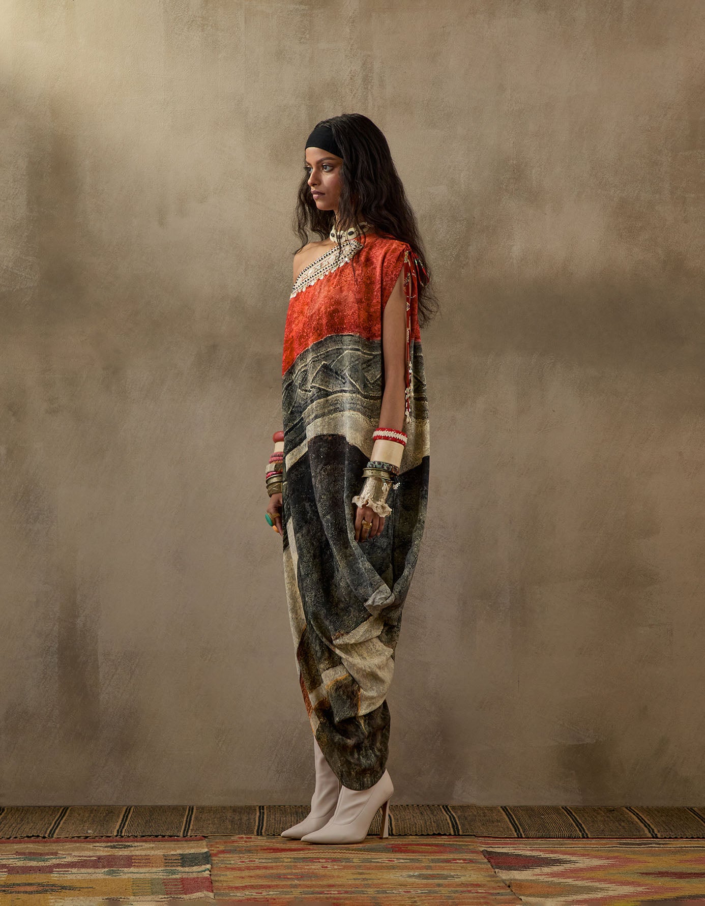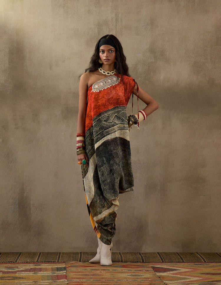 Printed one shoulder drape dress with embroidered detailing at yoke.