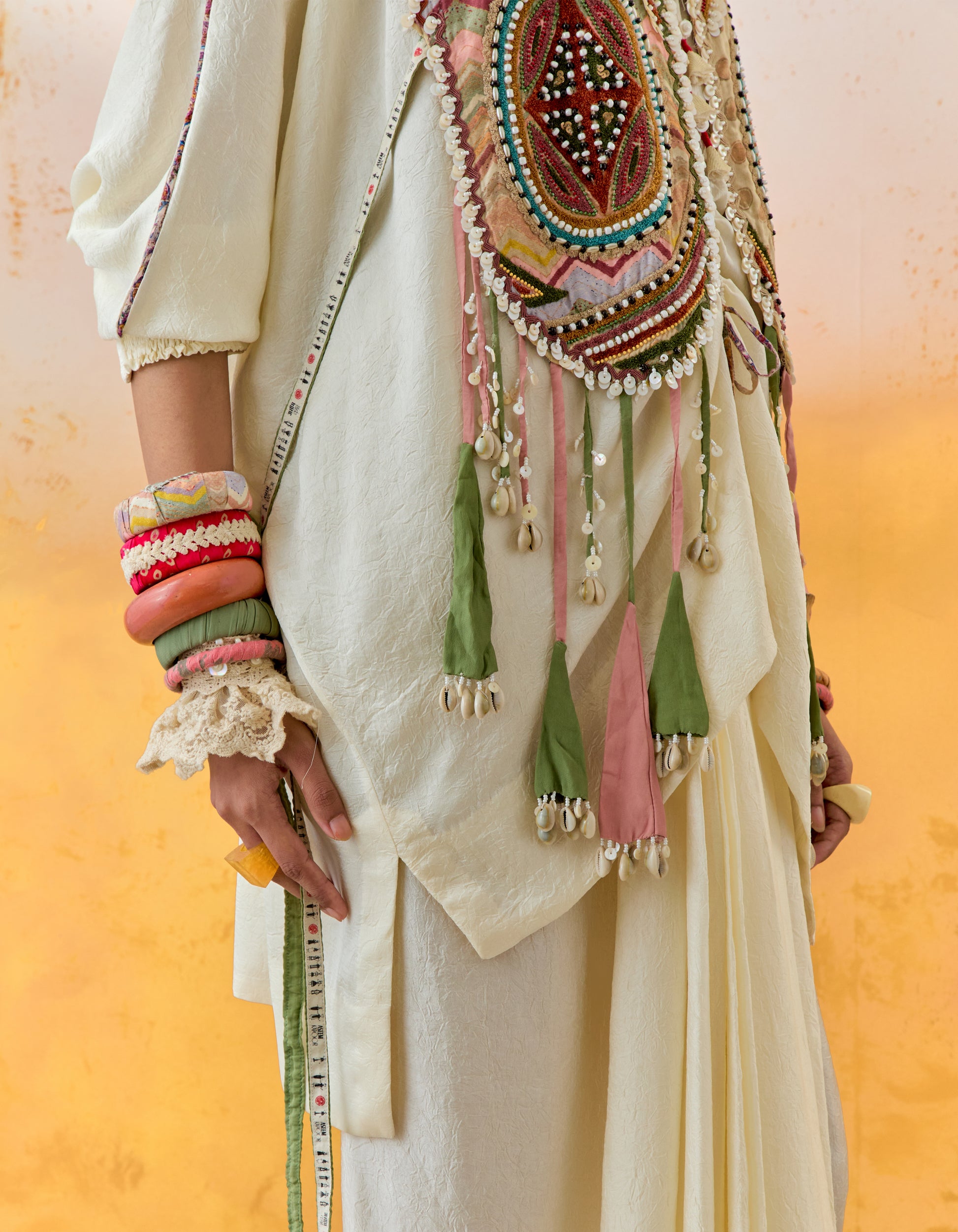Embroidered gilet paired with a textured solid-coloured, relaxed-fit short trapeze kurti with inserts and a textured solid-coloured pleated skirt. The design features Resham thread embroidery with beadwork, highlighted tribal yoke, and tassel details. The kurta offers an easy fit, complemented by an elasticated waist skirt and a free-size gilet for a relaxed and stylish look.