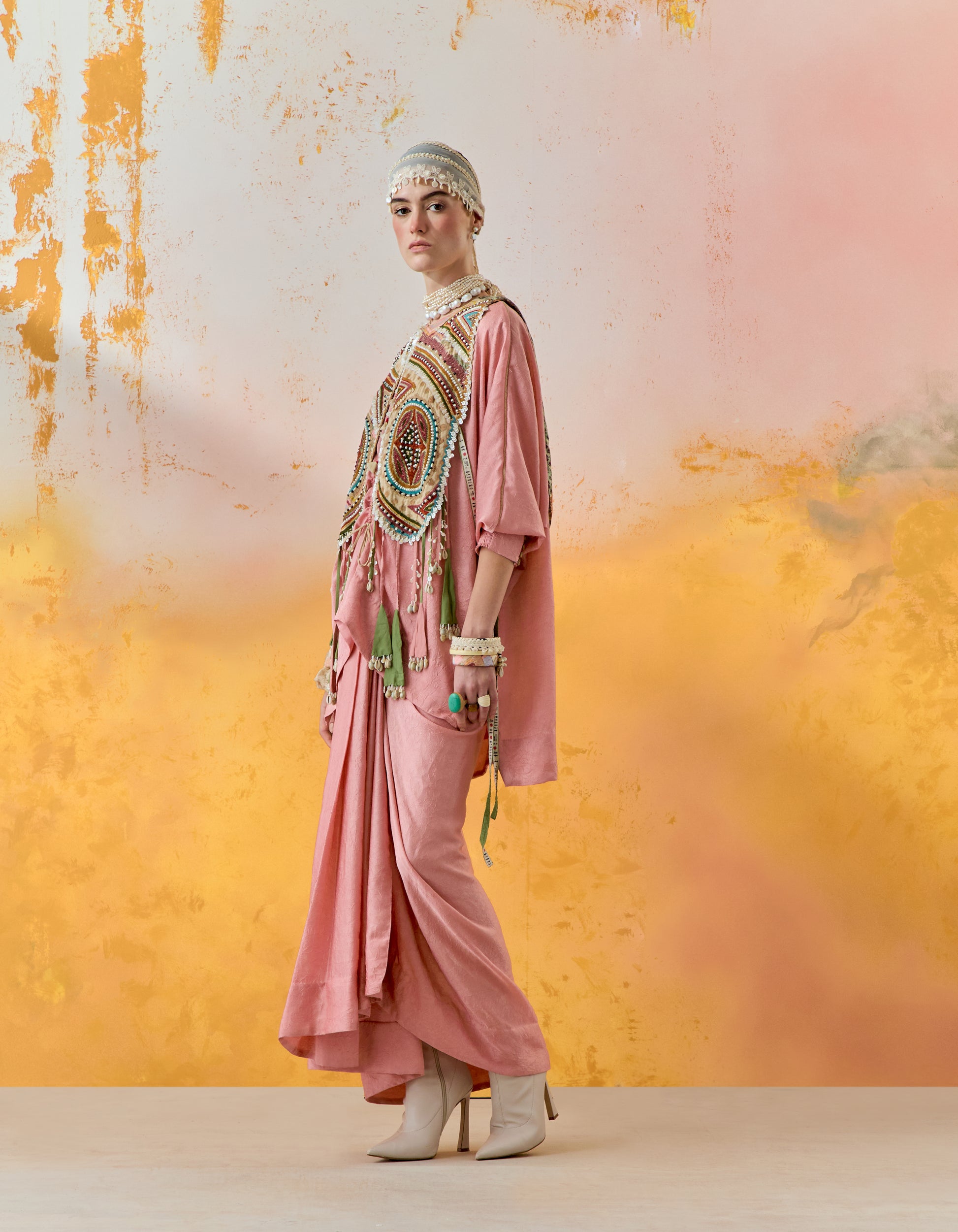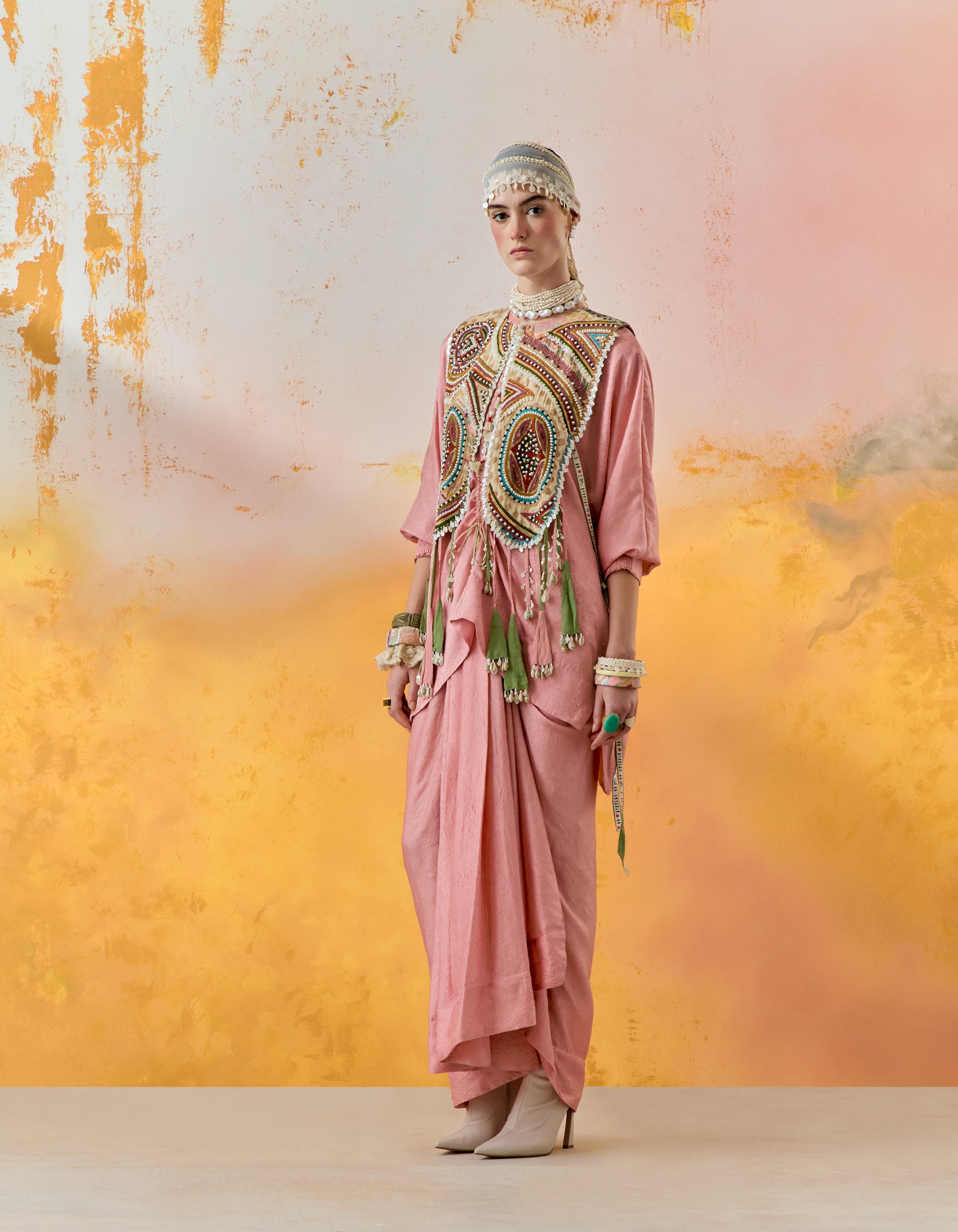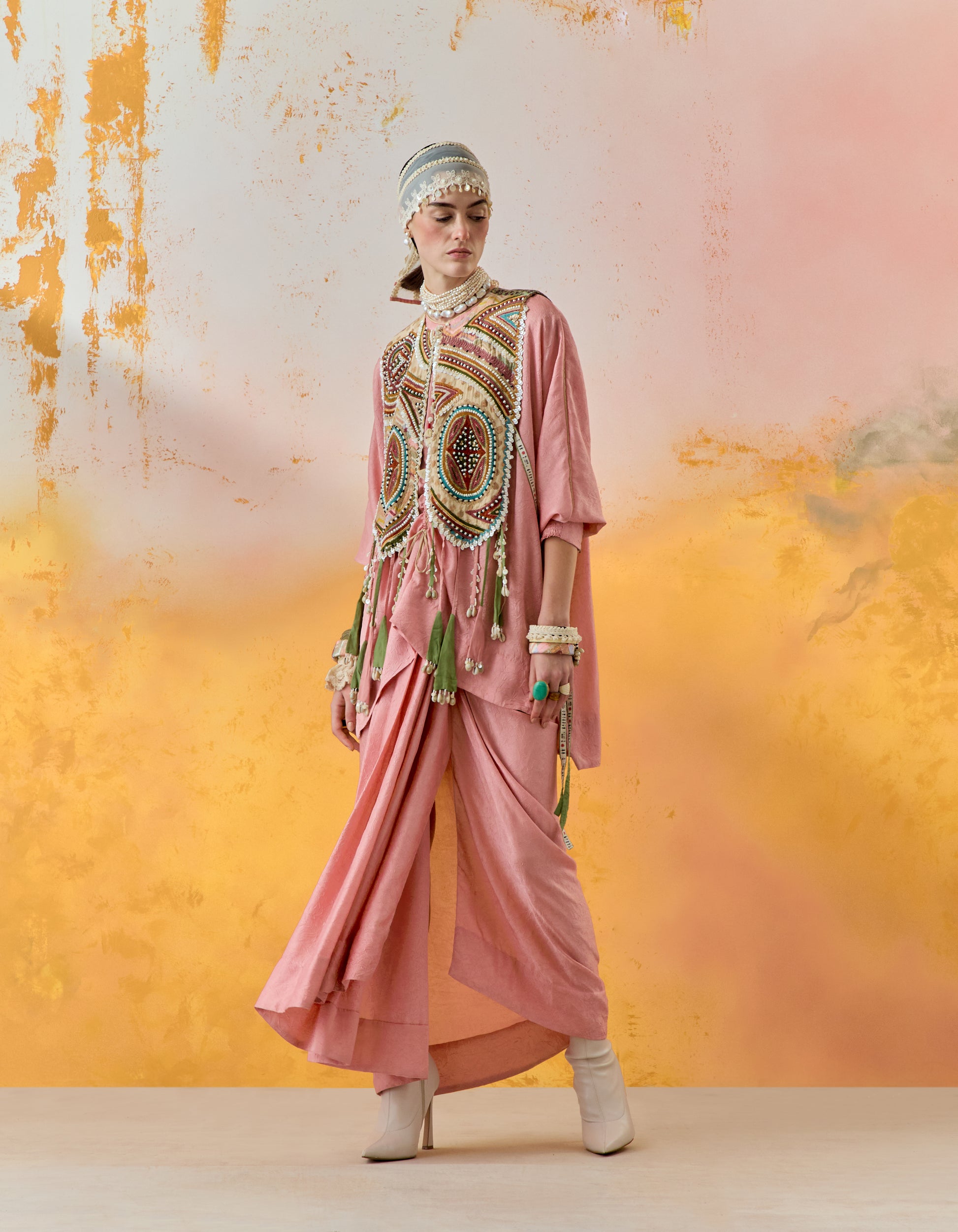 An exquisitely embroidered gilet, paired with a textured solid-coloured relaxed fit short trapeze kurti featuring intricate inserts. The ensemble is completed with a beautifully pleated textured solid-coloured skirt. Resham thread embroidery, delicately woven beadwork, and a tribal-inspired yoke, all accentuated with graceful tassel details. The easy-fit kurta is complemented by an elasticated waist skirt, while the free-size gilet adds a touch of effortless elegance.