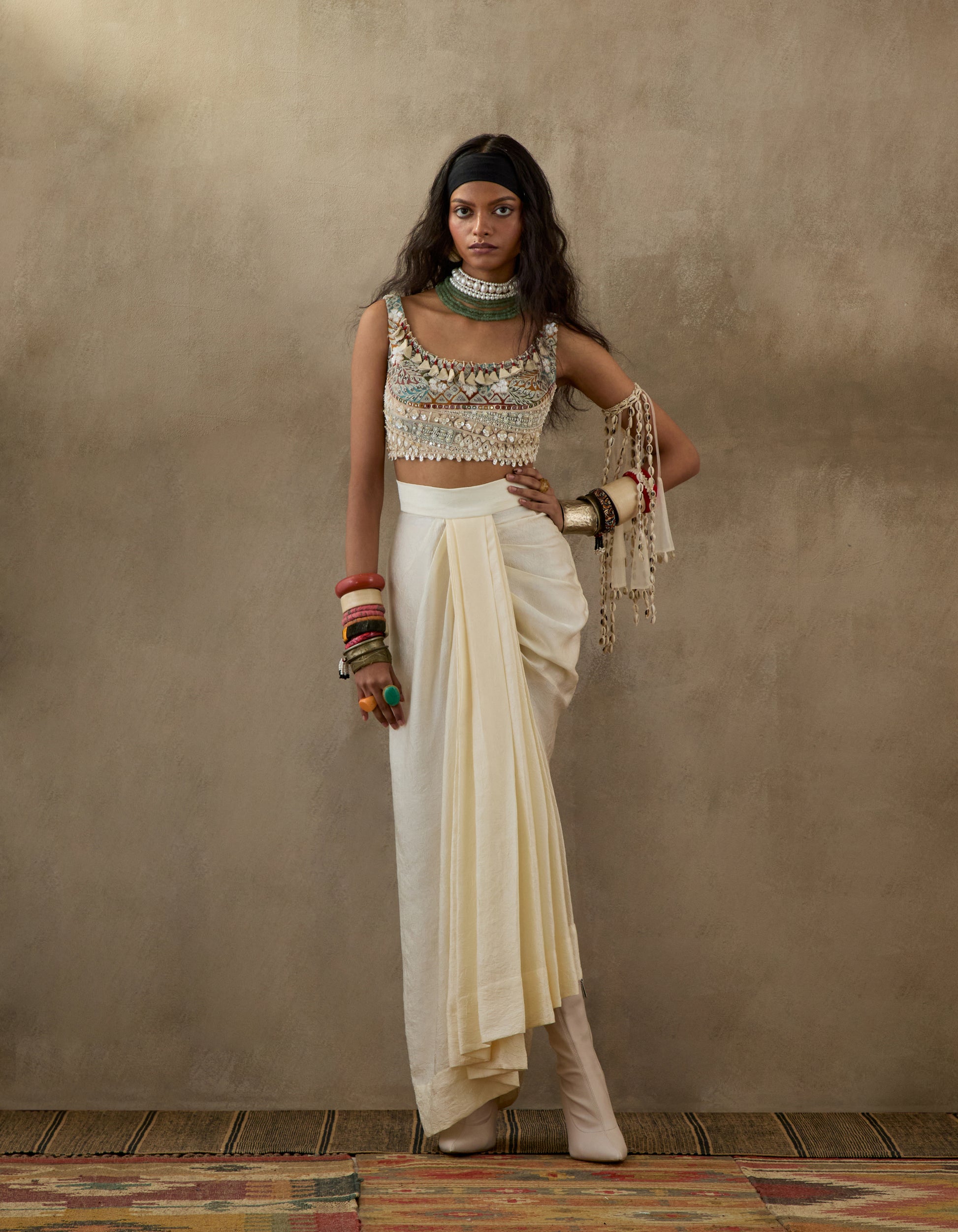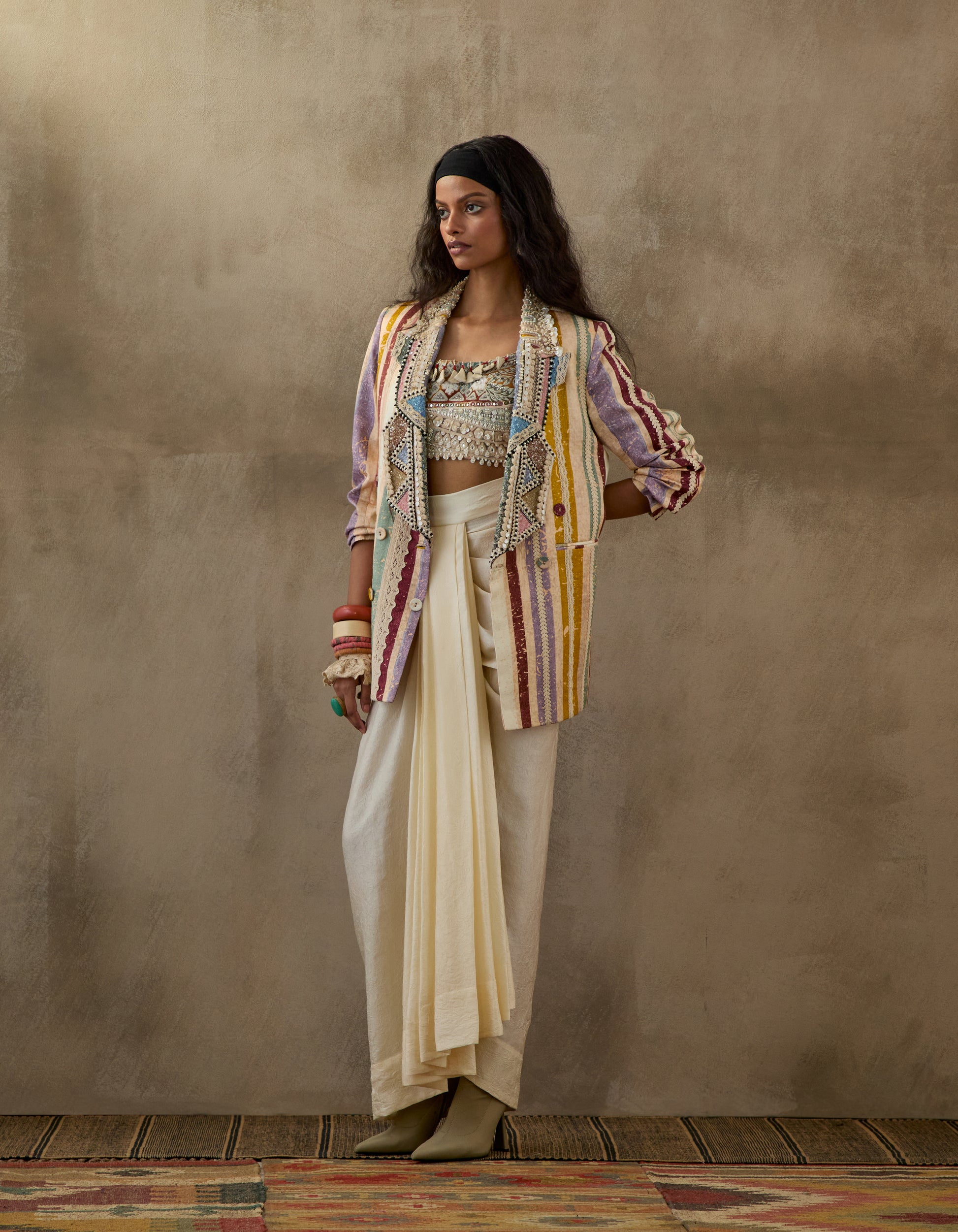 A full embroidered blouse paired with a solid-coloured textured skirt and an embroidered printed double-breasted jacket. Featuring intricate Resham thread embroidery, M.O.P. bead accents, and tassel details, this ensemble combines a body-fitted blouse, an elasticated waistband skirt, and a buttoned structured jacket. The design offers a balanced blend of tailored sophistication and relaxed elegance.