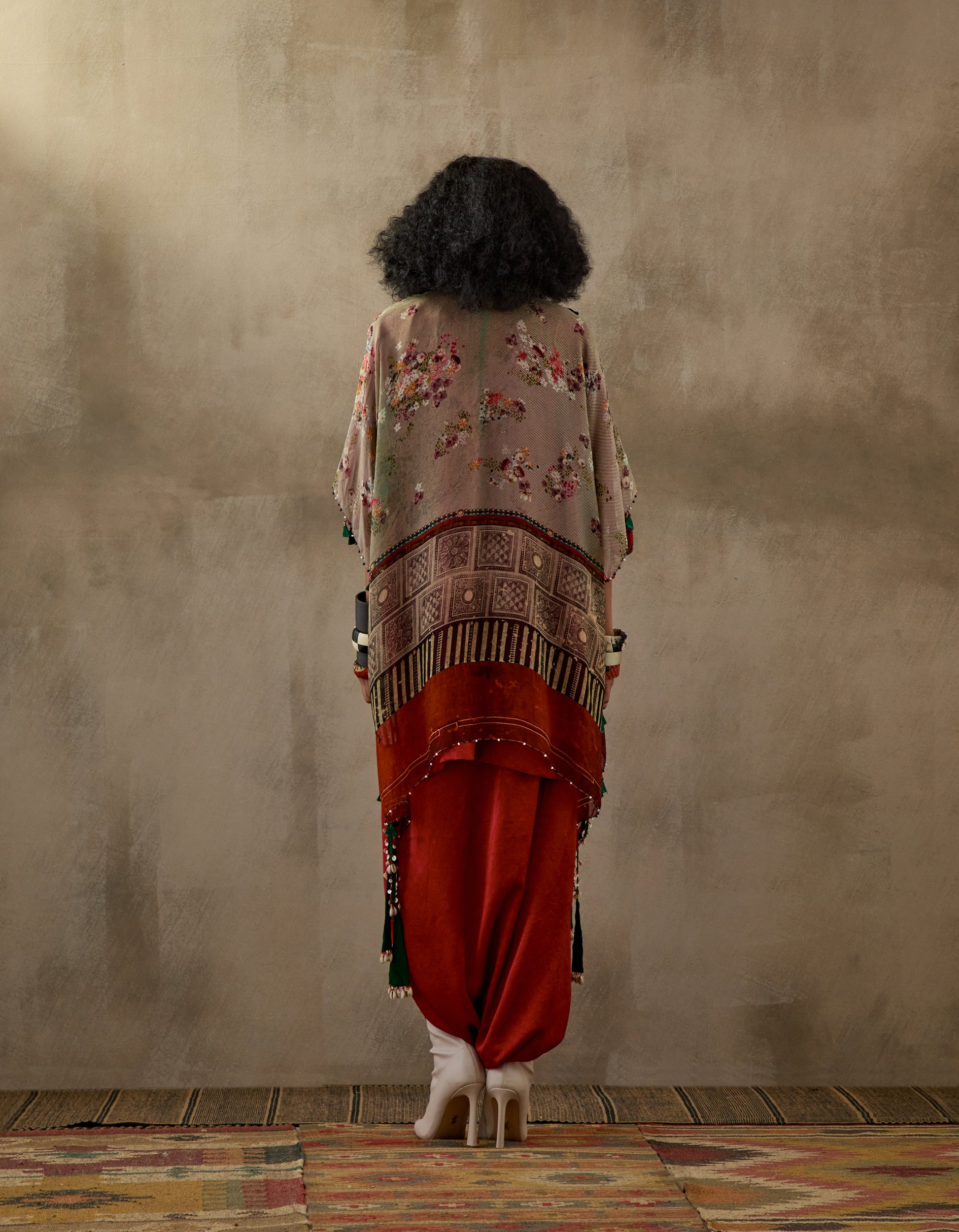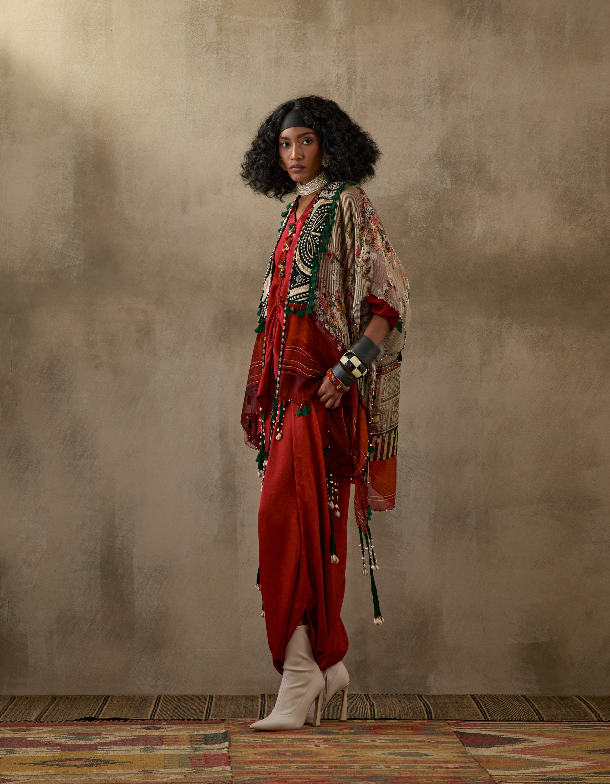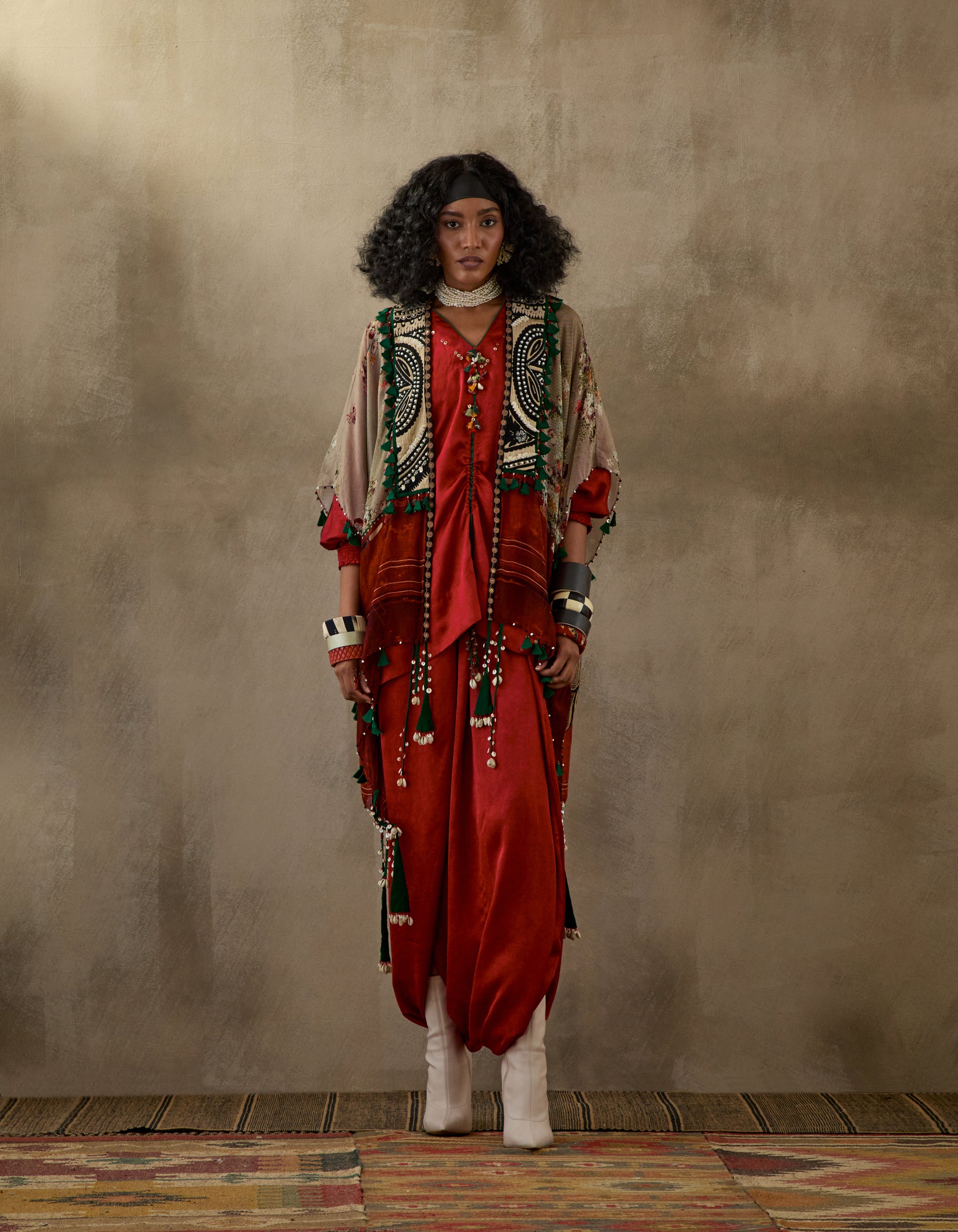 Textured solid-coloured, relaxed-fit short trapeze kurti with inserts, paired with textured solid-coloured draped trousers and an embroidered chevron-printed veni dupatta jacket. The kurti features lace work and tribal tassel details, adding an artisanal touch. The trousers are styled with an elasticated waist for comfort, while the free-size jacket offers a flowy, anti-fit silhouette. The ensemble harmoniously blends contemporary style with traditional craftsmanship, perfect for a relaxed yet sophisticated look.