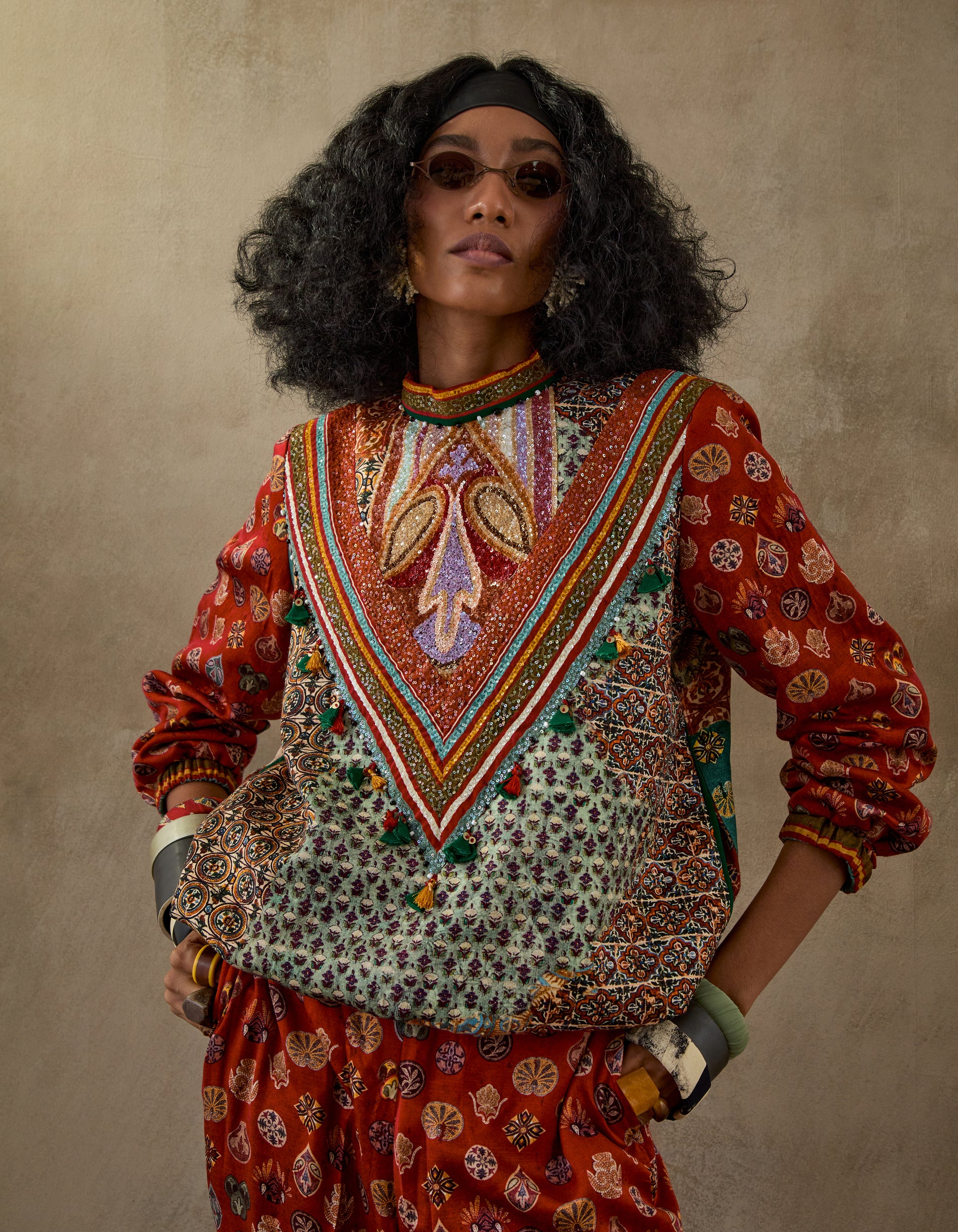 A printed and embroidered sweatshirt adorned with intricate detailing and featuring a sleek metal zip opening at the back, combining modern design with artisanal charm.