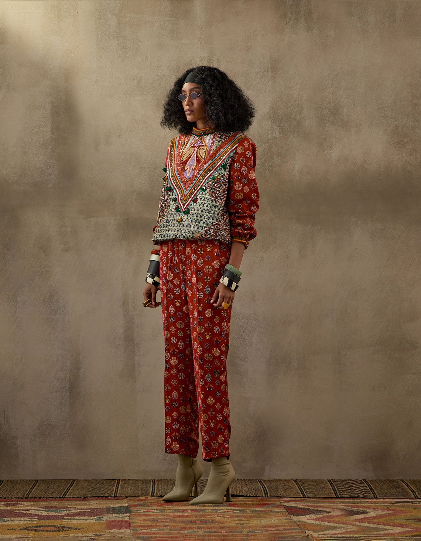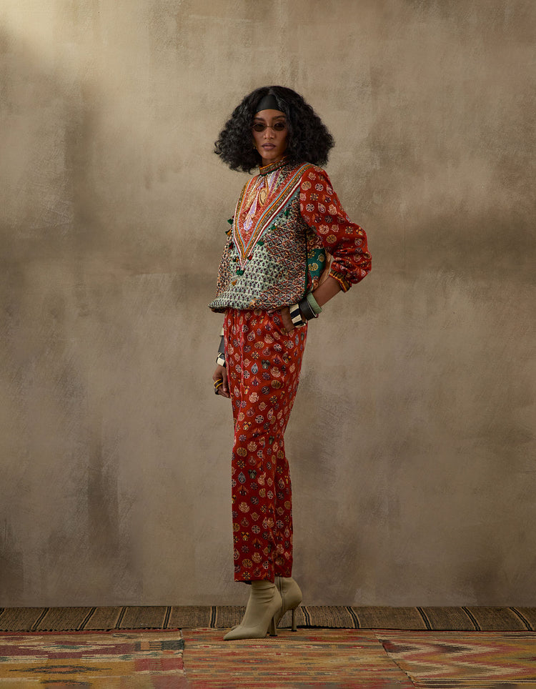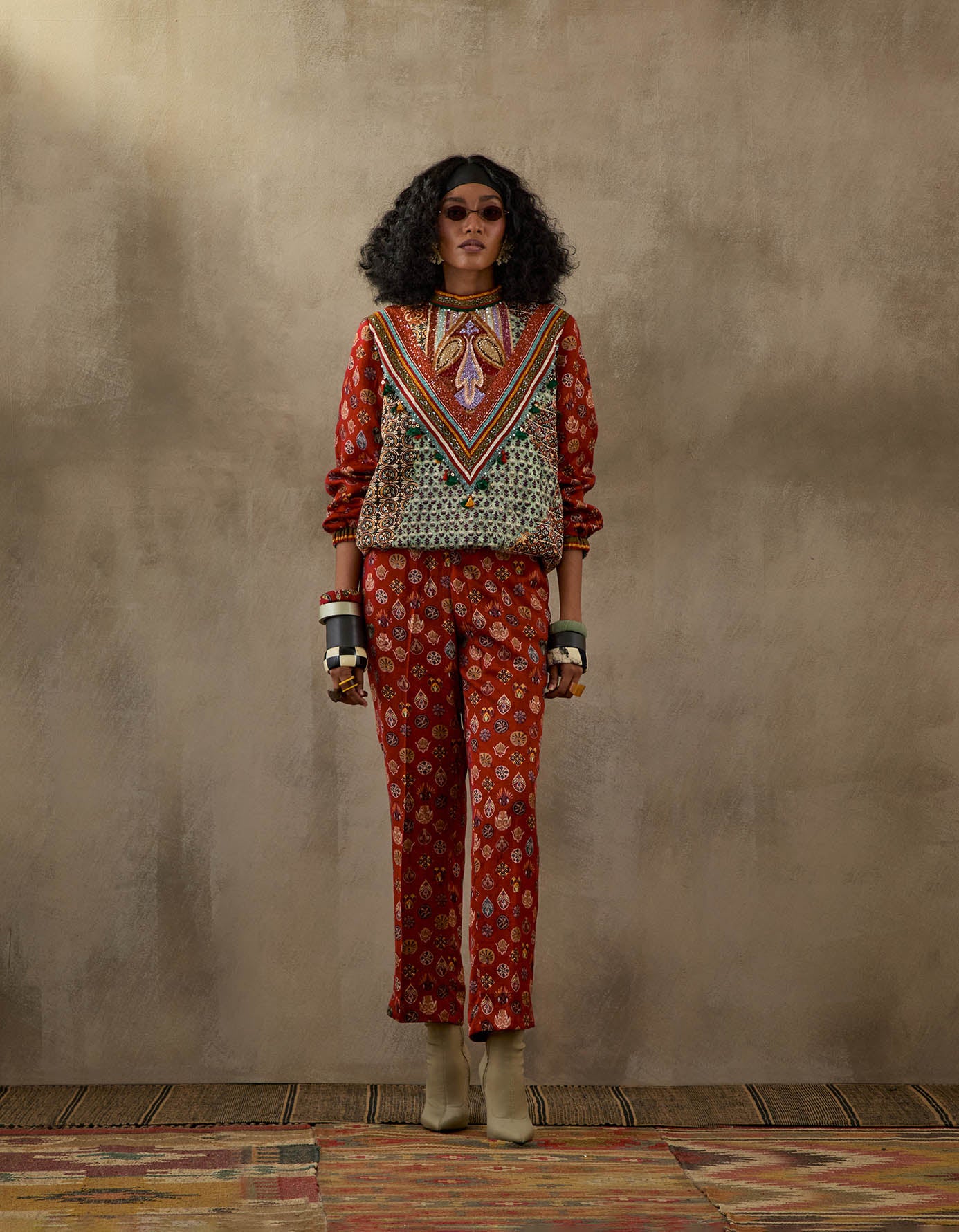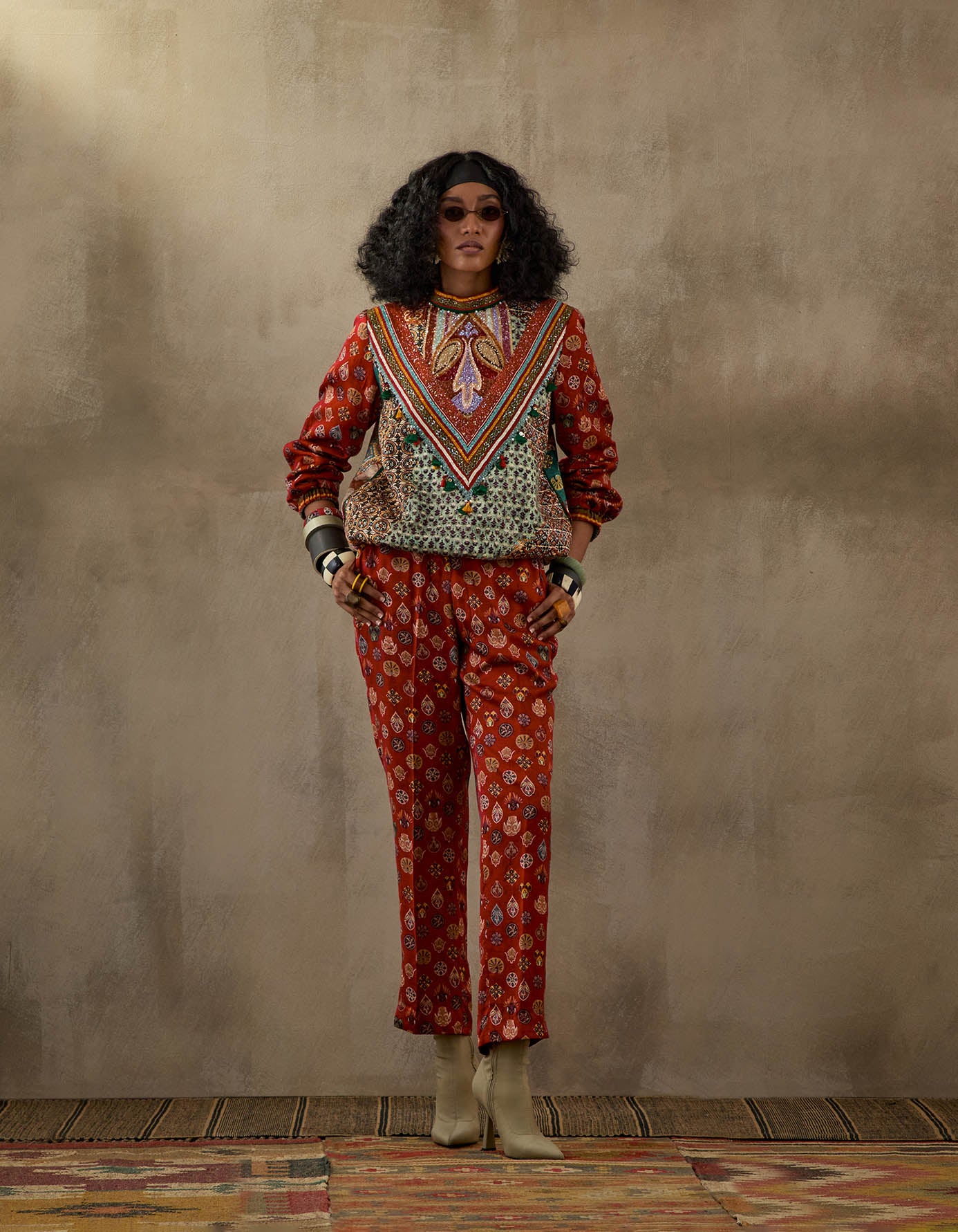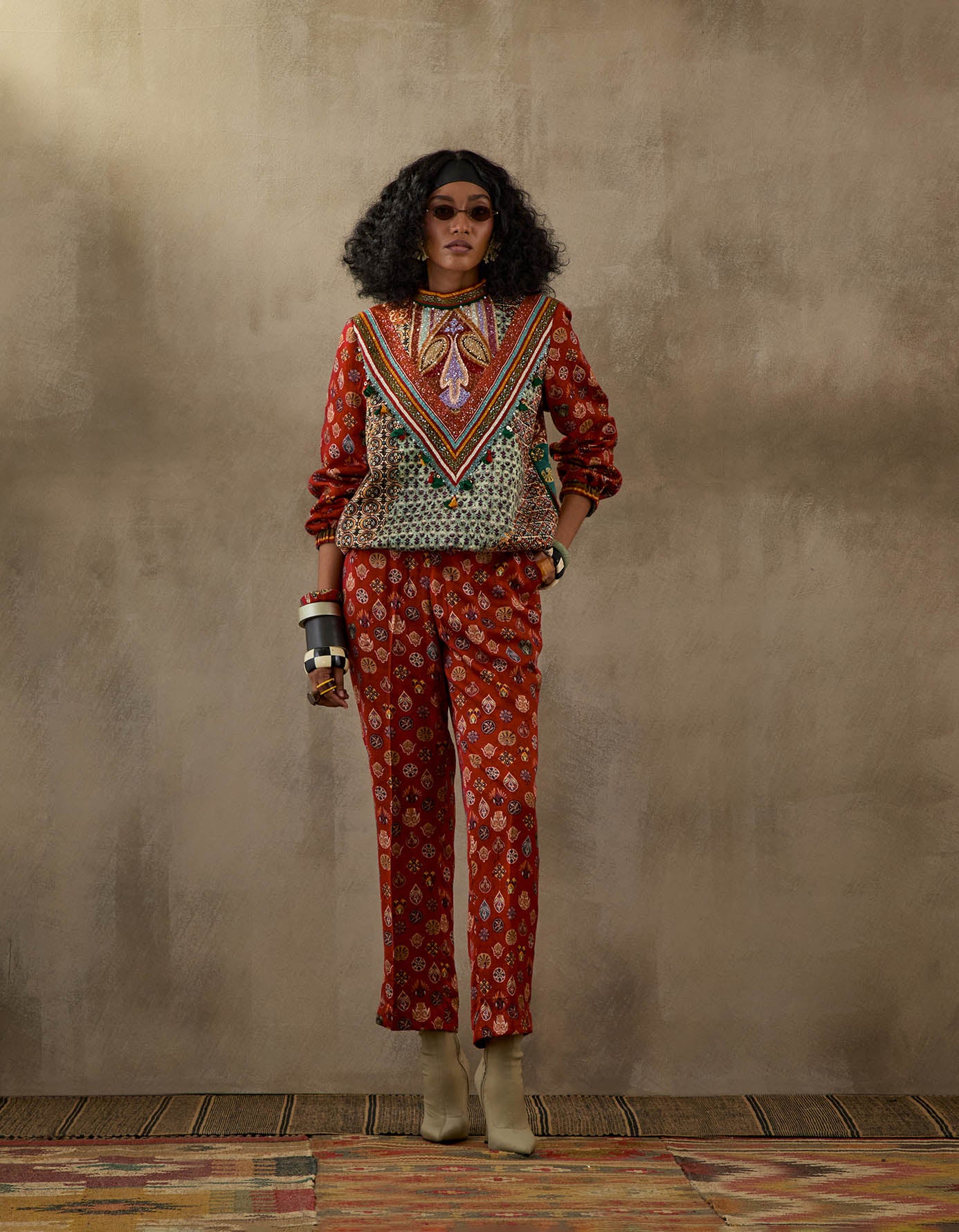 Printed and embroidered sweatshirt with a metal zip opening at the back, paired with printed straight trousers. The design features Resham thread embroidery, cowri shells, beadwork, and thread tassel details. The sweatshirt offers an easy fit with a unique back-opening design, while the trousers are styled for a comfortable straight fit.